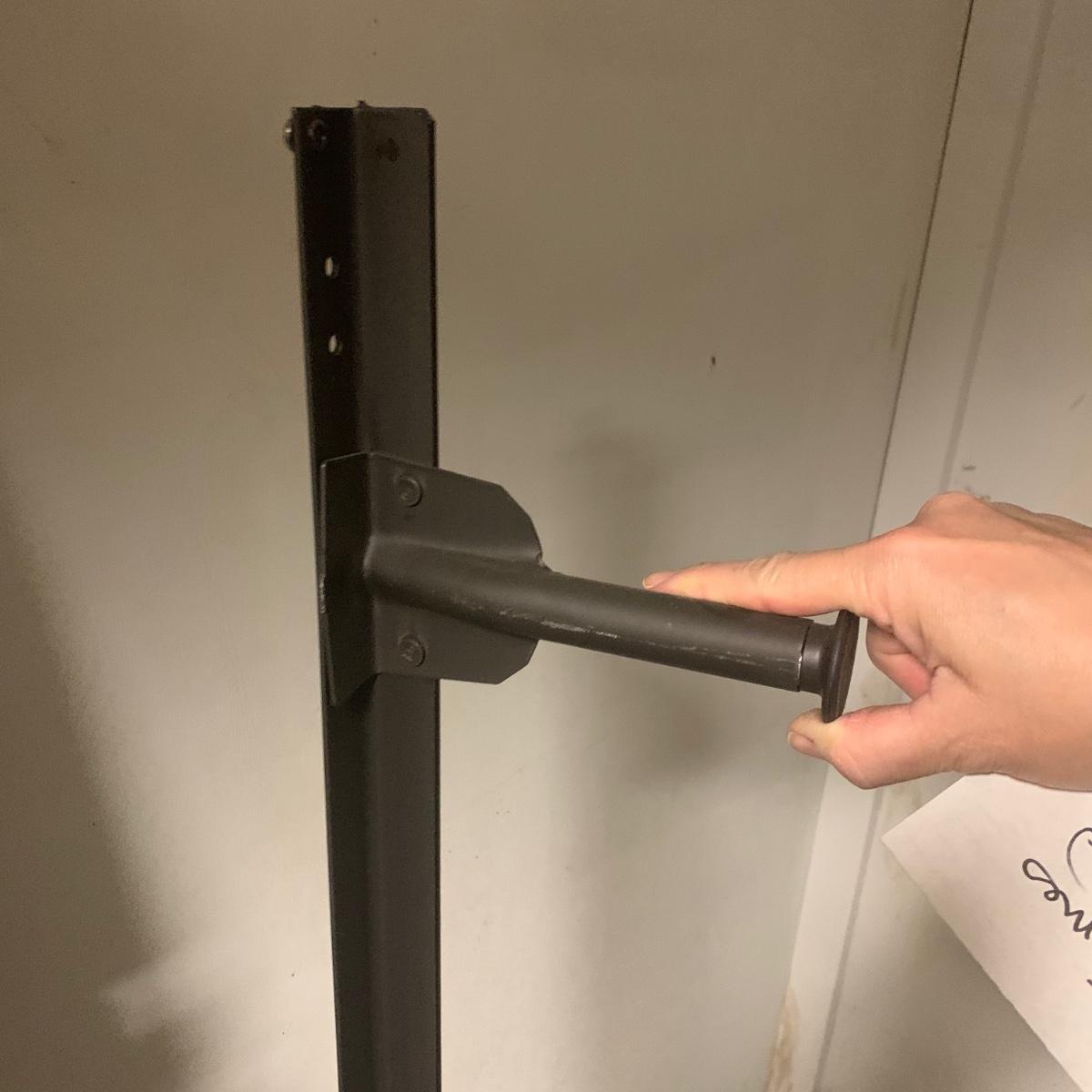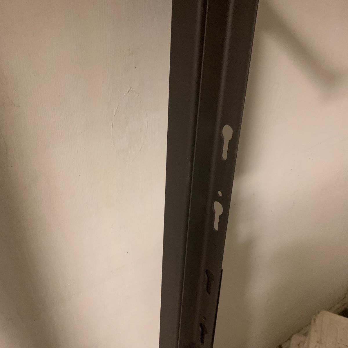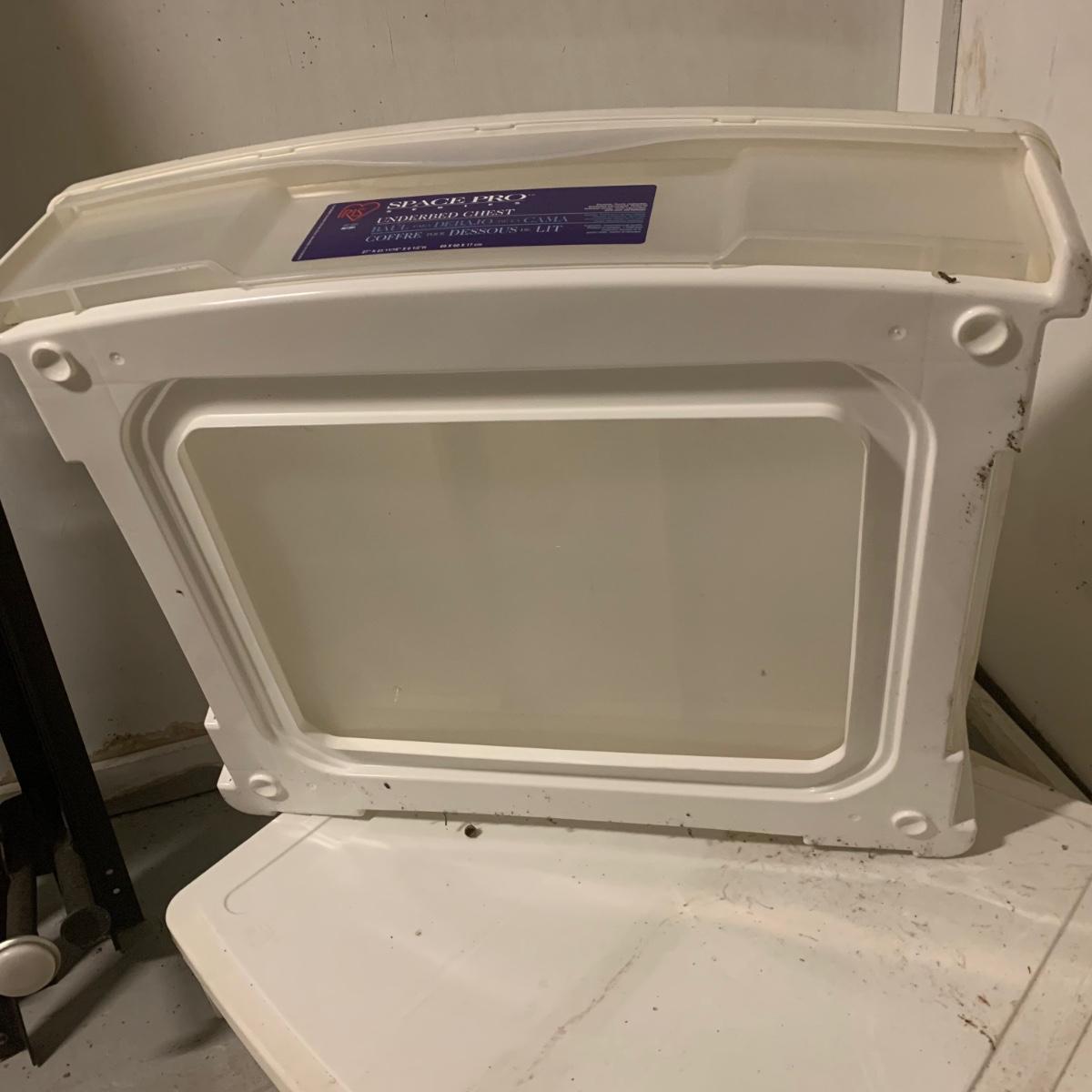 Thea two metal frames appear to be fully intact but were not set up to verify. Both are adjustable and the black one has a center support. The two bins are dirty but in good working order with slide out drawers. Measurement in pix of label. Local pick up only.