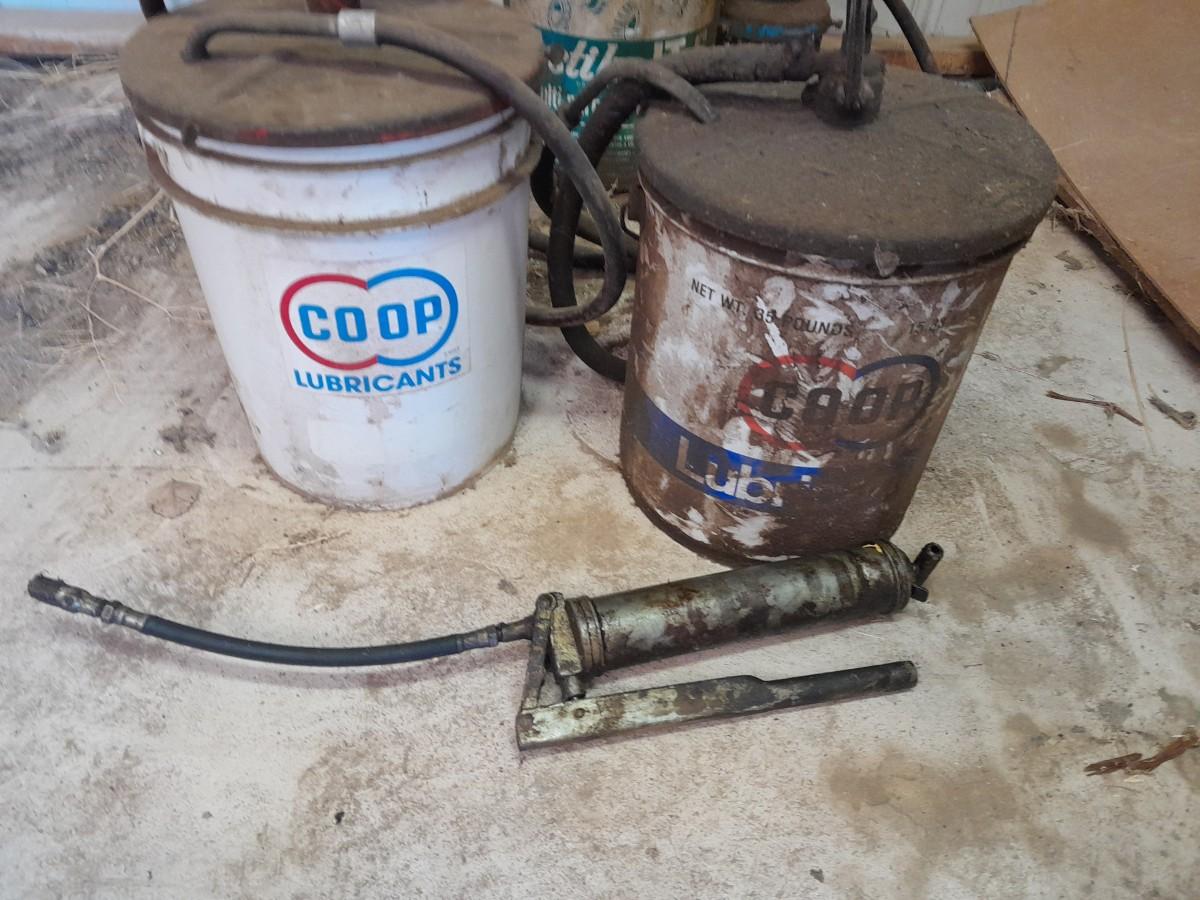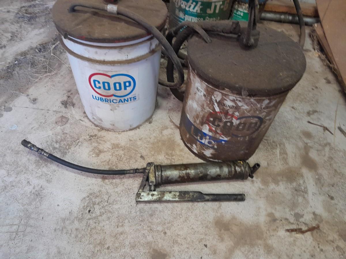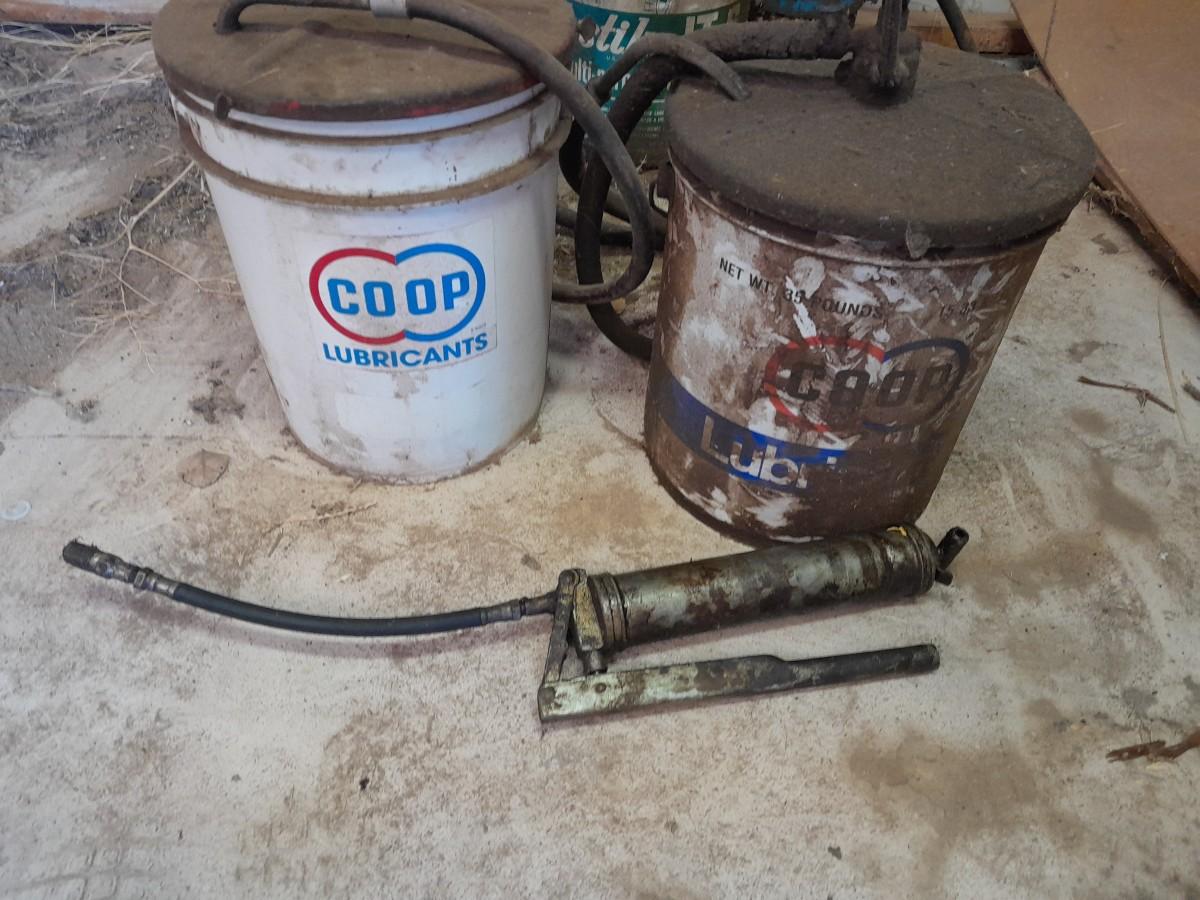 TWO METAL BUCKETS WITH COOP LUBERCANTS PARTIALLY FULL, WITH A GREASE GUN.
