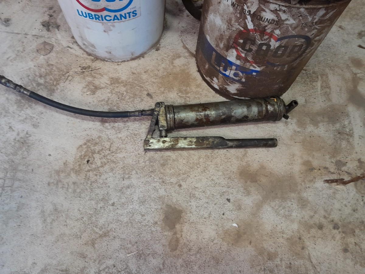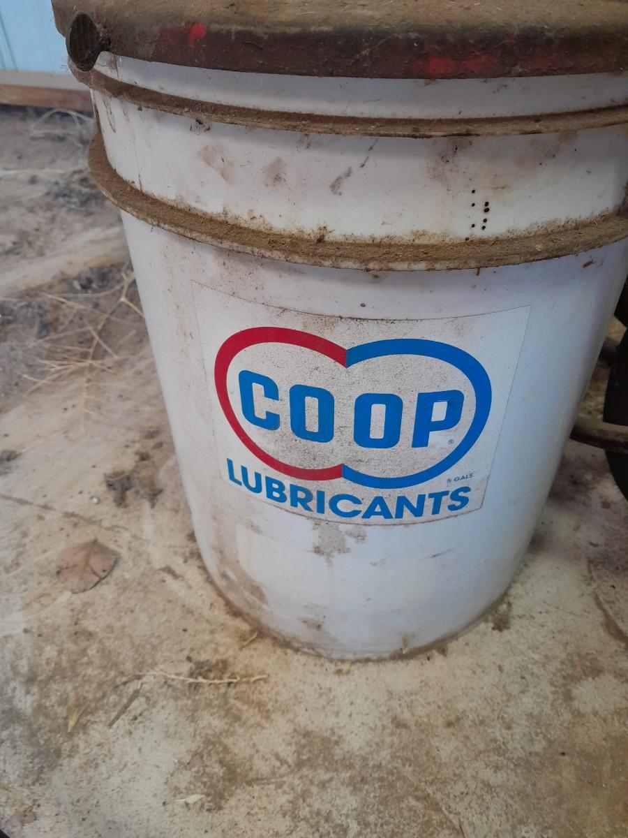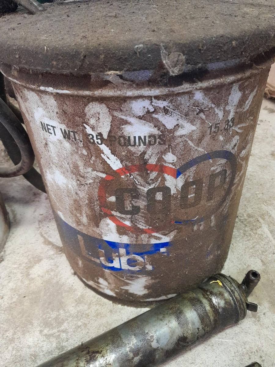 TWO METAL BUCKETS WITH COOP LUBERCANTS PARTIALLY FULL, WITH A GREASE GUN.