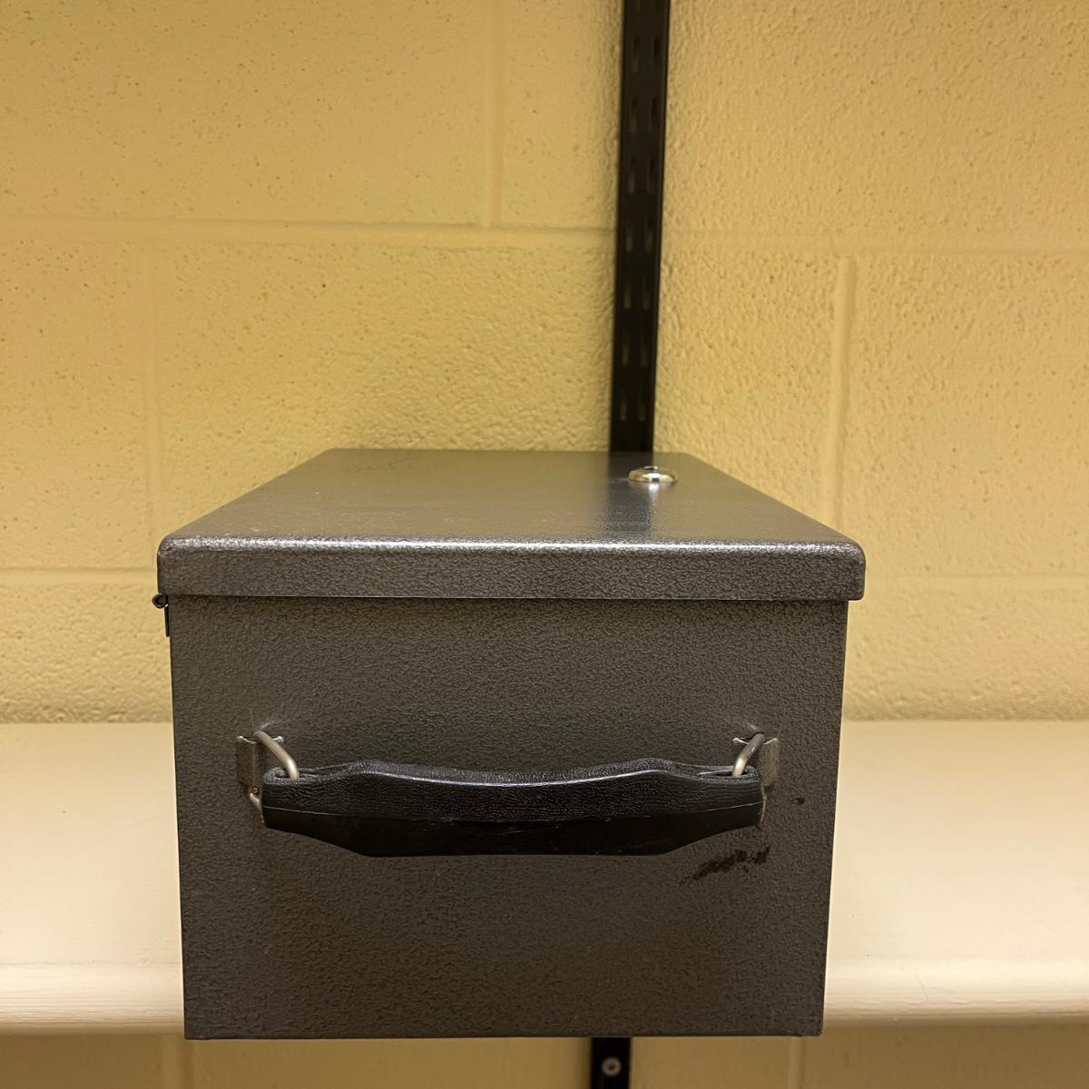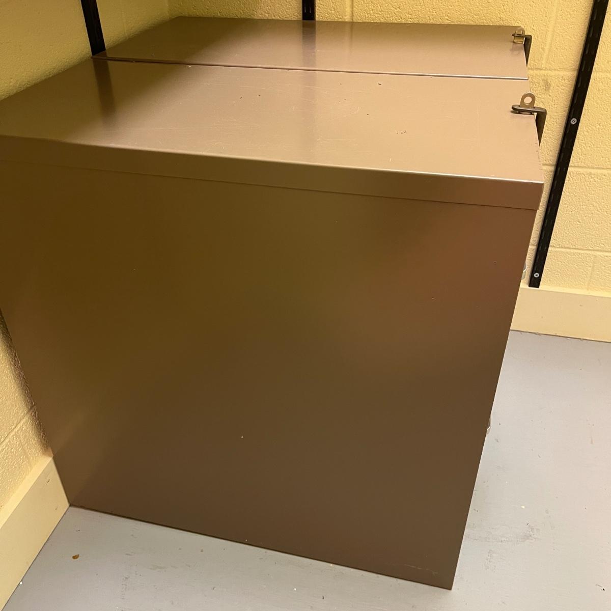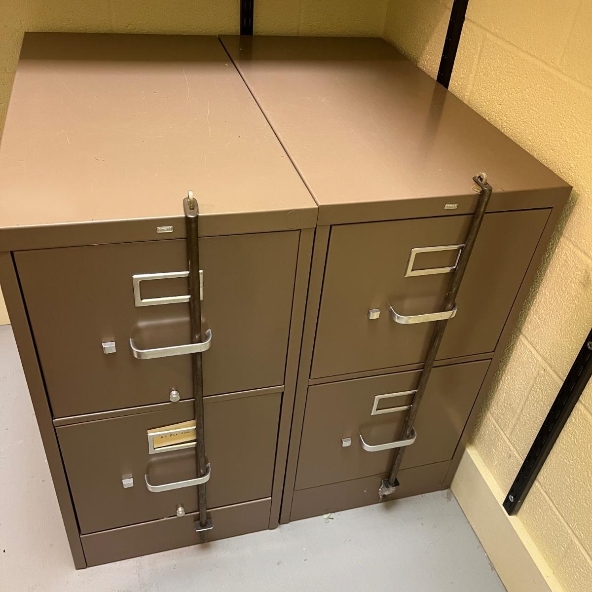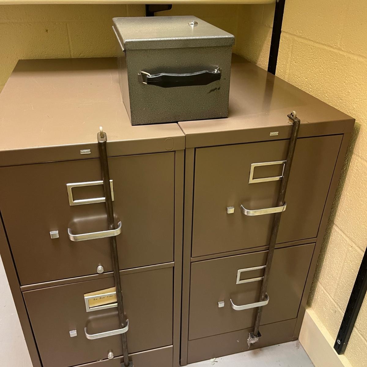 Lot includes two metal two drawer filing cabinets with steel bar for locking. Also includes lockbox that is missing key. Cabinets measure 15” x 28” x 29”H.