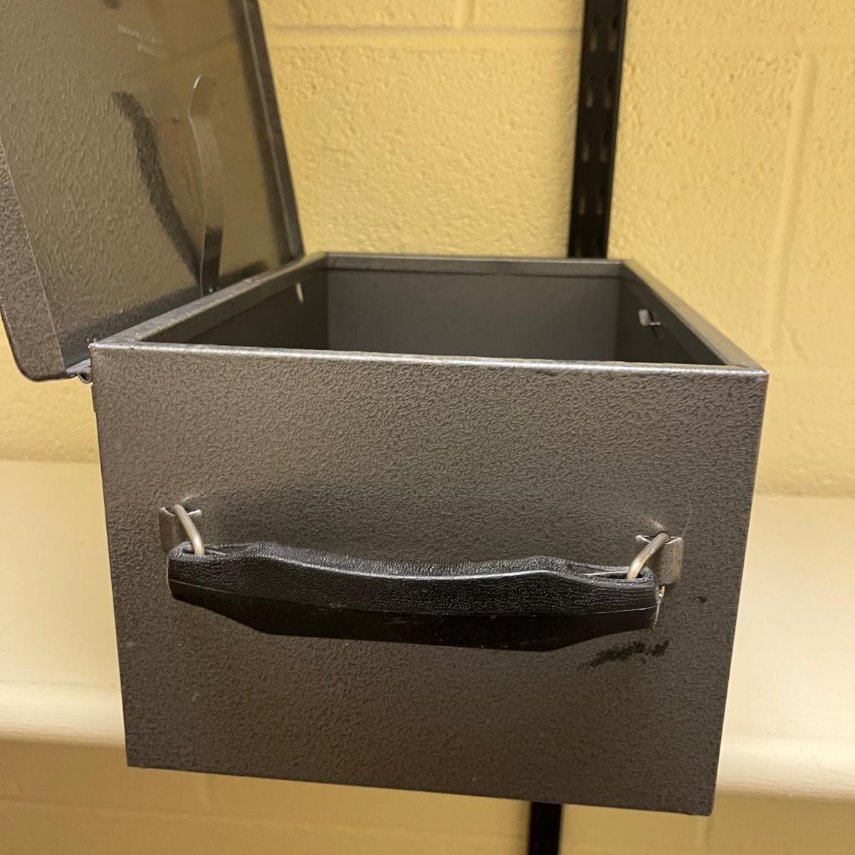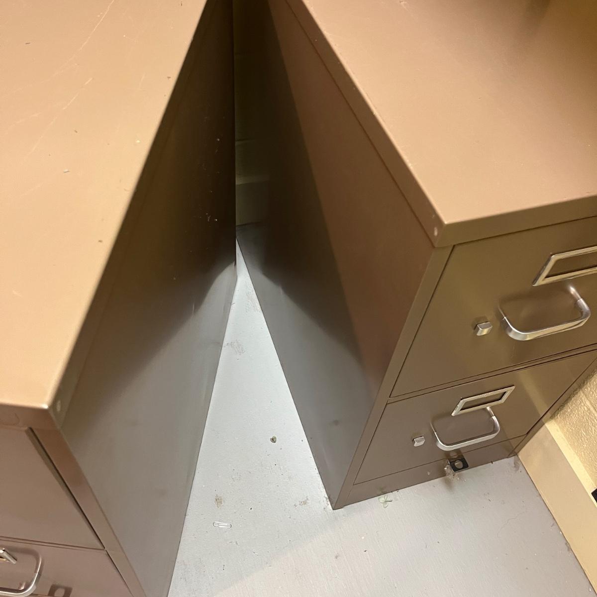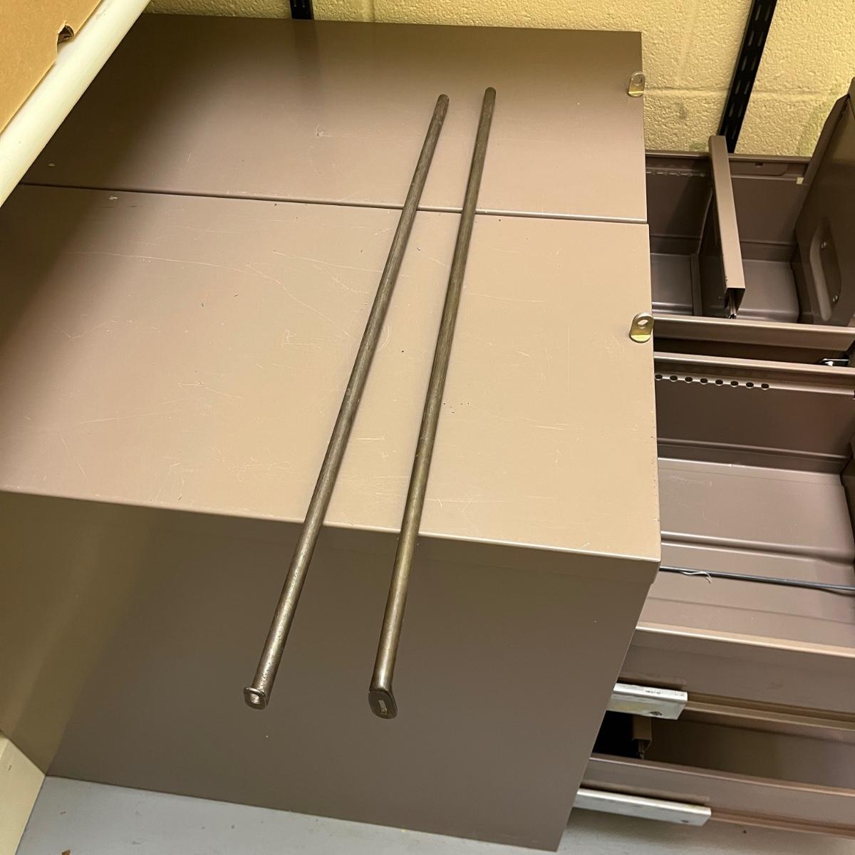Lot includes two metal two drawer filing cabinets with steel bar for locking. Also includes lockbox that is missing key. Cabinets measure 15” x 28” x 29”H.