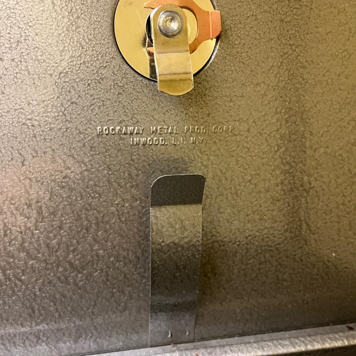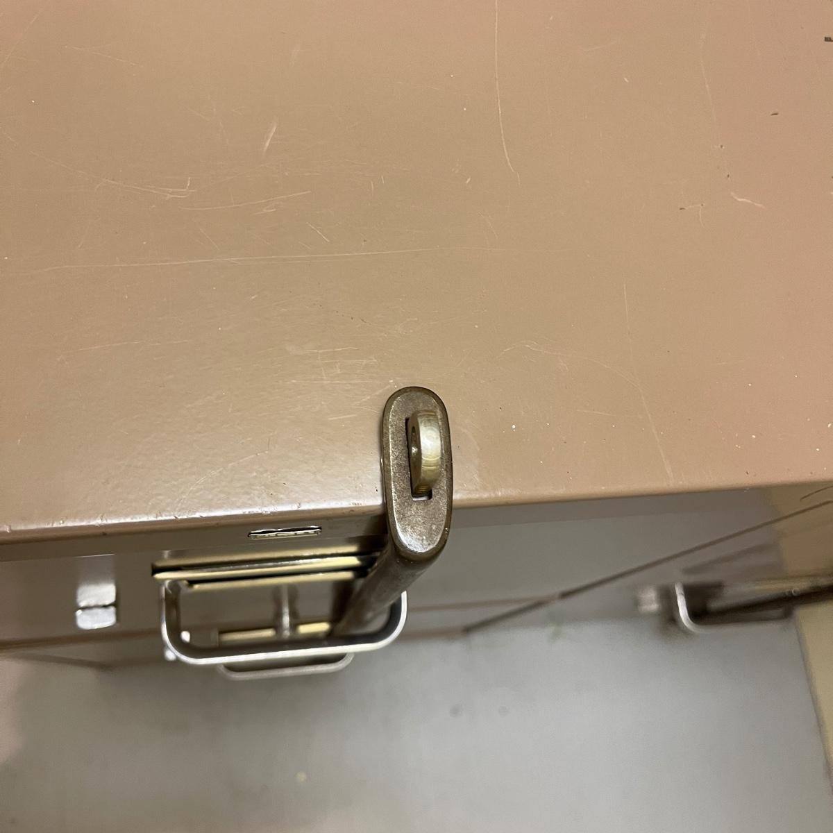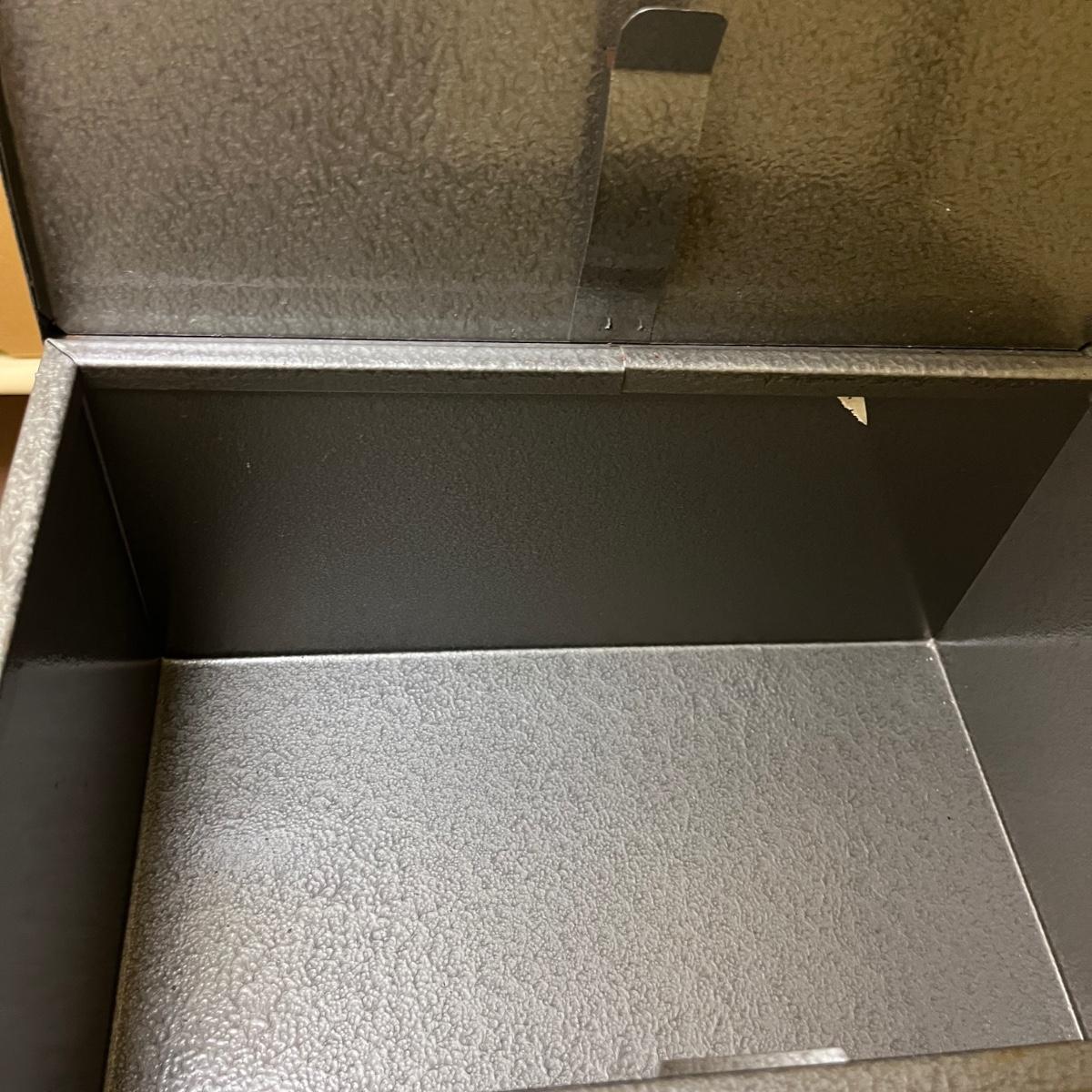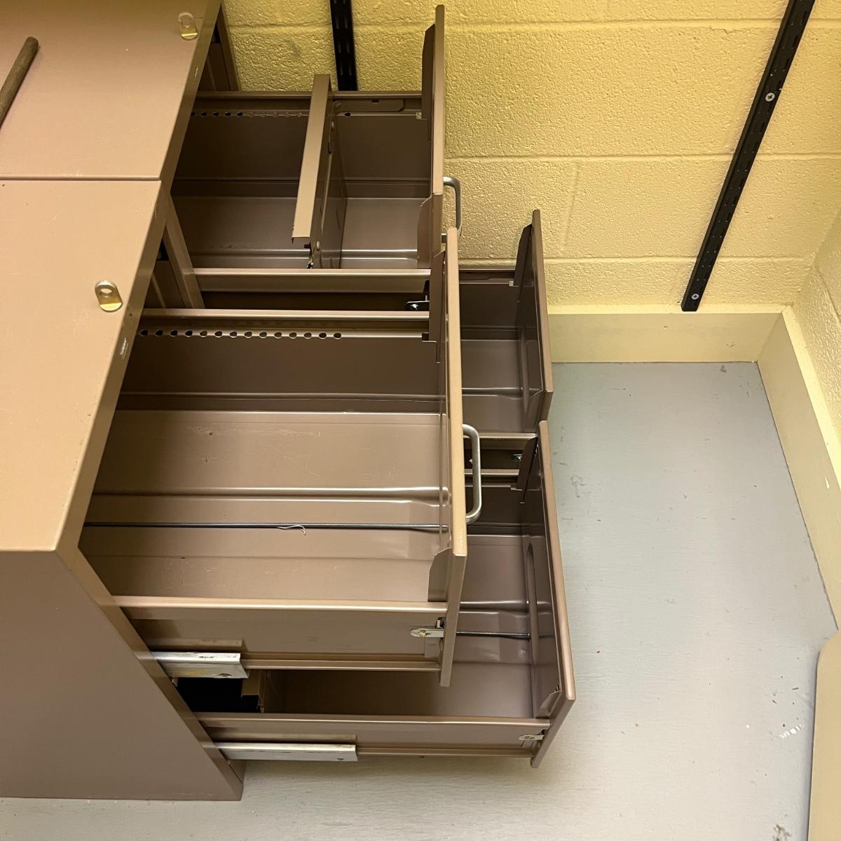 Lot includes two metal two drawer filing cabinets with steel bar for locking. Also includes lockbox that is missing key. Cabinets measure 15” x 28” x 29”H.