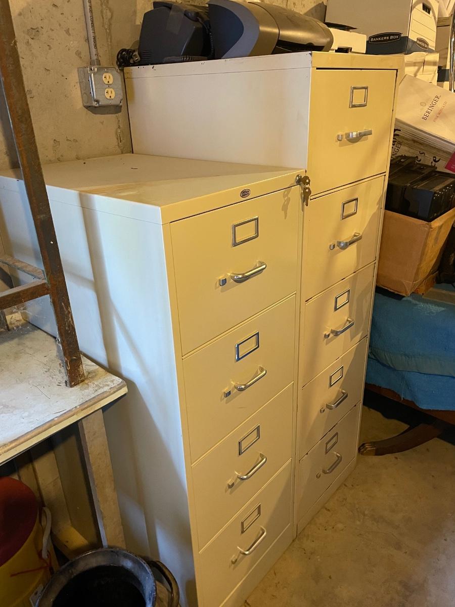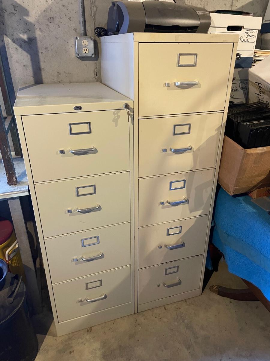 Two Metal Filing Cabinets. Good Condition! Measures 18w x 27d x 51h and 18w x 27d x 60h