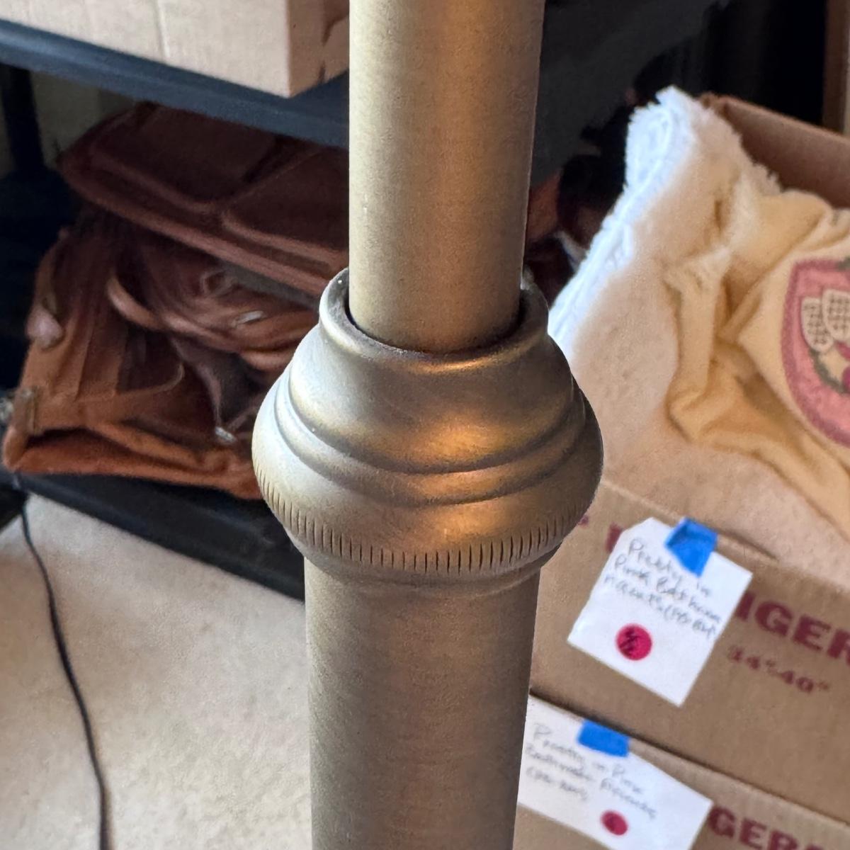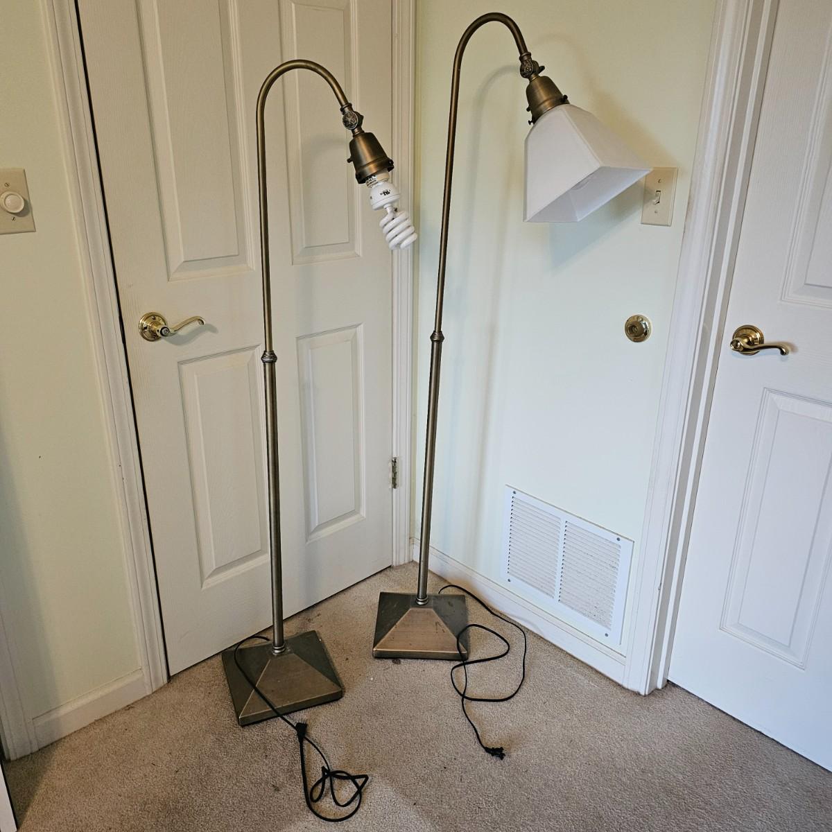 This lot includes two large metal floor lamps that are adjustable in height. One of the lights is missing its shade. Both powered on when plugged in - see pictures included. The lamps measure 16” x 11” x 62”H at its tallest and 56”H at its lowest. Local pickup only.