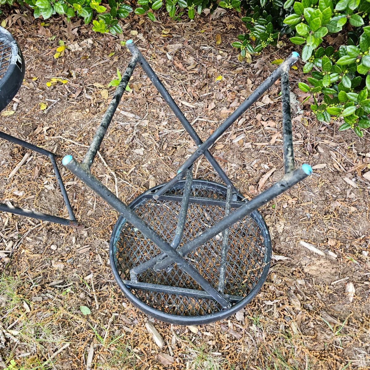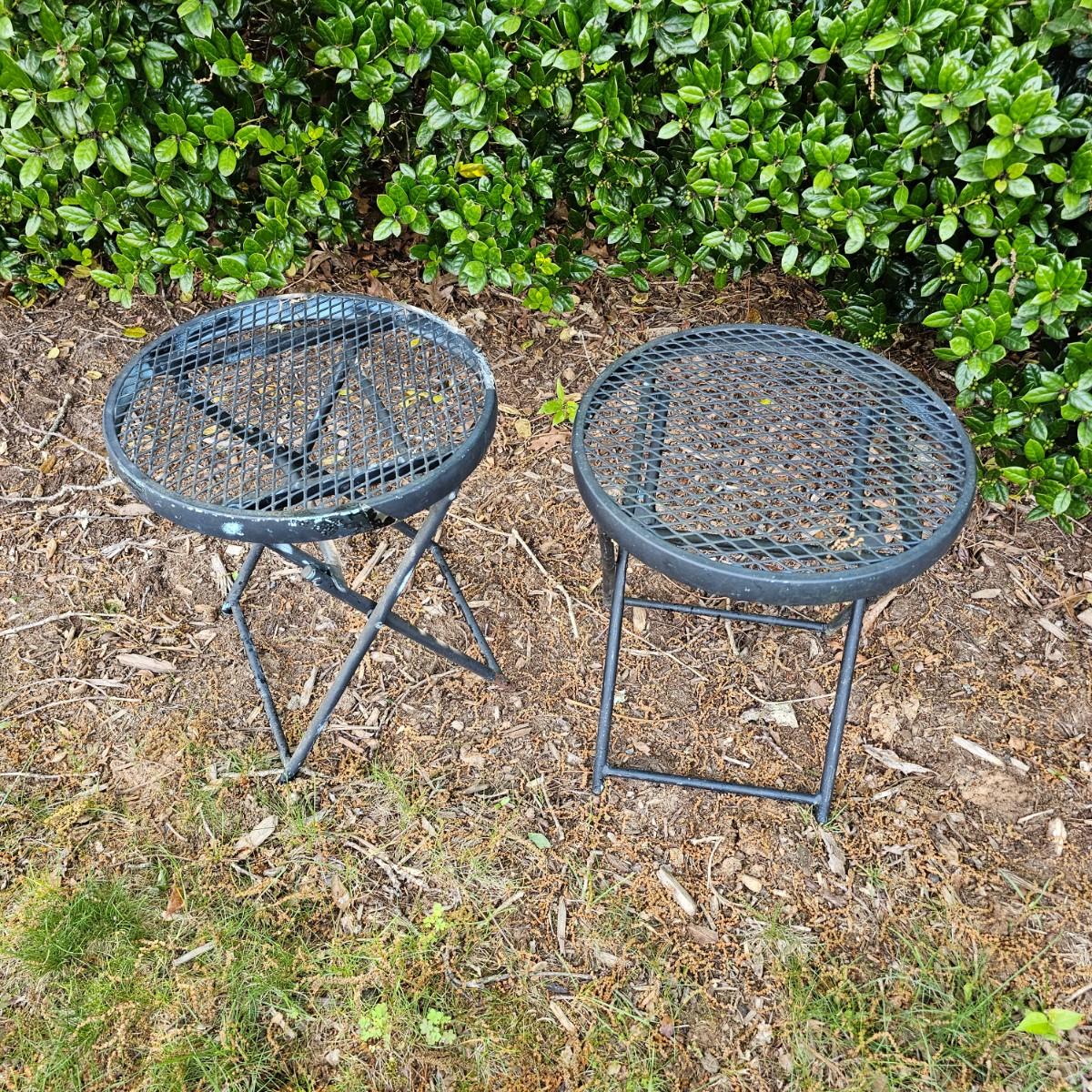 A pair of black round folding tables for yard or deck use. Expanded metal tops and round metal legs. Tables are 16"D x 17"H, fold to 3" Flat. Some tape residue and rust on top edges and legs, see photos for details. Local pickup only.