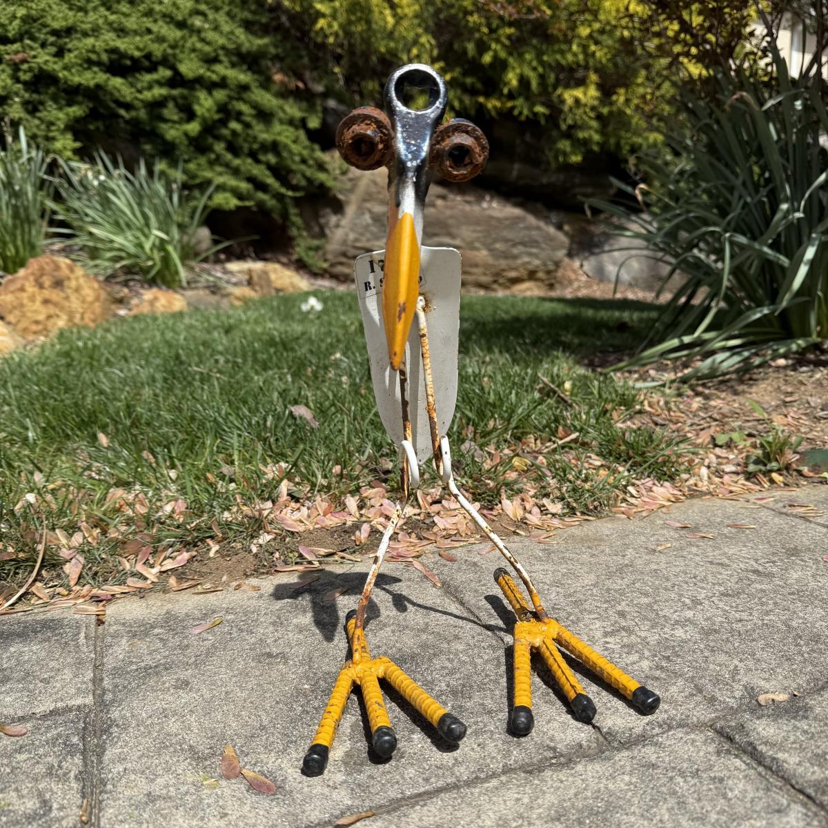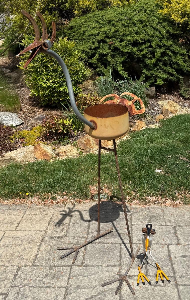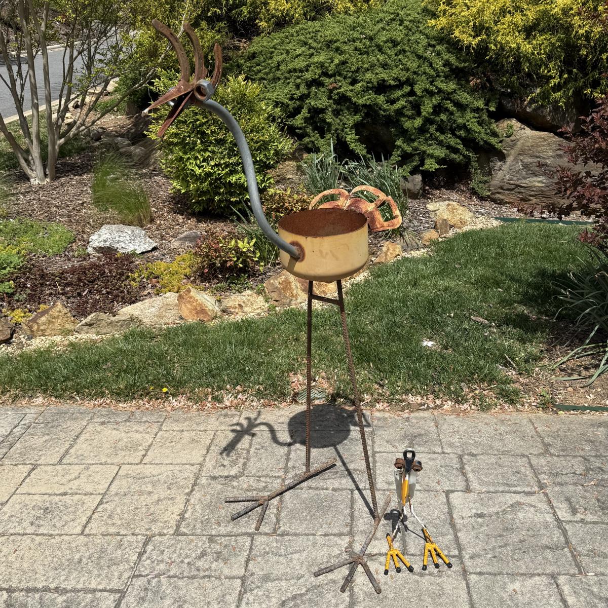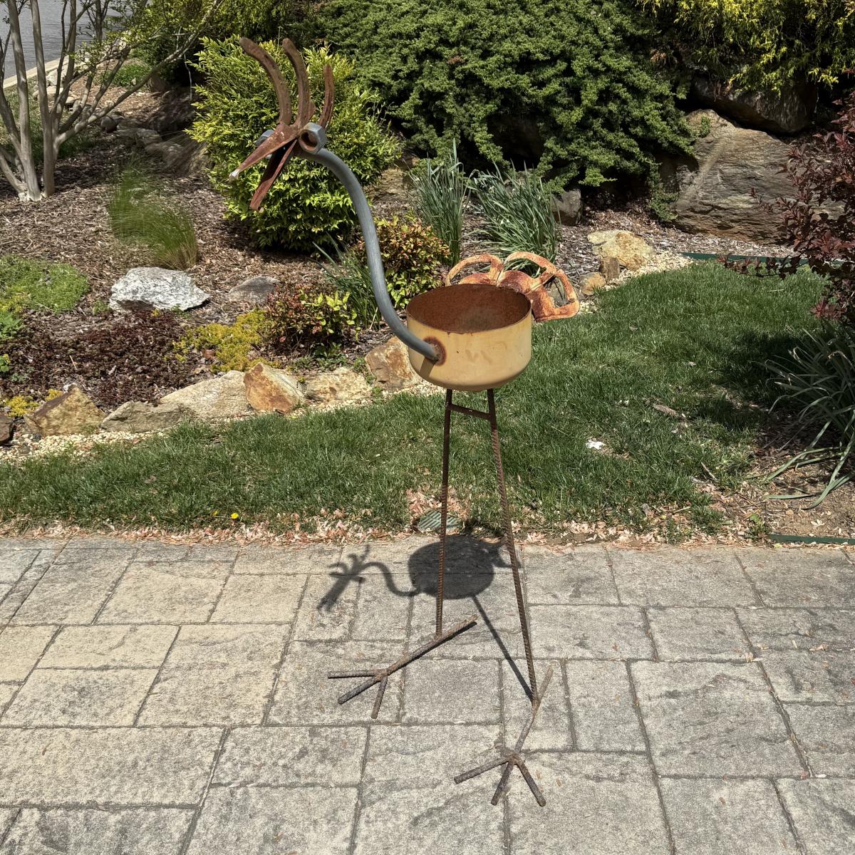 Two funky welded metal bird sculptures to add some fun to your yard or garden! Both have some rebar components. The body of the small bird is a trowel. The tall bird’s head feathers appear to be parts of horseshoes. Both have a bit of rust. The larger bird measures approximately 25” (at its widest point) x 28” x 56”H.