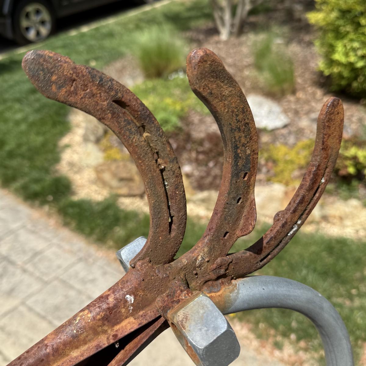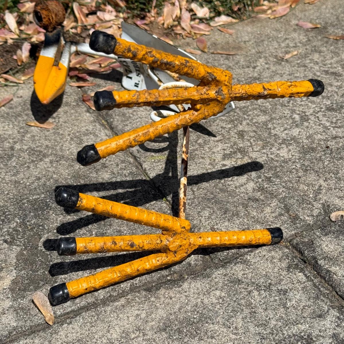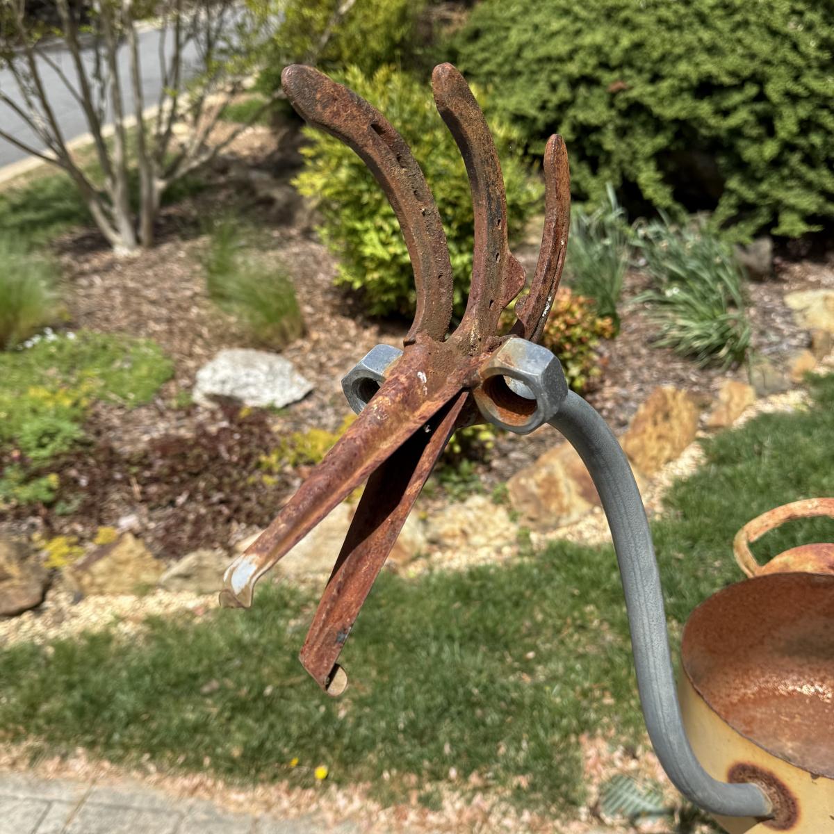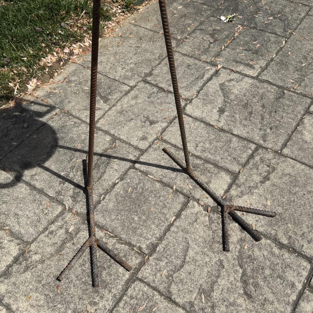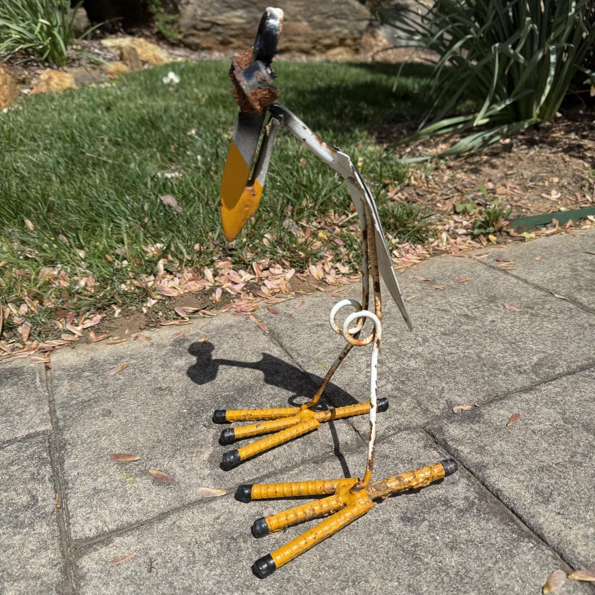 Two funky welded metal bird sculptures to add some fun to your yard or garden! Both have some rebar components. The body of the small bird is a trowel. The tall bird’s head feathers appear to be parts of horseshoes. Both have a bit of rust. The larger bird measures approximately 25” (at its widest point) x 28” x 56”H.