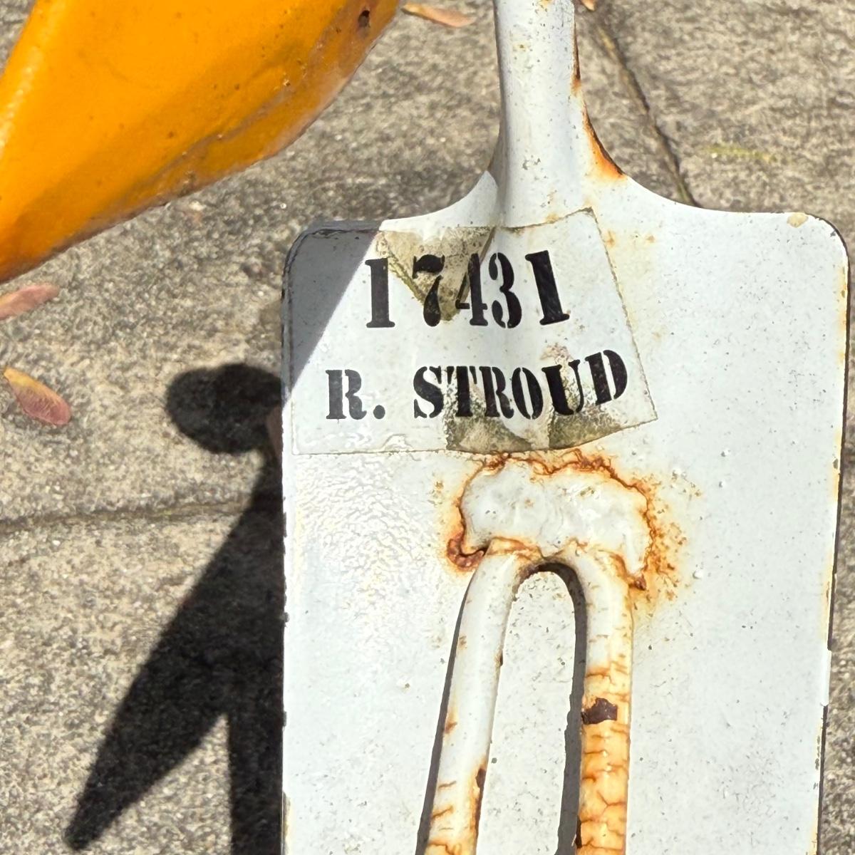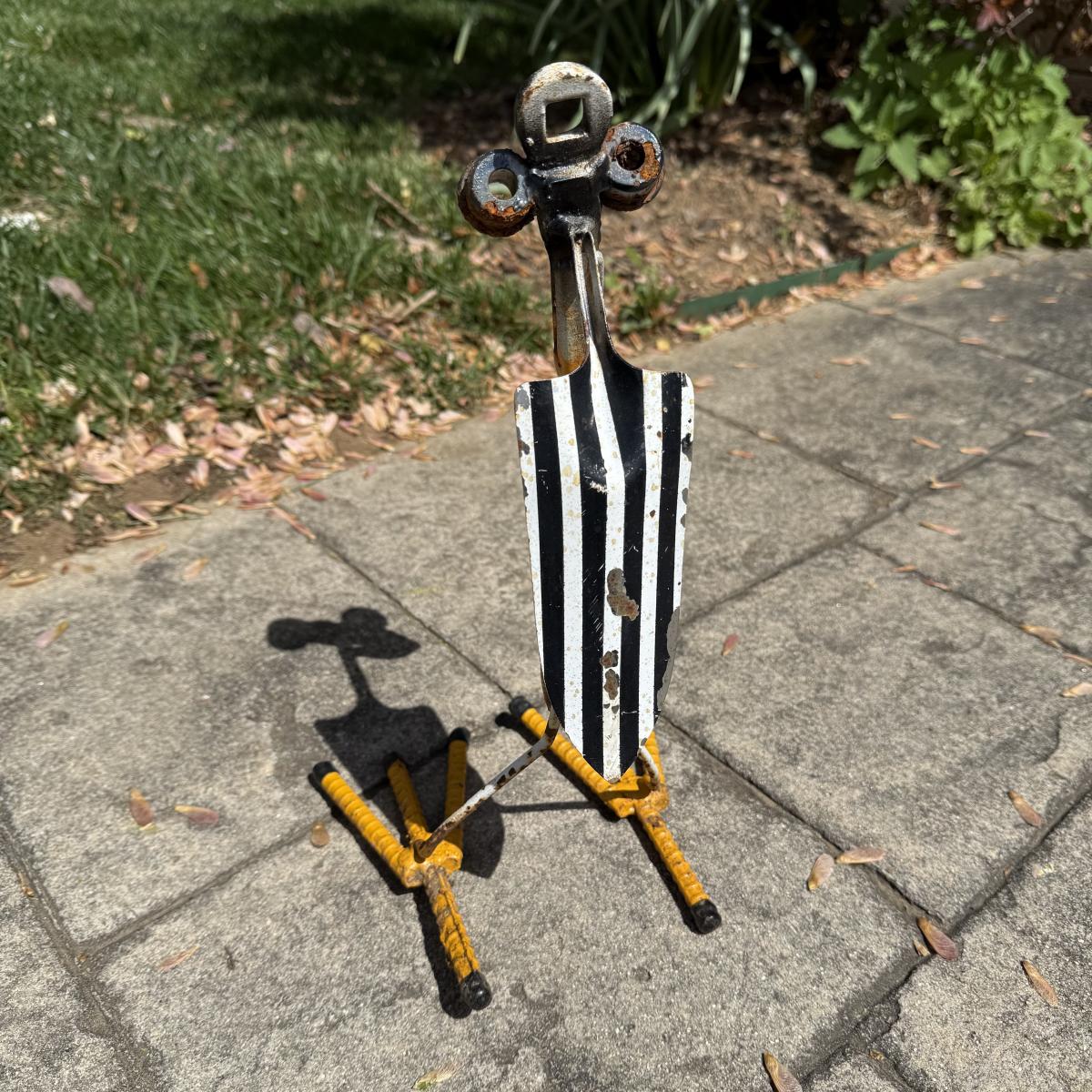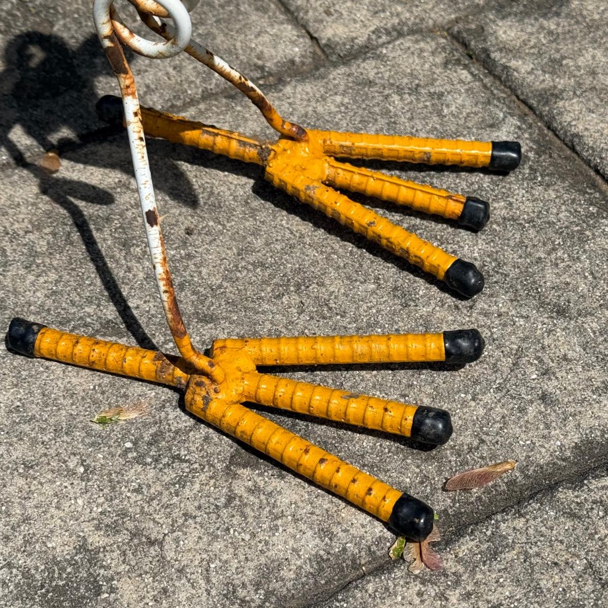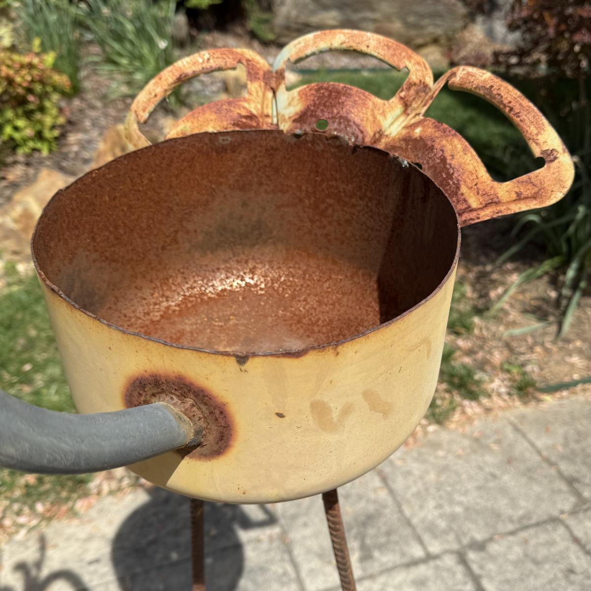 Two funky welded metal bird sculptures to add some fun to your yard or garden! Both have some rebar components. The body of the small bird is a trowel. The tall bird’s head feathers appear to be parts of horseshoes. Both have a bit of rust. The larger bird measures approximately 25” (at its widest point) x 28” x 56”H.