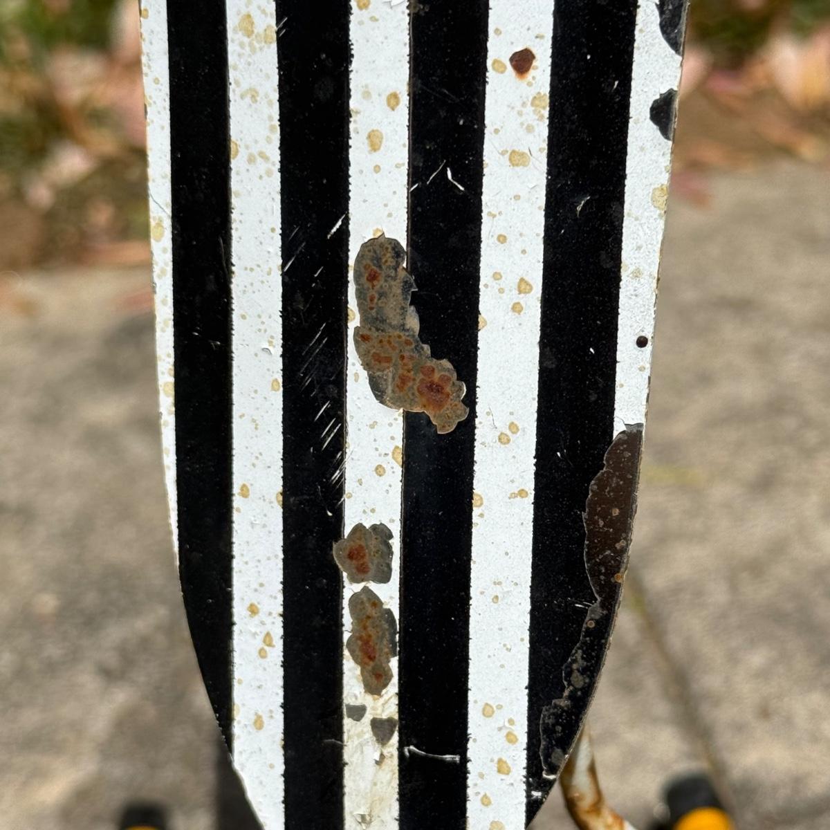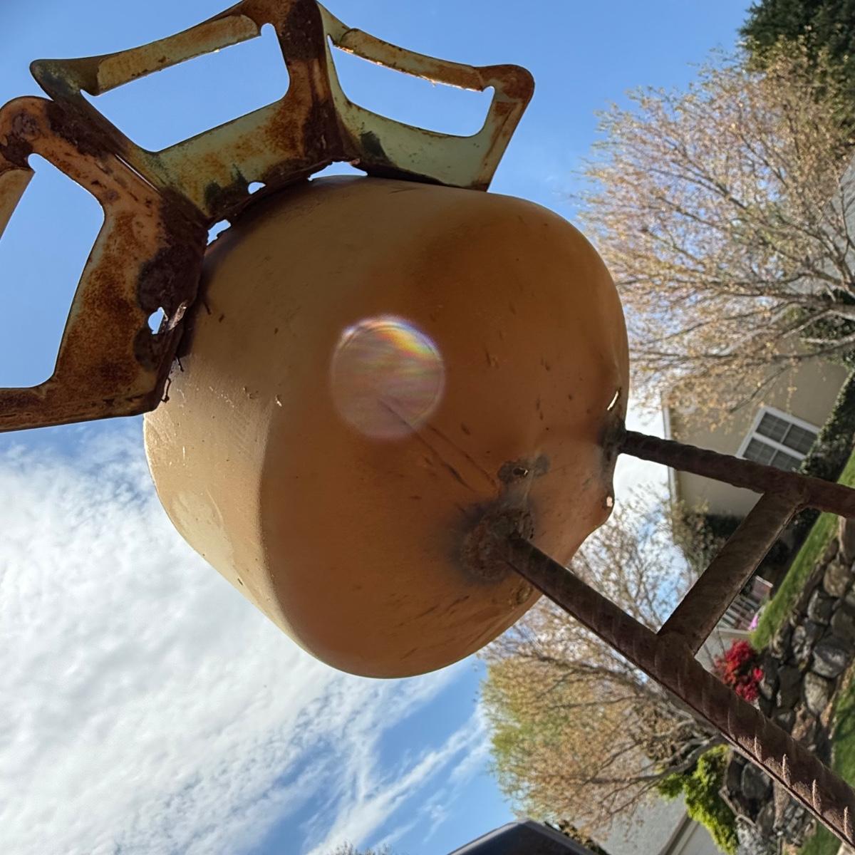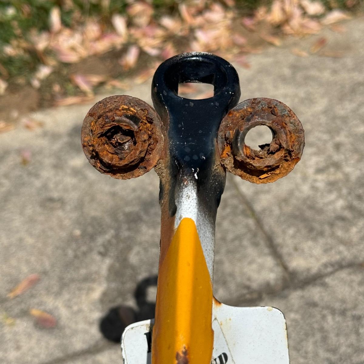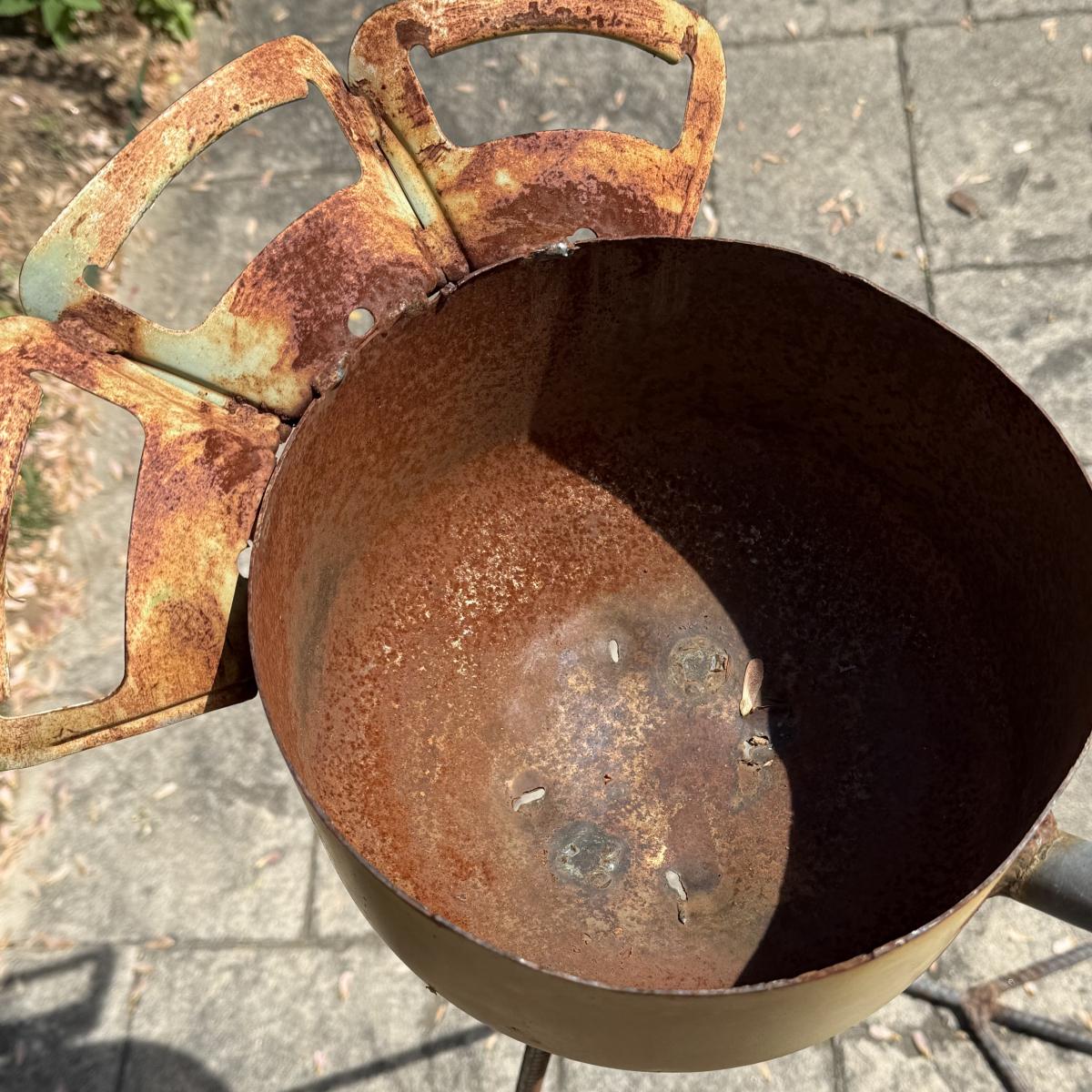 Two funky welded metal bird sculptures to add some fun to your yard or garden! Both have some rebar components. The body of the small bird is a trowel. The tall bird’s head feathers appear to be parts of horseshoes. Both have a bit of rust. The larger bird measures approximately 25” (at its widest point) x 28” x 56”H.