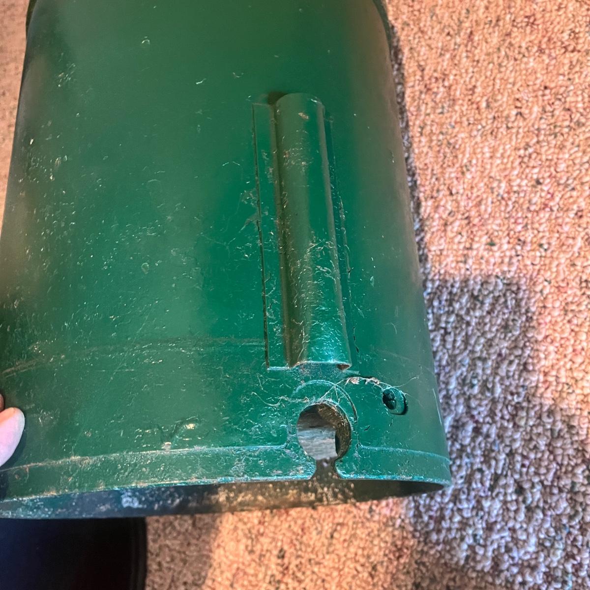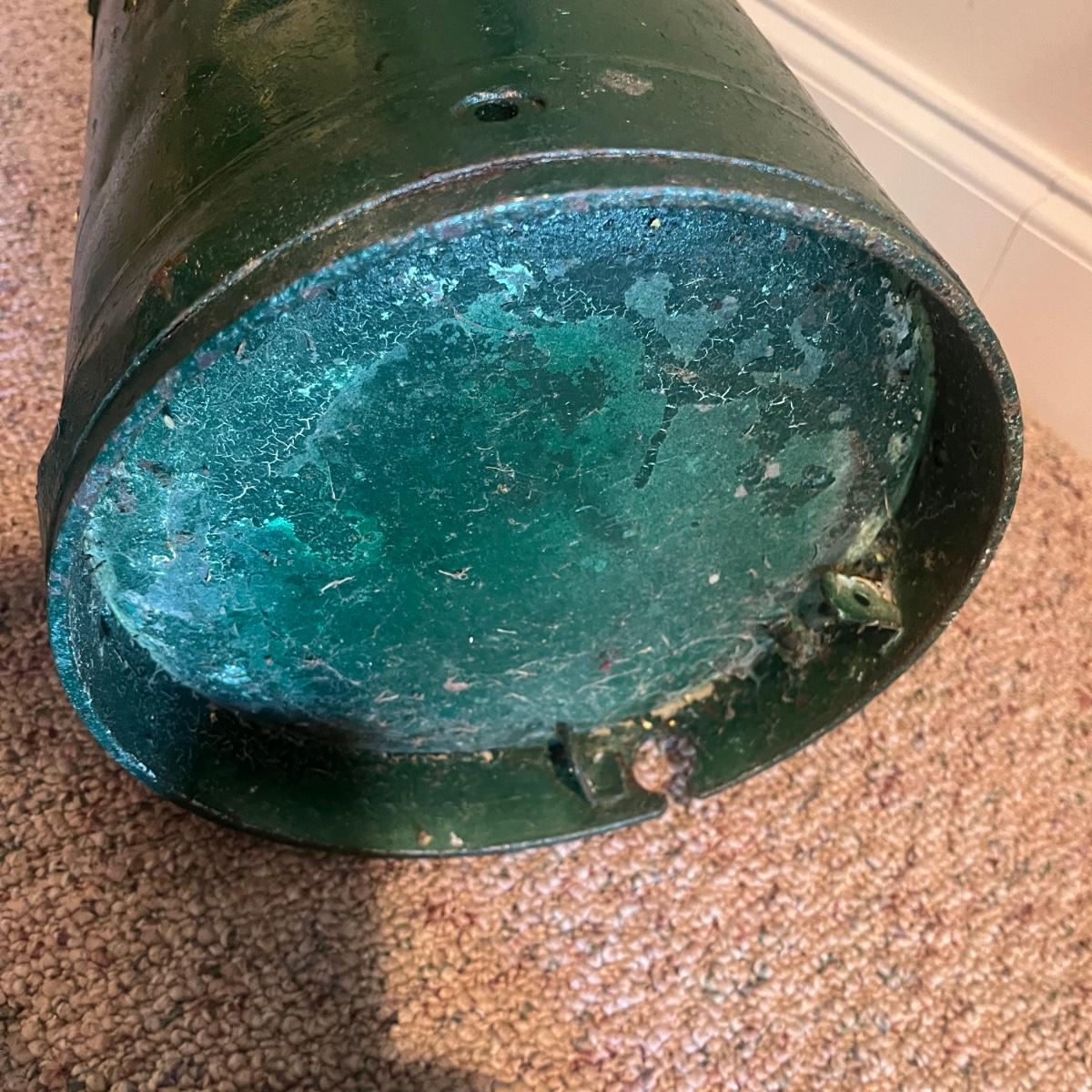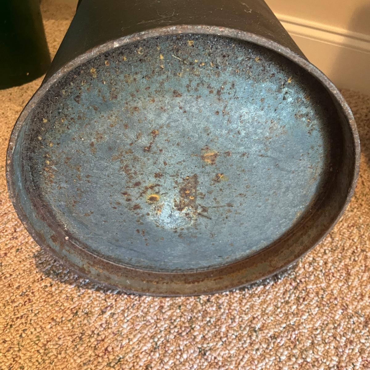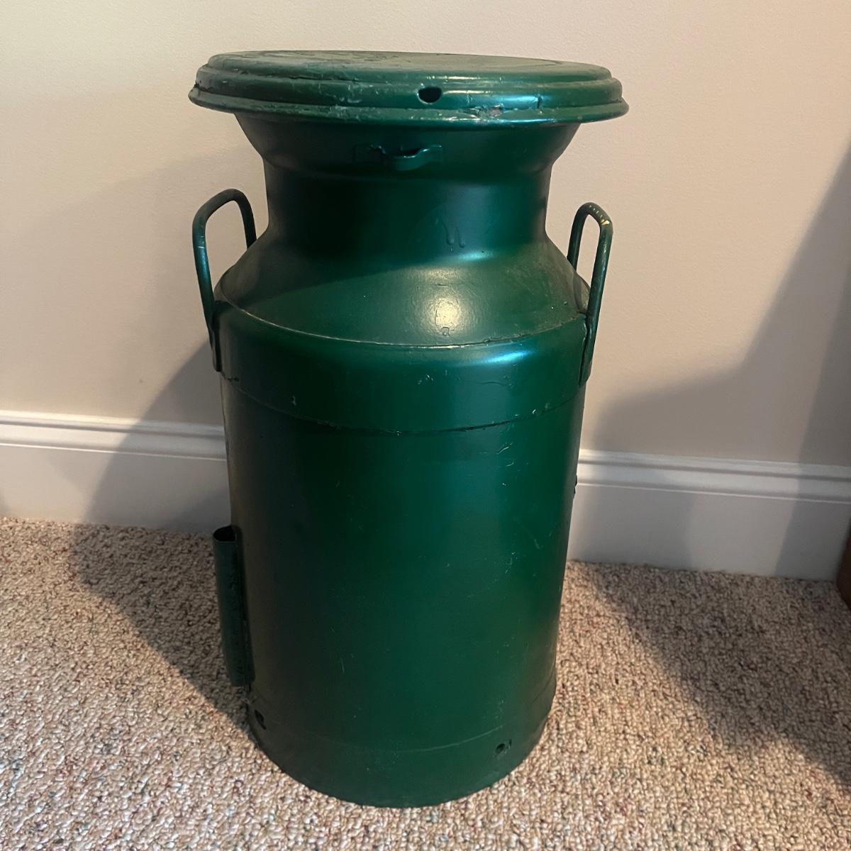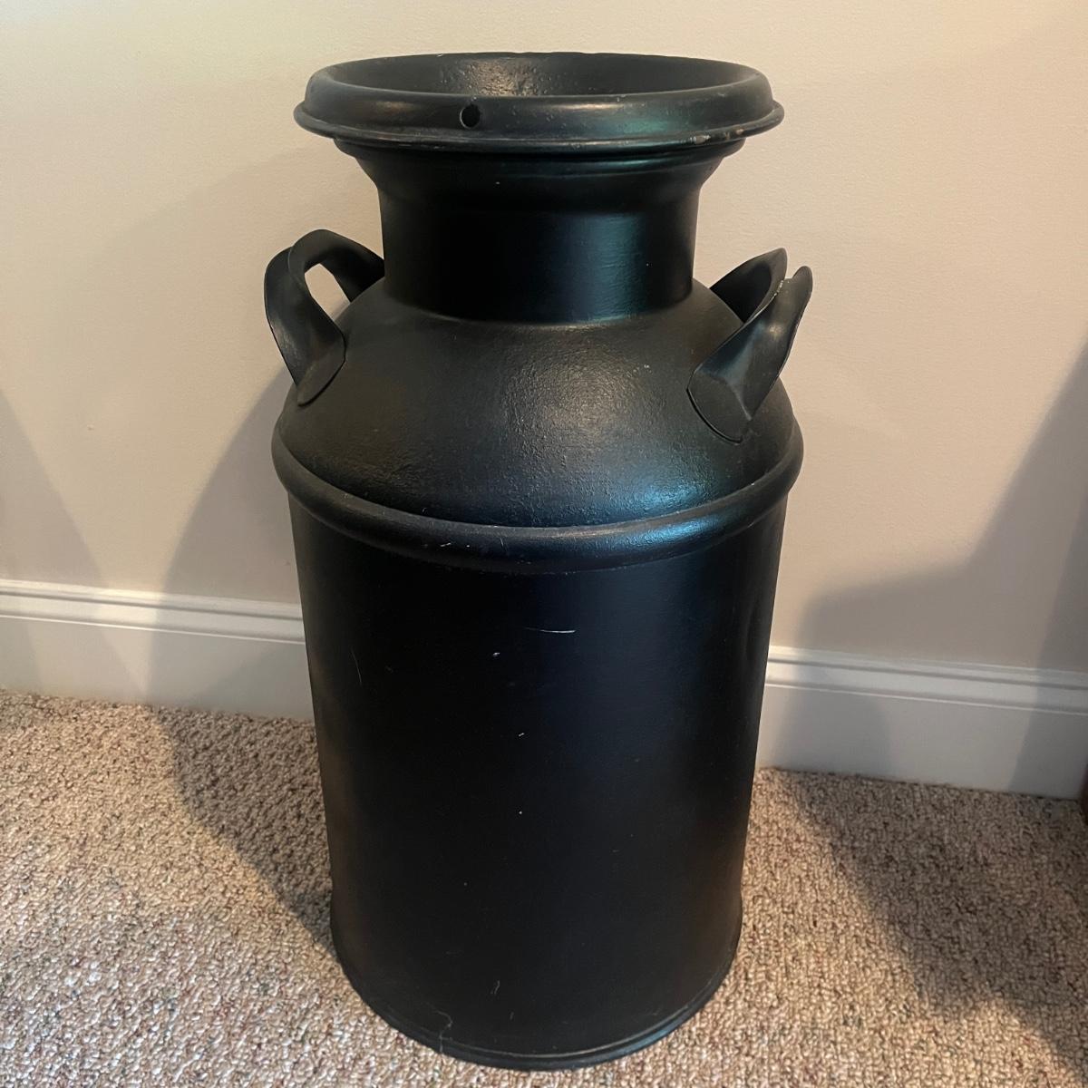 Lot includes a black painted milk can and a green painted milk can, both with lids. Largest can measures 13"D x 25"H.