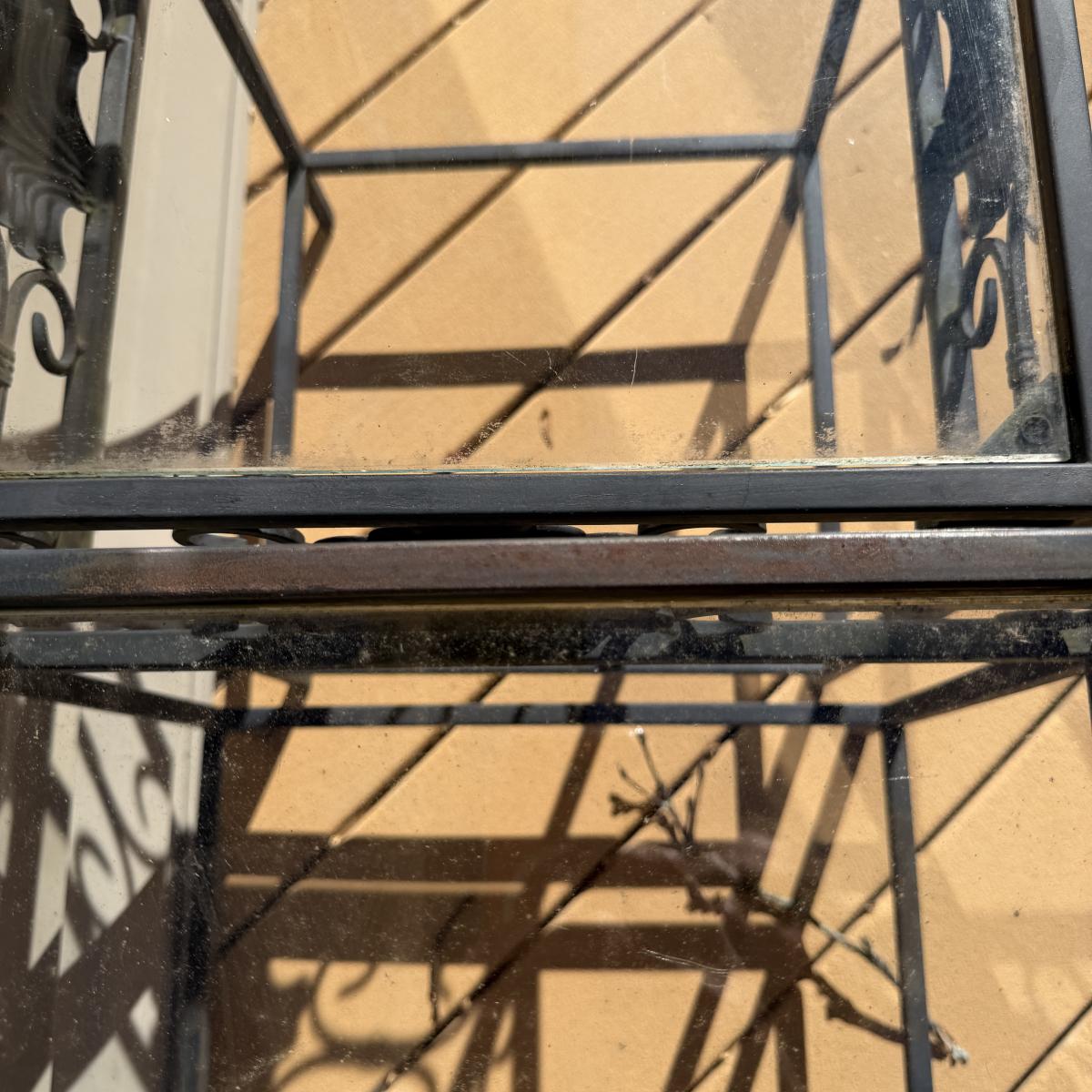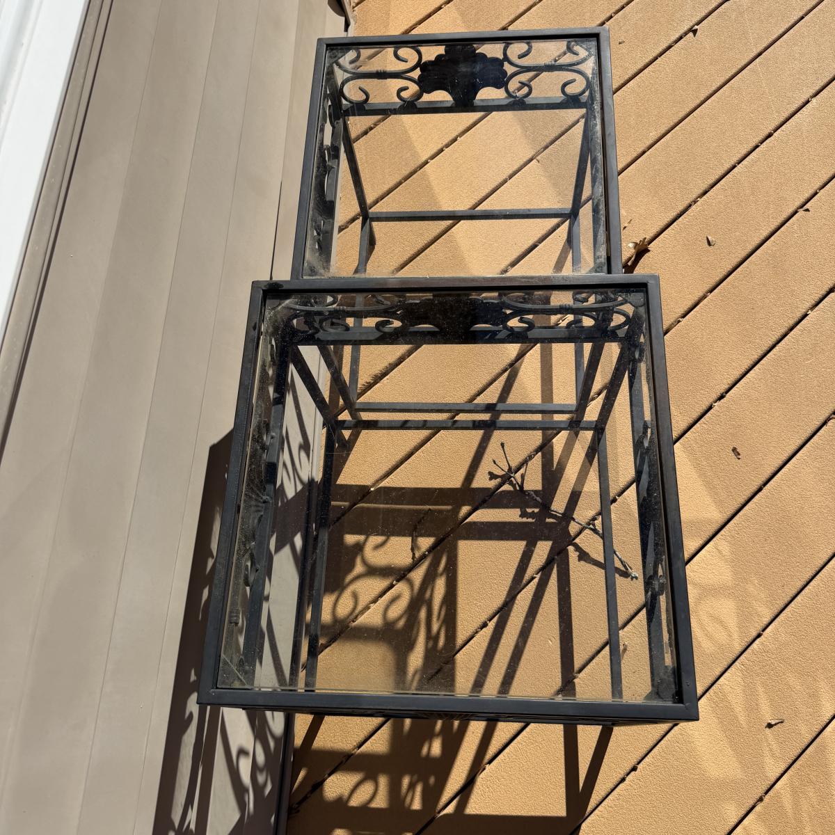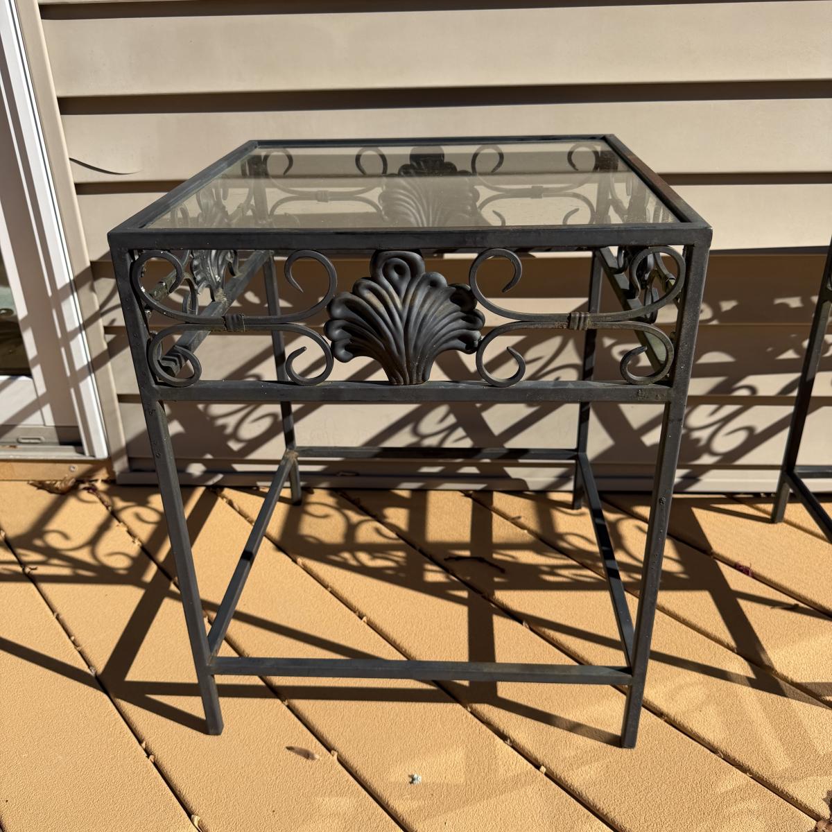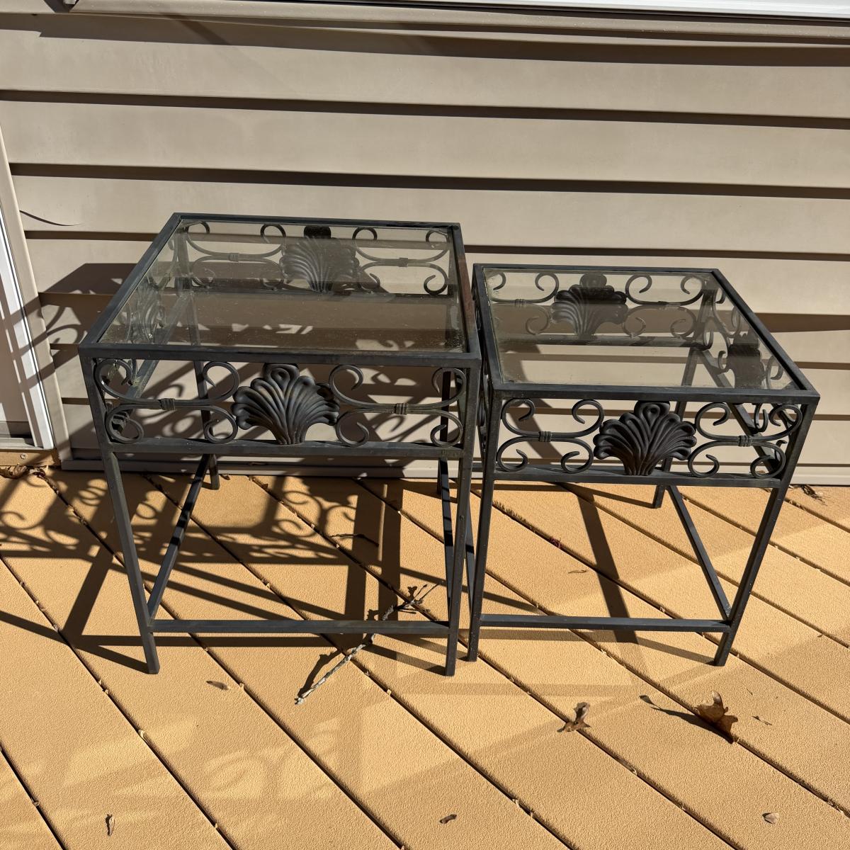 Lot includes two metal nesting tables with glass tops. Largest table measures 16.6” x 16.5” x 20”H.