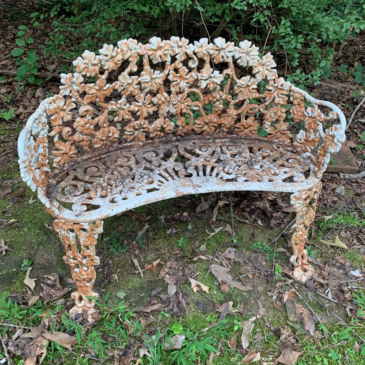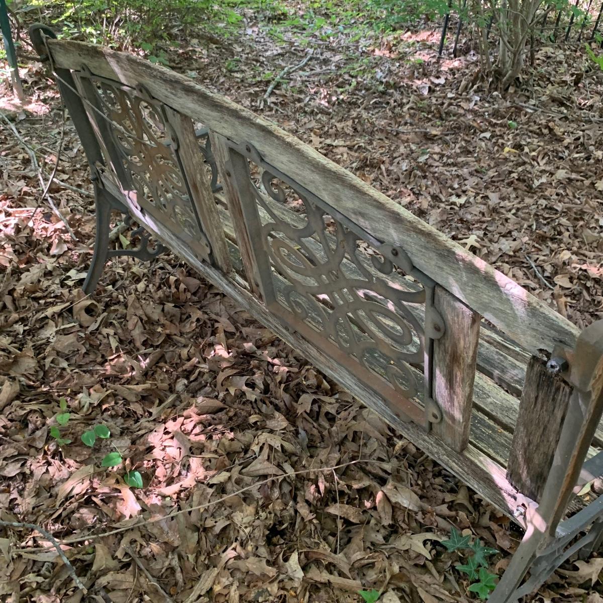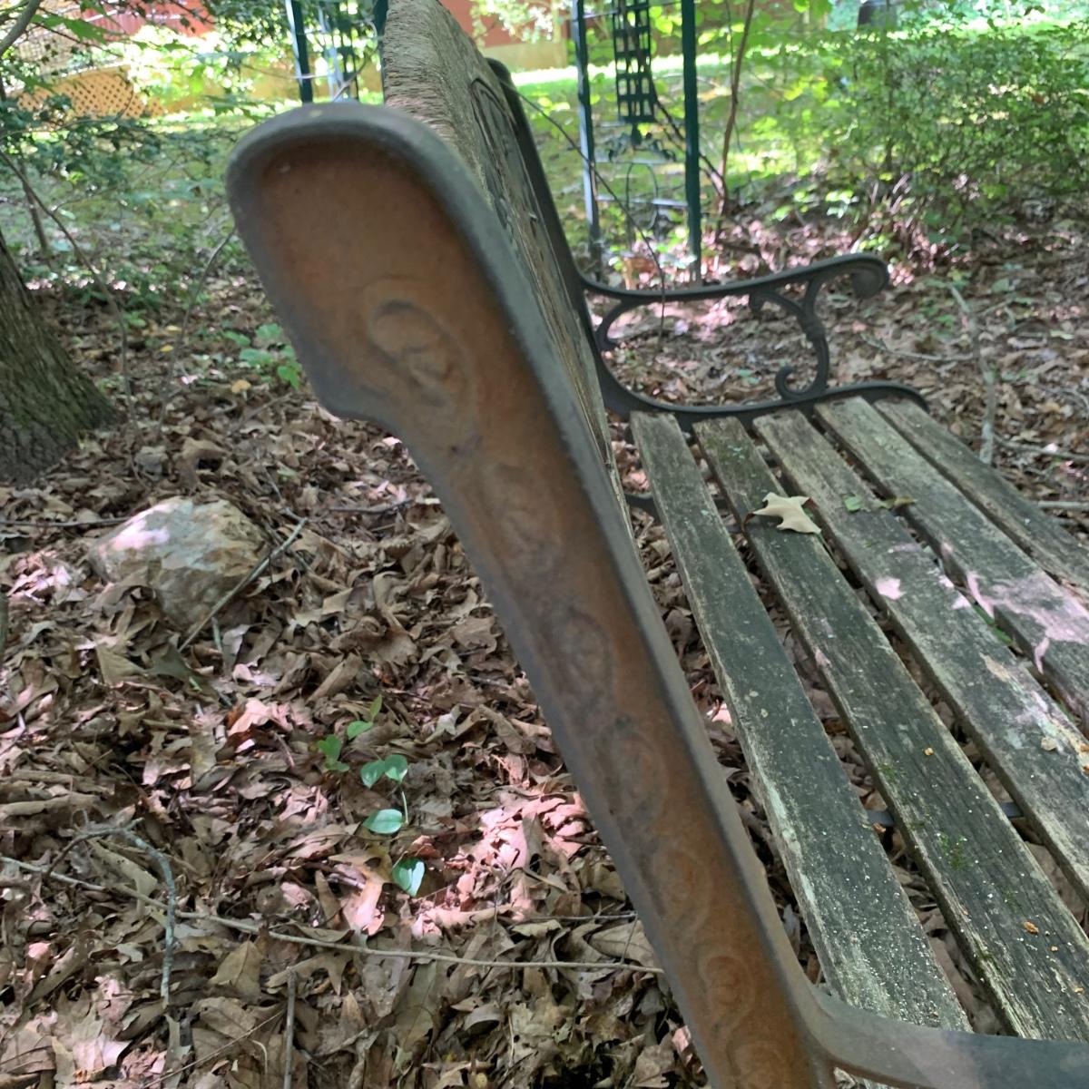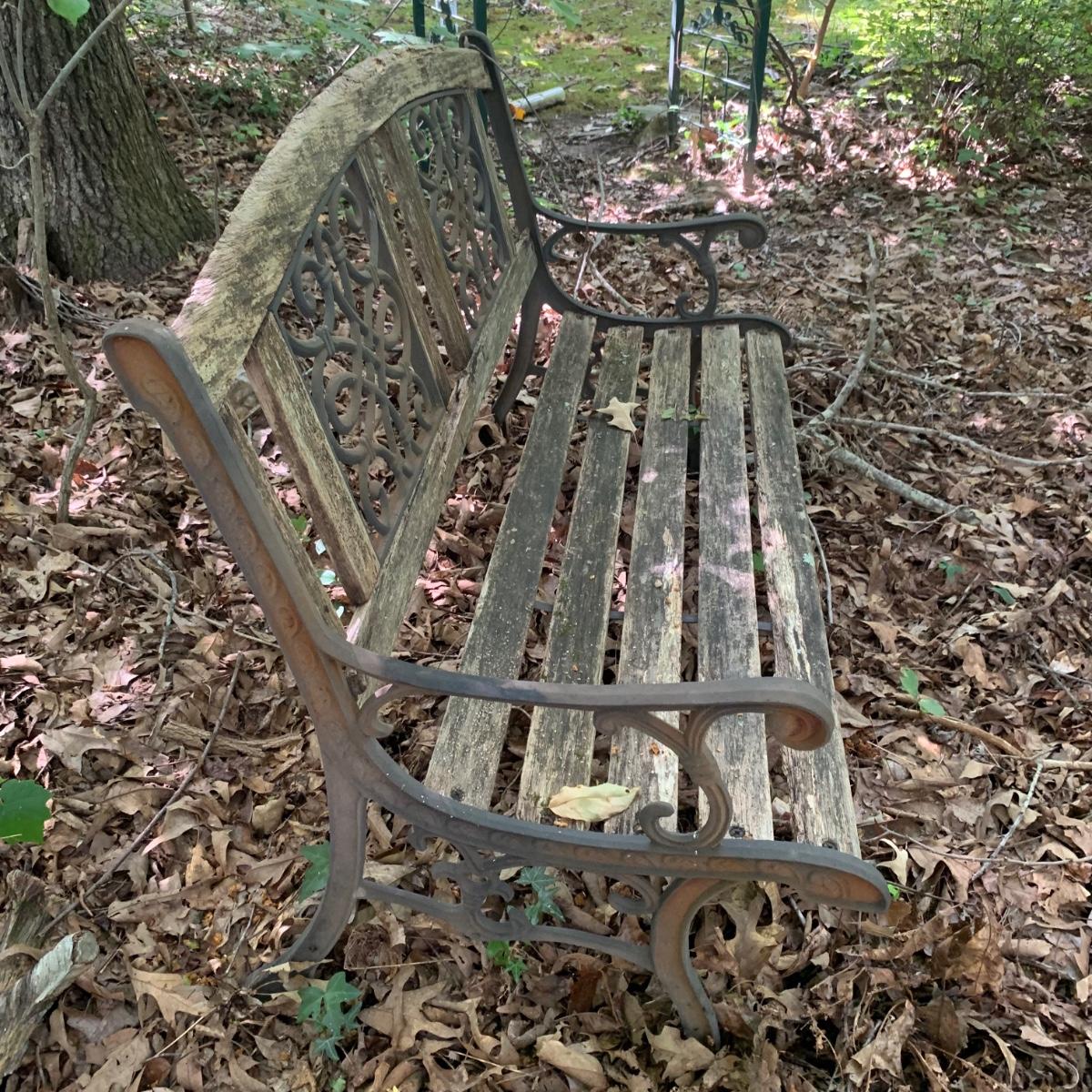 Three outdoor benches. Two are metal, perhaps iron. The smaller metal bench measures 22.5” x 14” x 26” with a seat height of 15”. The larger metal bench measures 38.5” x 17” x 28.5” with a seat height of 14.5”. These are in fair condition as they are quite rusted and weathered. The third bench is wood with a metal base. It measures 50” x 22” x 33” with a seat height of 14”. This bench is also in fair condition as it has been outside in the elements. The winning bidder should bring someone to help move these items up as they are a bit heavy. Local pickup only.