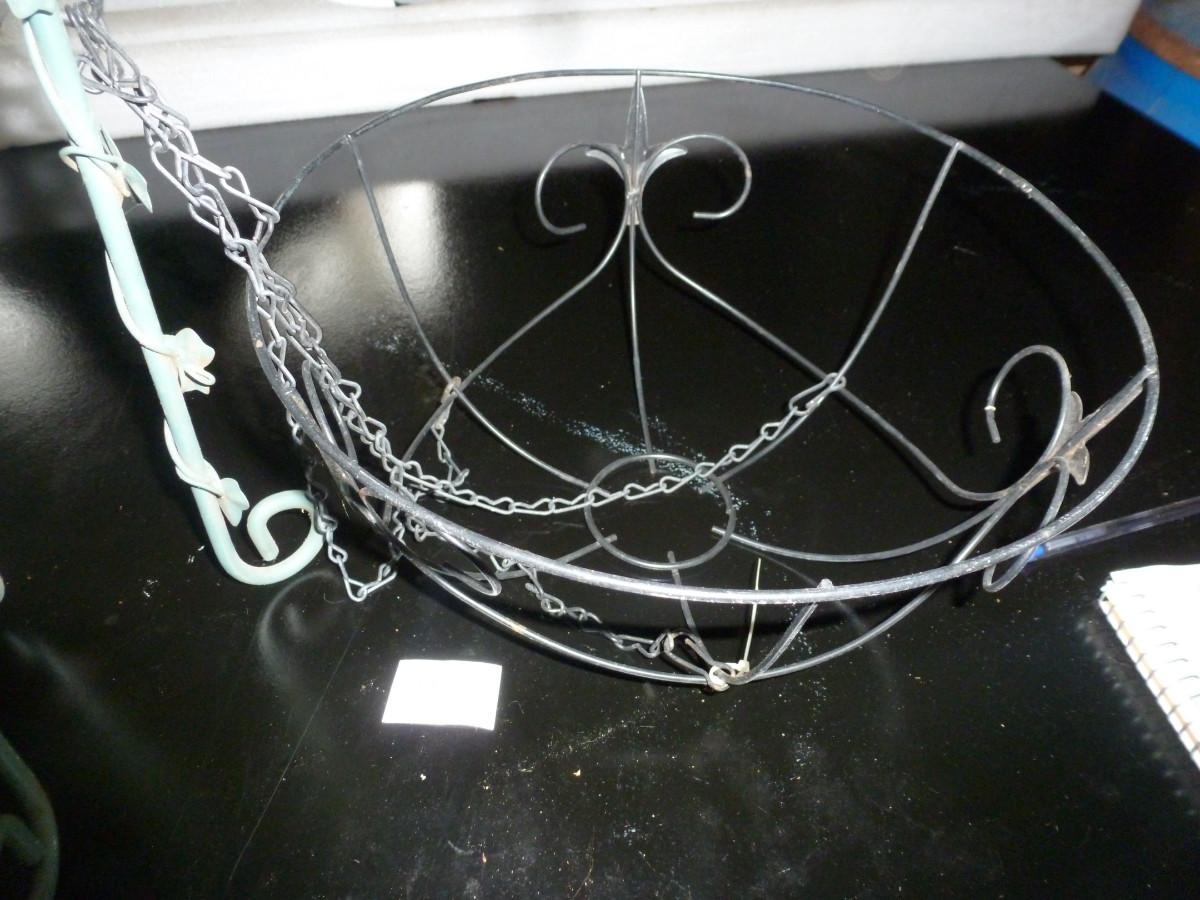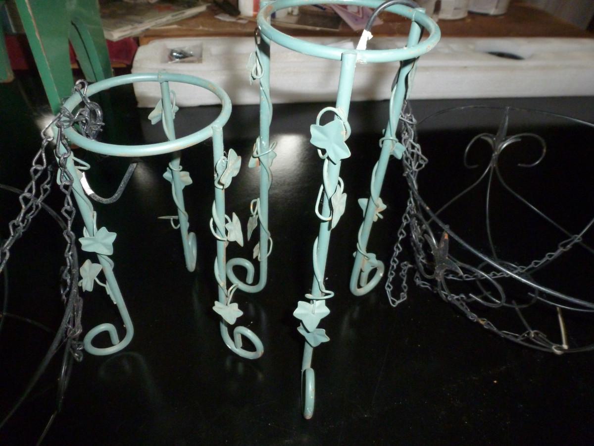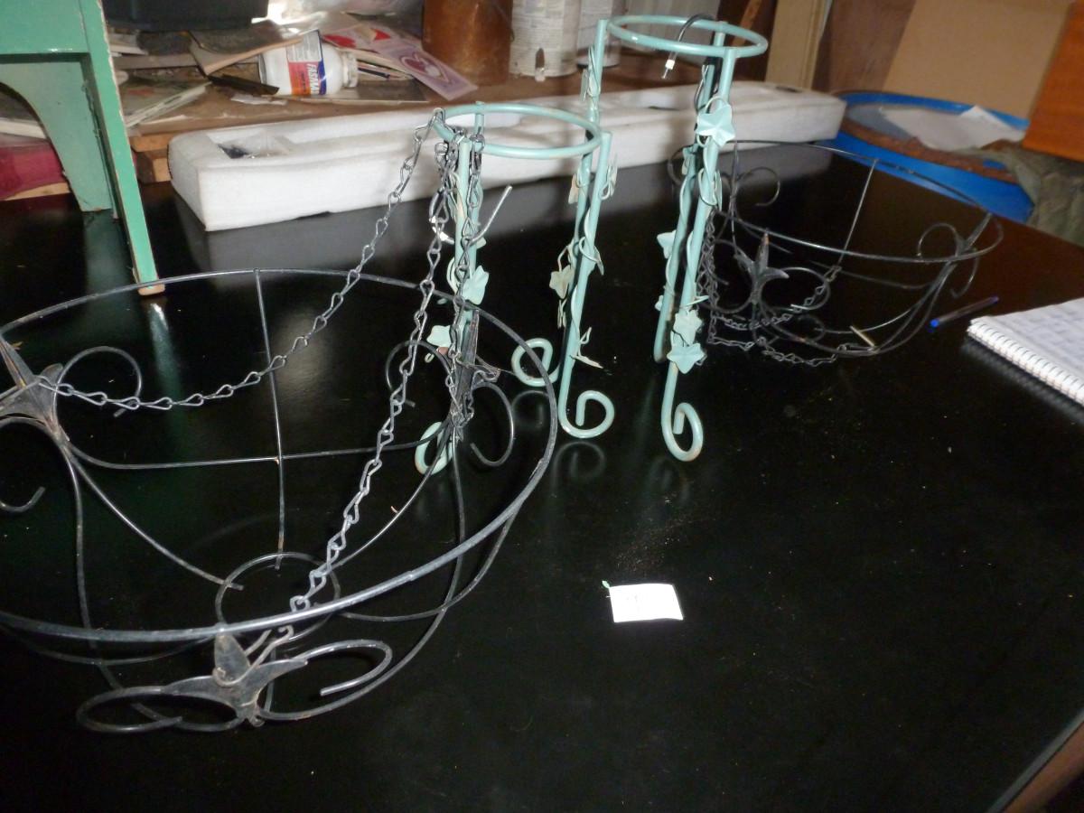 Two Metal Plant Stands and Hanging Baskets