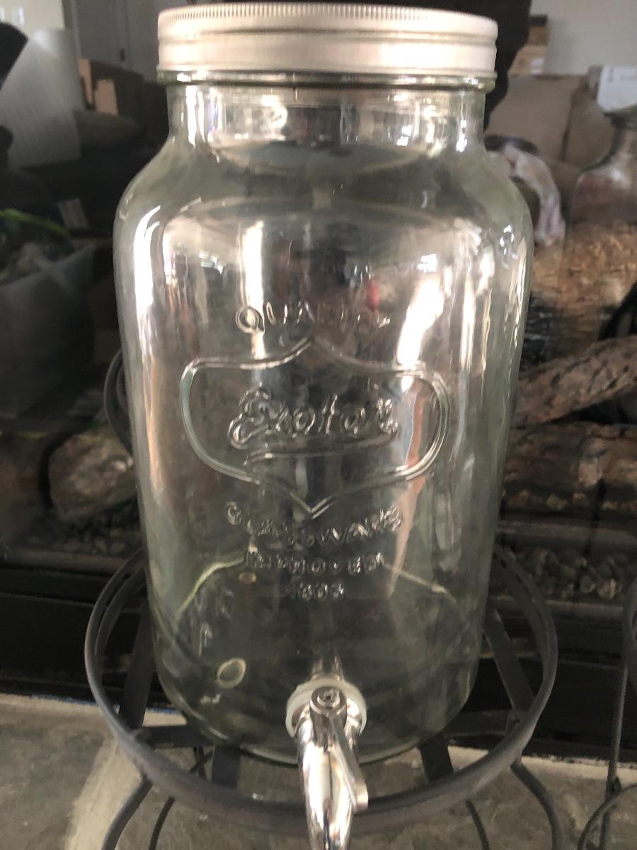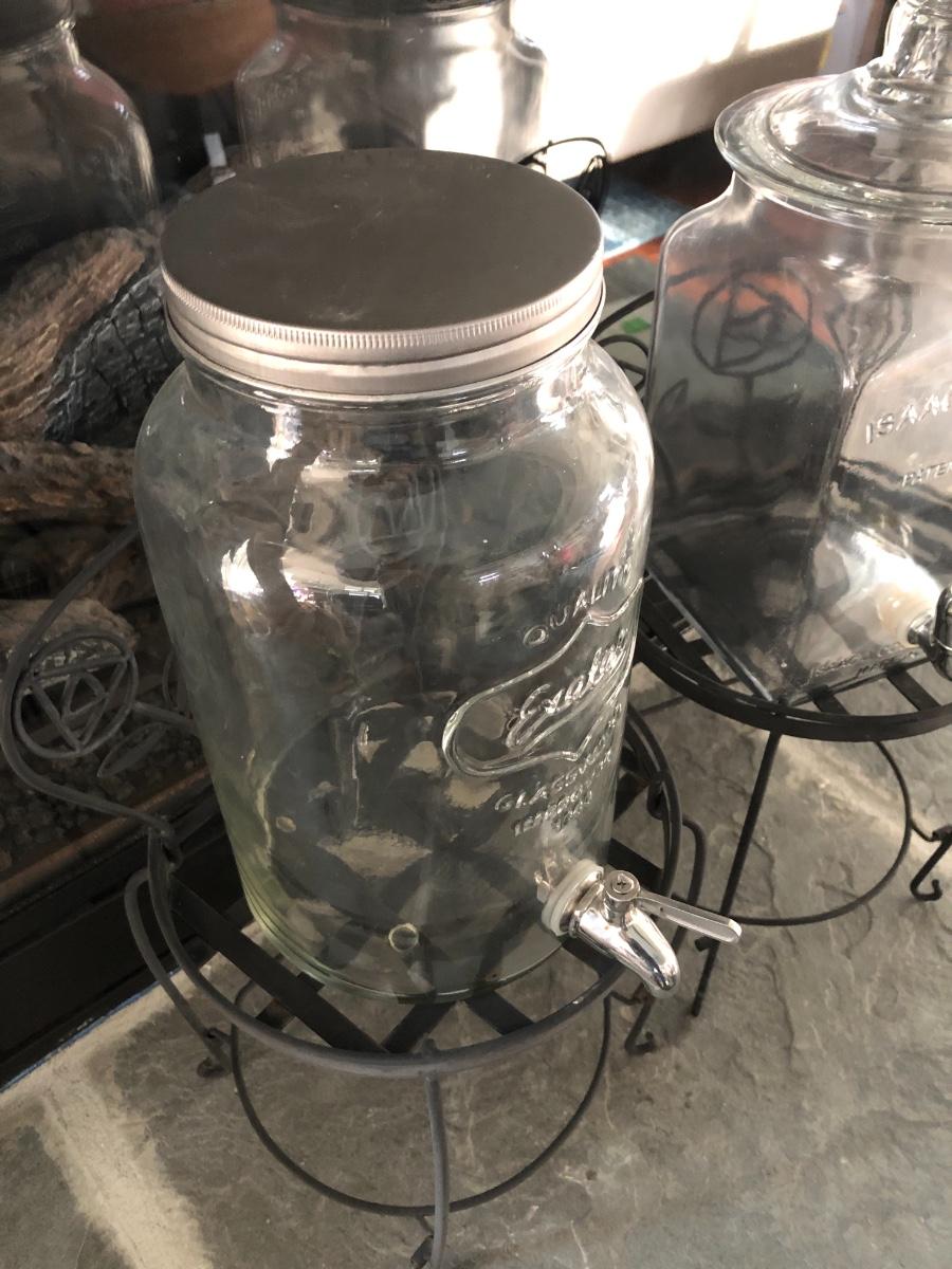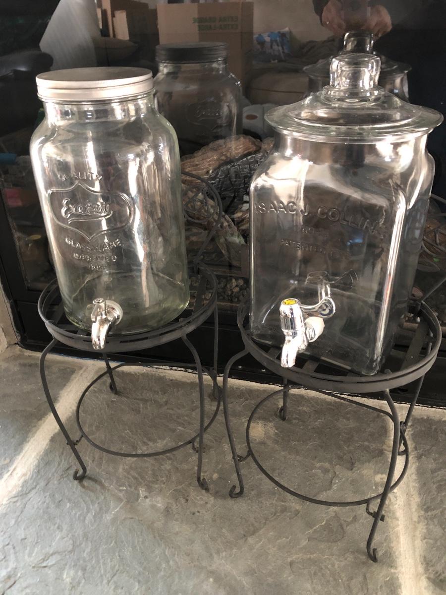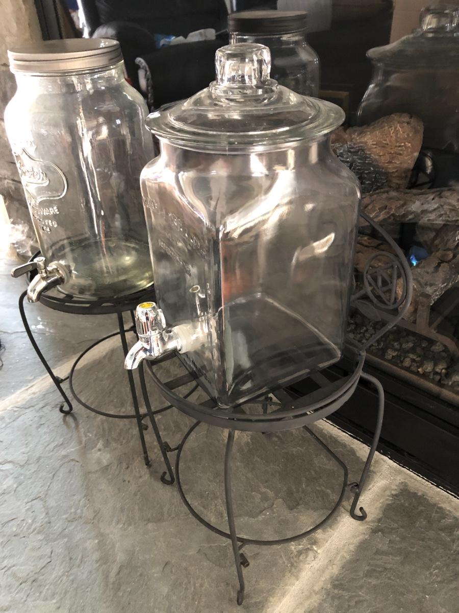 Two Metal Planters / Sun Tea Glass Jar Dispensers