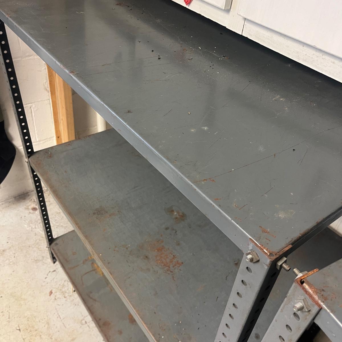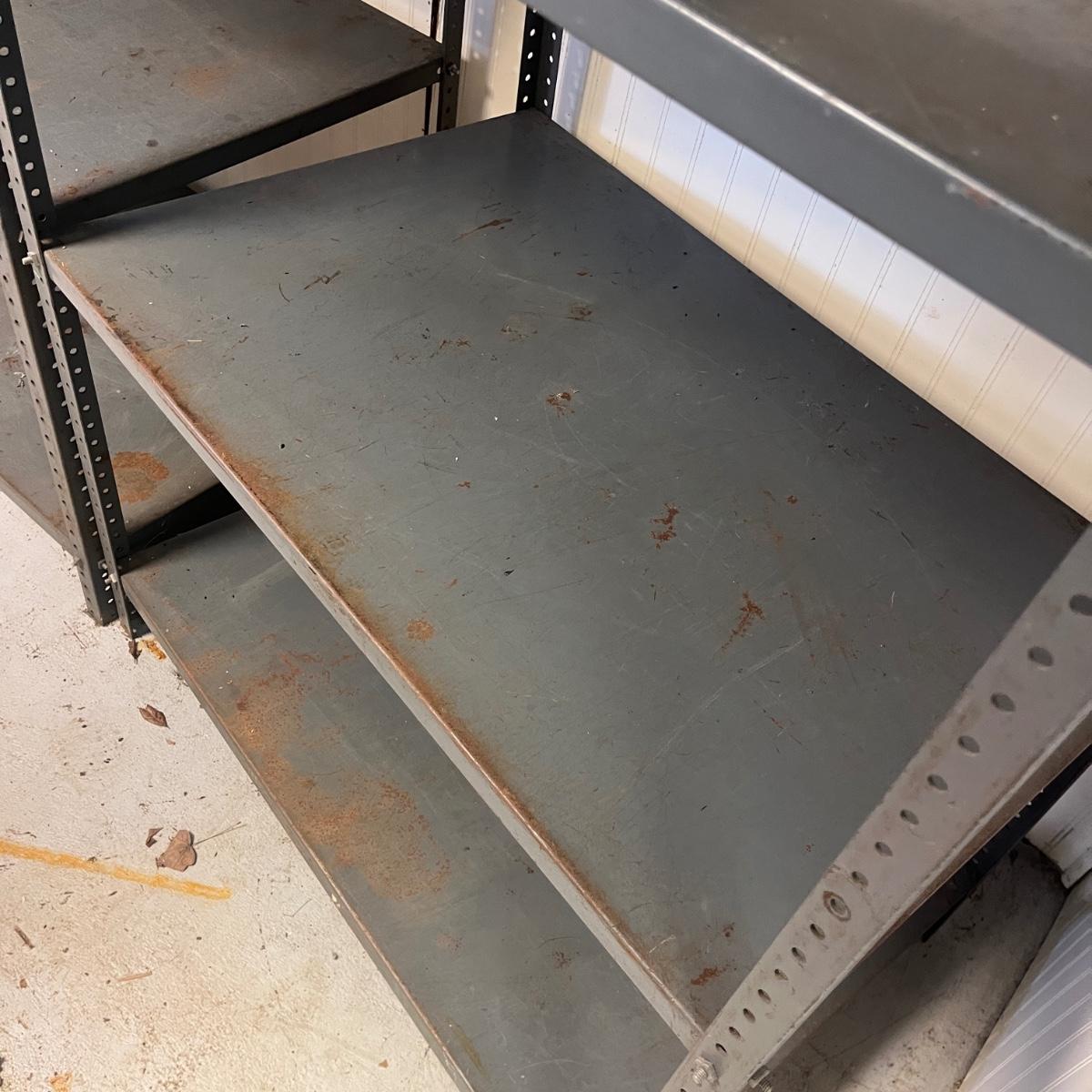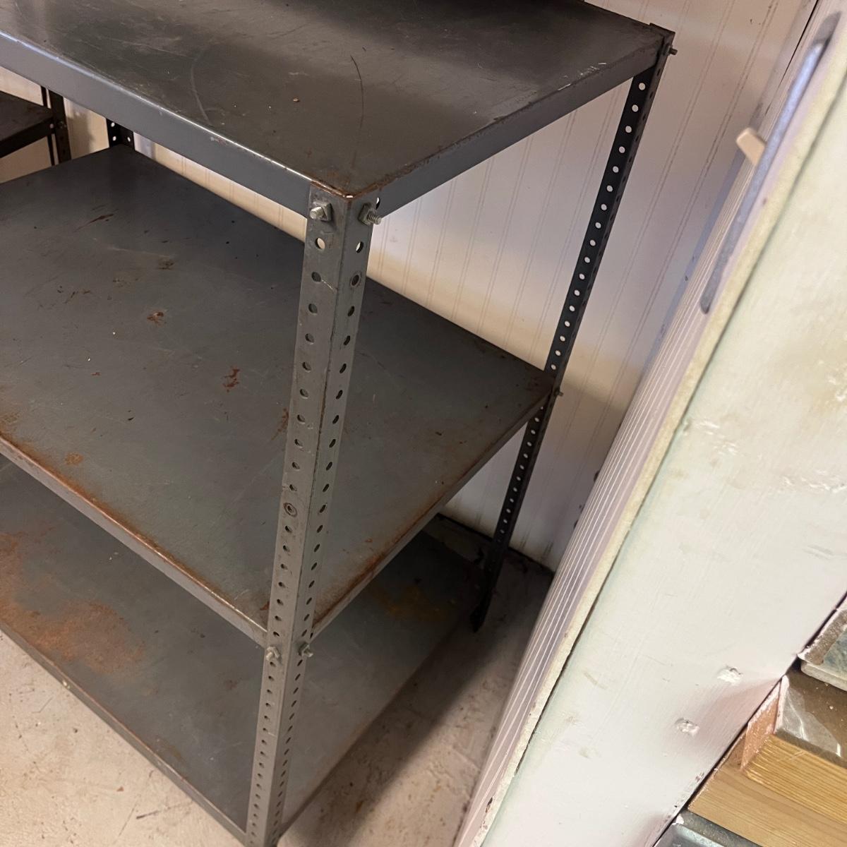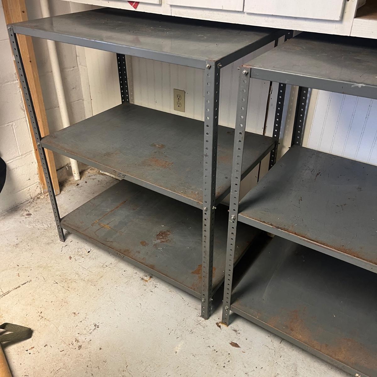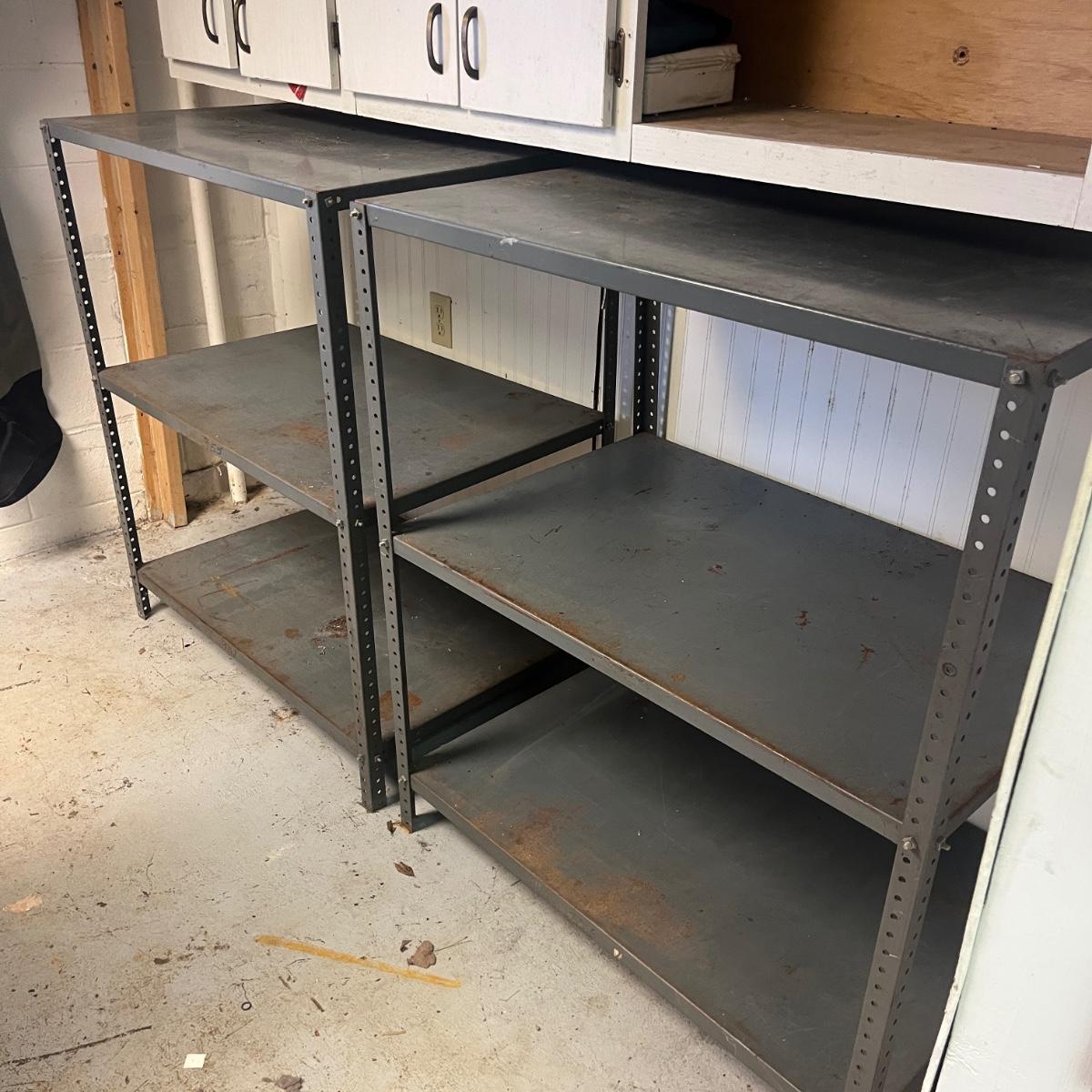 Lot includes two metal shelving units each with three adjustable shelves. Shelves measure 36” x 24” x 42”H.