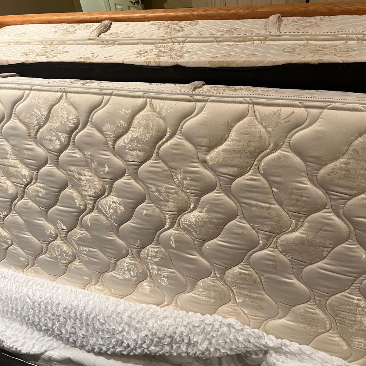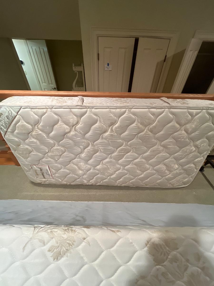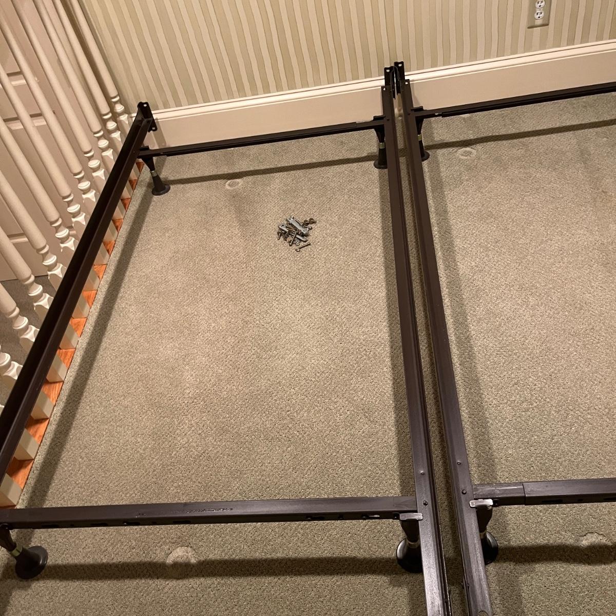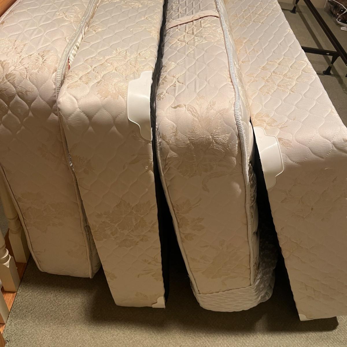 A pair Wamsutta twin comforters with synthetic fill that have been dry cleanened recently and measure approximately 68" x 88". Also includes a FeelAtHome gap filler with a strap to combine two twin mattresses. Two metal twin bed frames. Also includes two sets of Englander twin box springs and mattresses. Winning Bidder may take mattresses and box springs but is not required to.