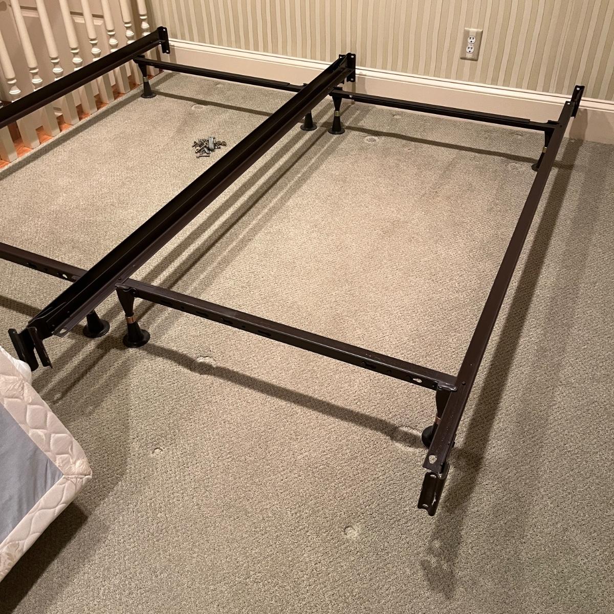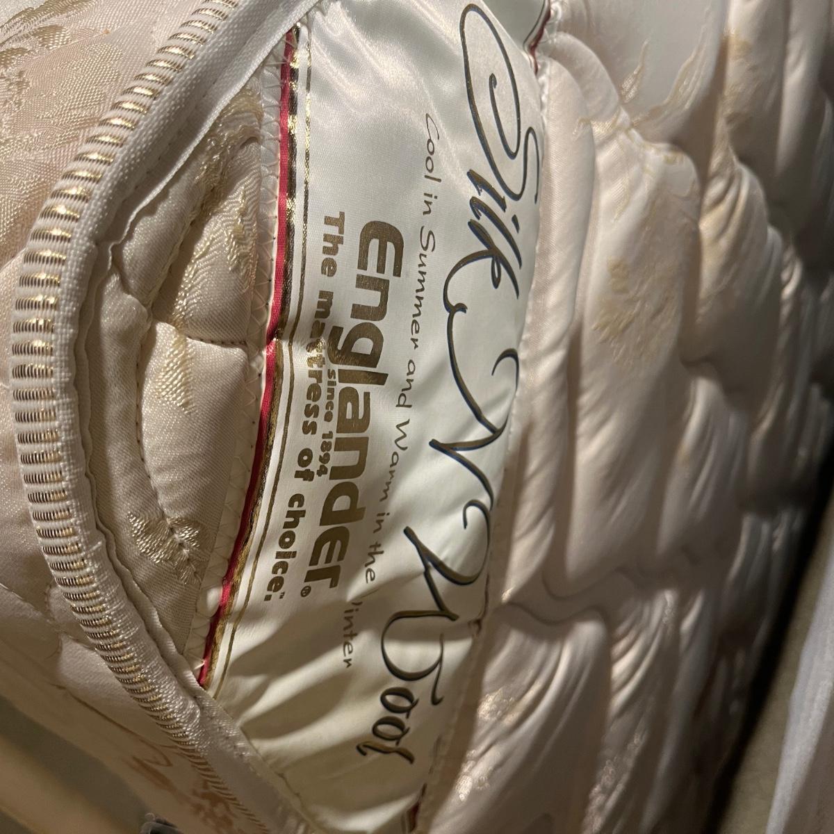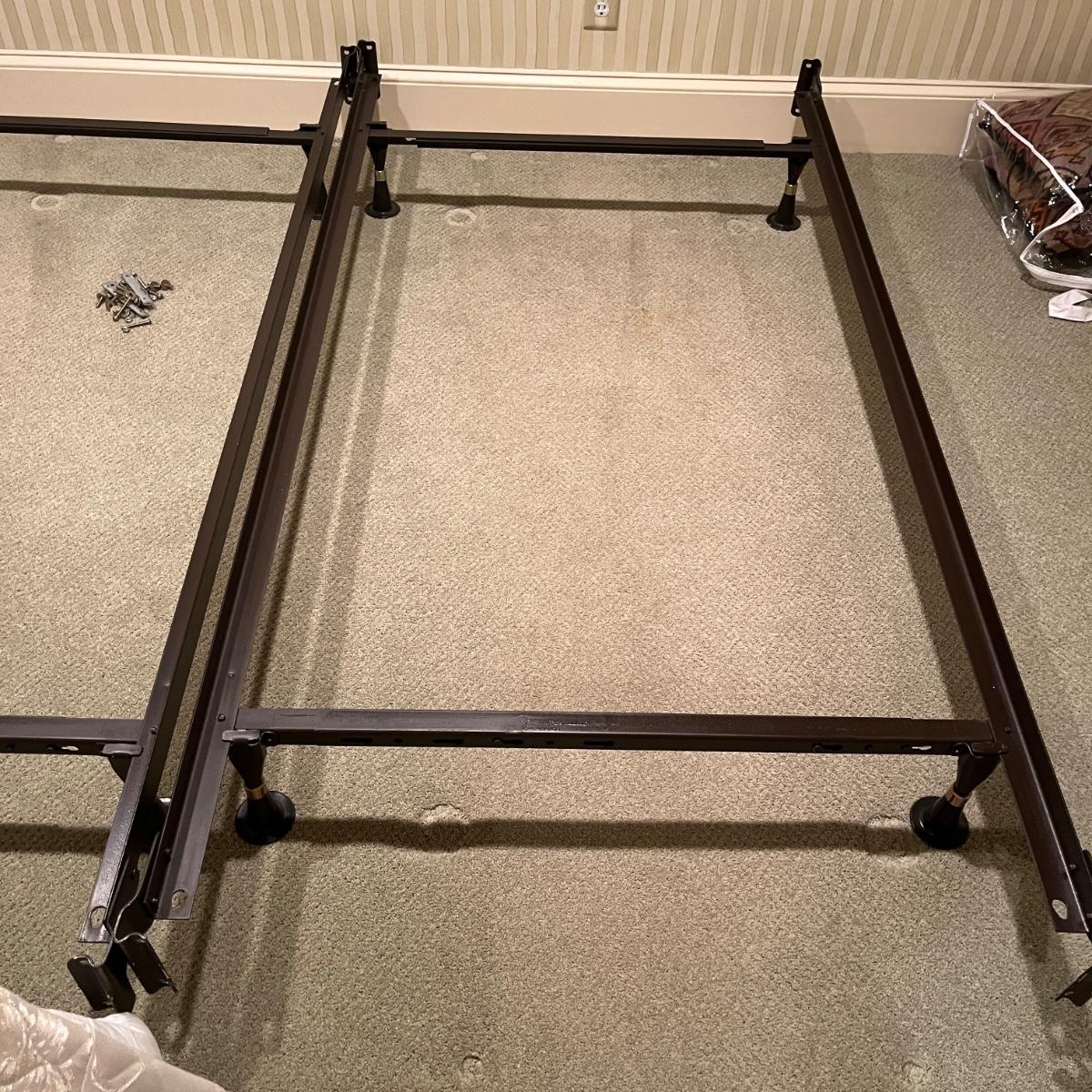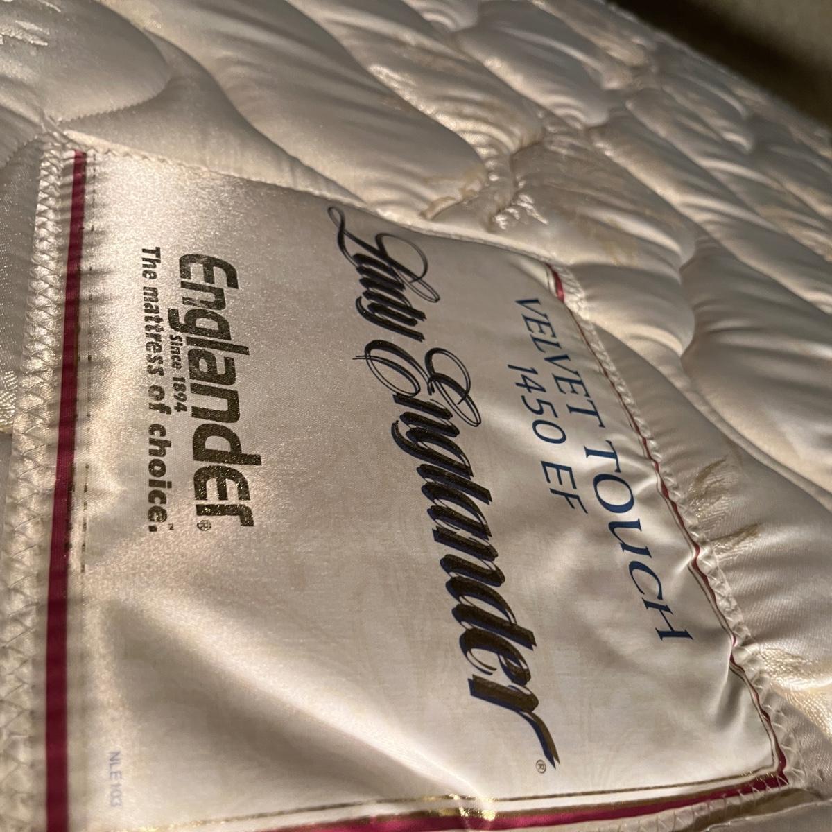 A pair Wamsutta twin comforters with synthetic fill that have been dry cleanened recently and measure approximately 68" x 88". Also includes a FeelAtHome gap filler with a strap to combine two twin mattresses. Two metal twin bed frames. Also includes two sets of Englander twin box springs and mattresses. Winning Bidder may take mattresses and box springs but is not required to.