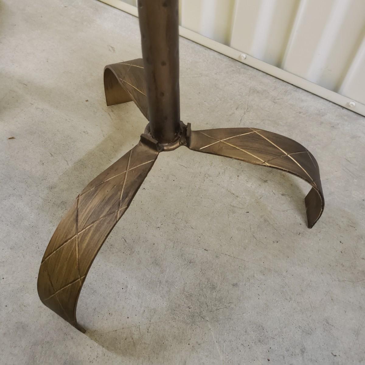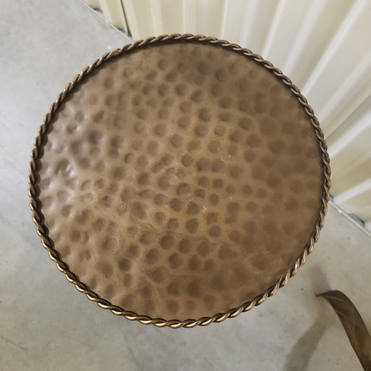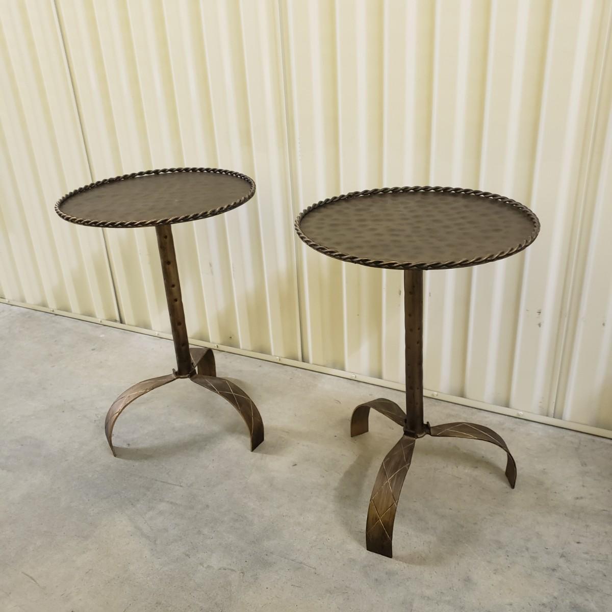 These are two metal tables with a brass colored finish. Each table measures 12"D x 18"H. There is a rope like feature around the edge of the top. These would be perfect for a plant or next to a chair.