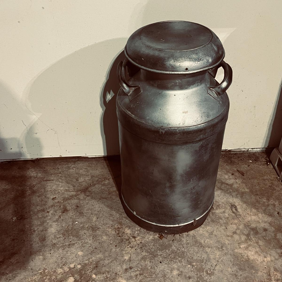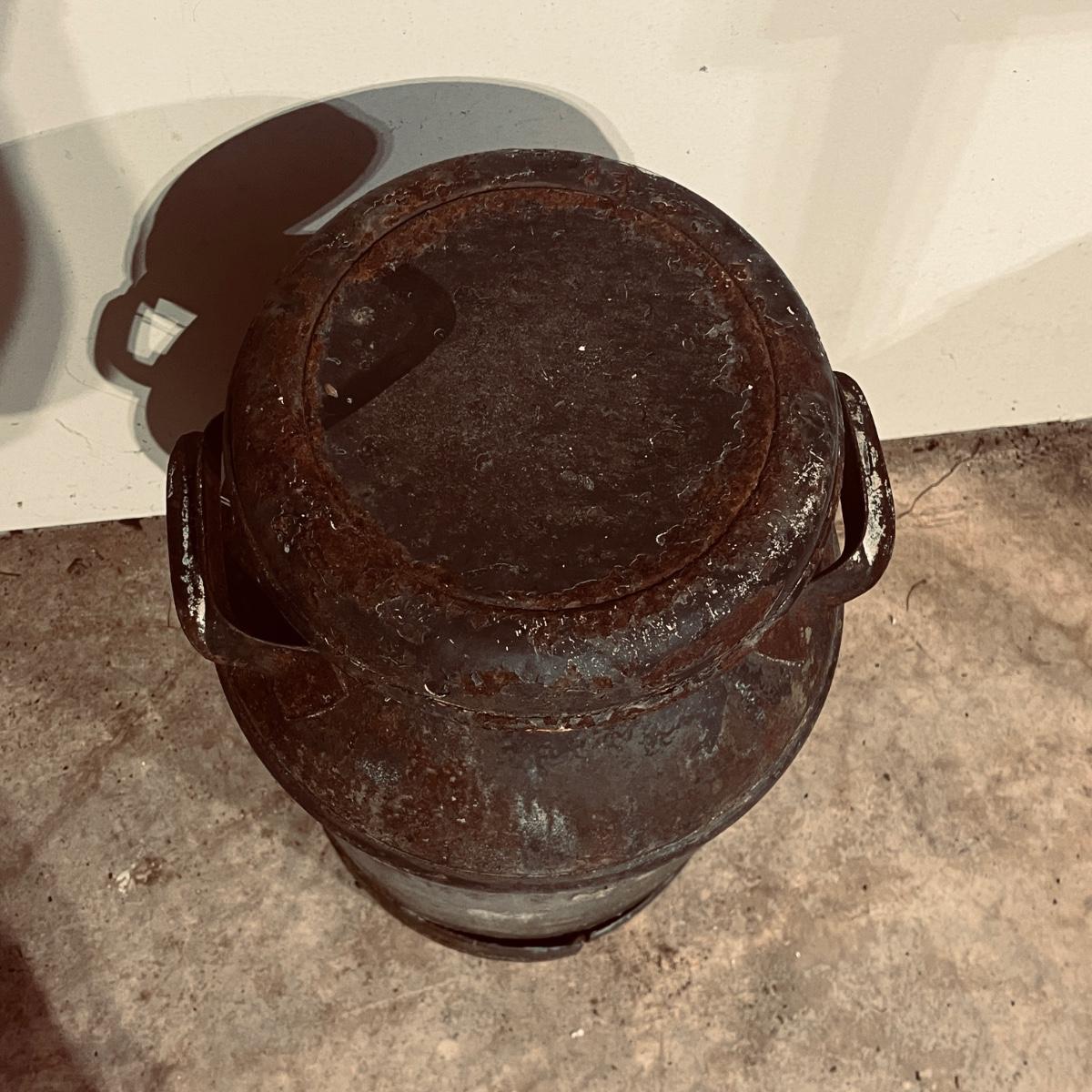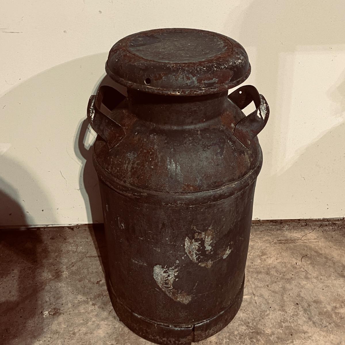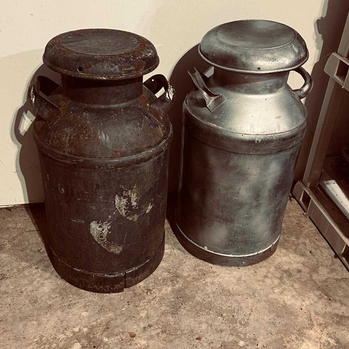 Lot includes two vintage metal milk cans both with lids. Milk cans measure 13”D x 25”H. One can has rust on the bottom, see pictures.