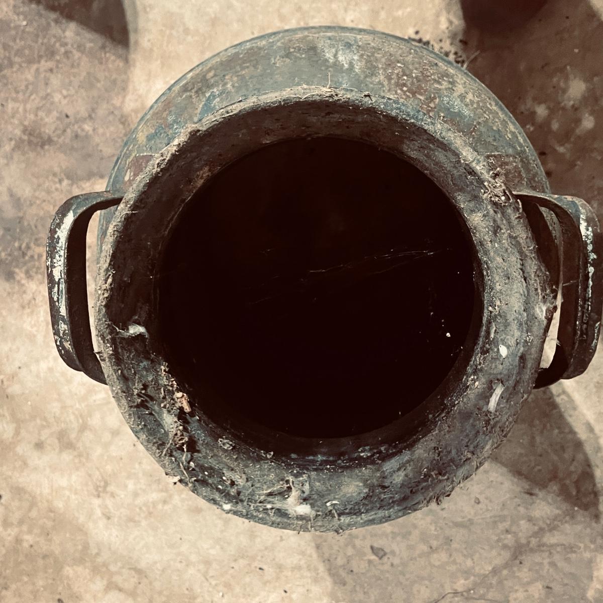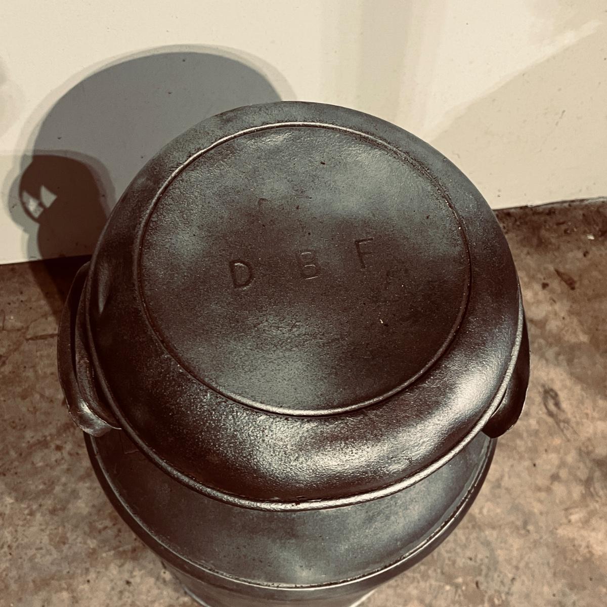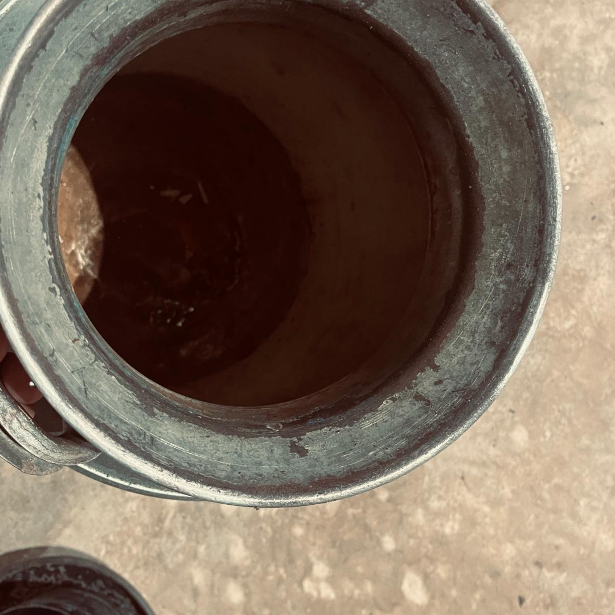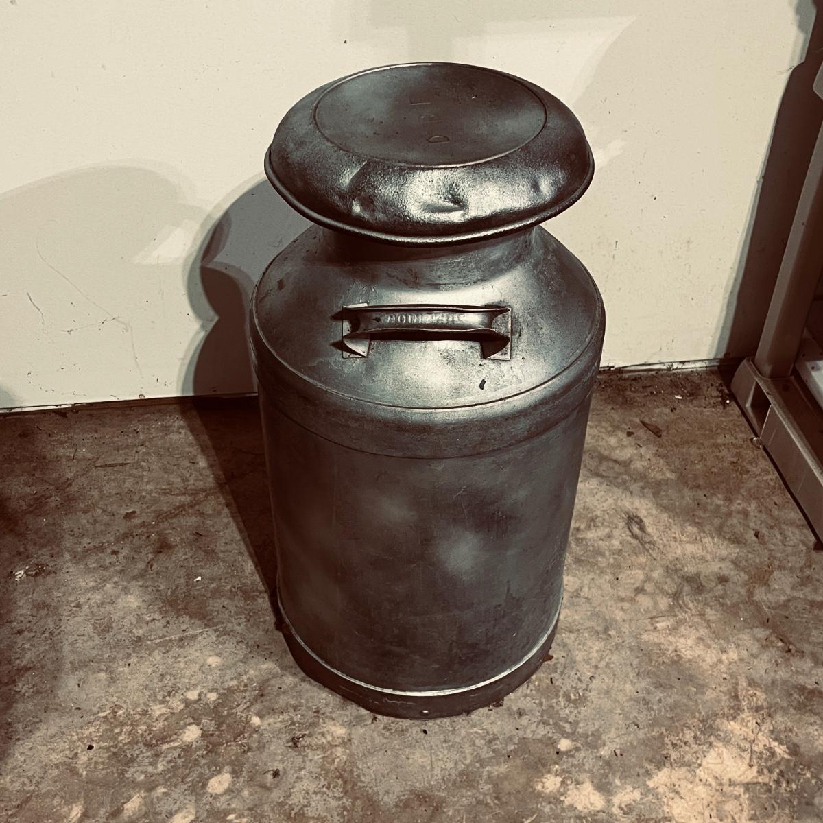 Lot includes two vintage metal milk cans both with lids. Milk cans measure 13”D x 25”H. One can has rust on the bottom, see pictures.