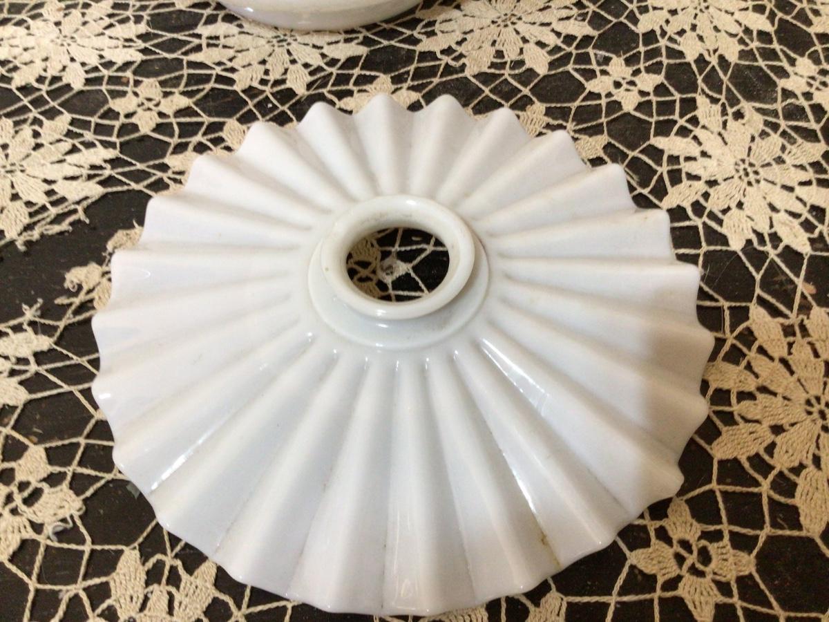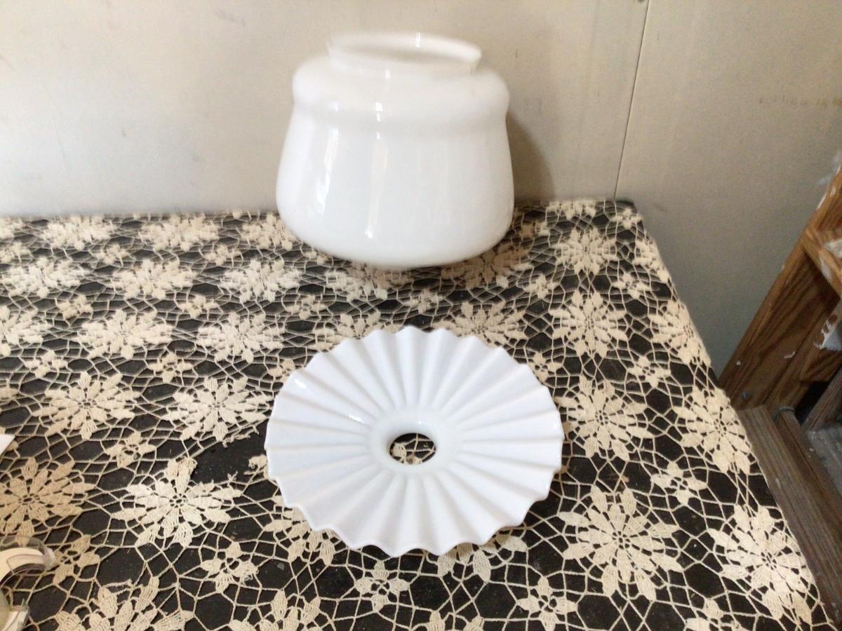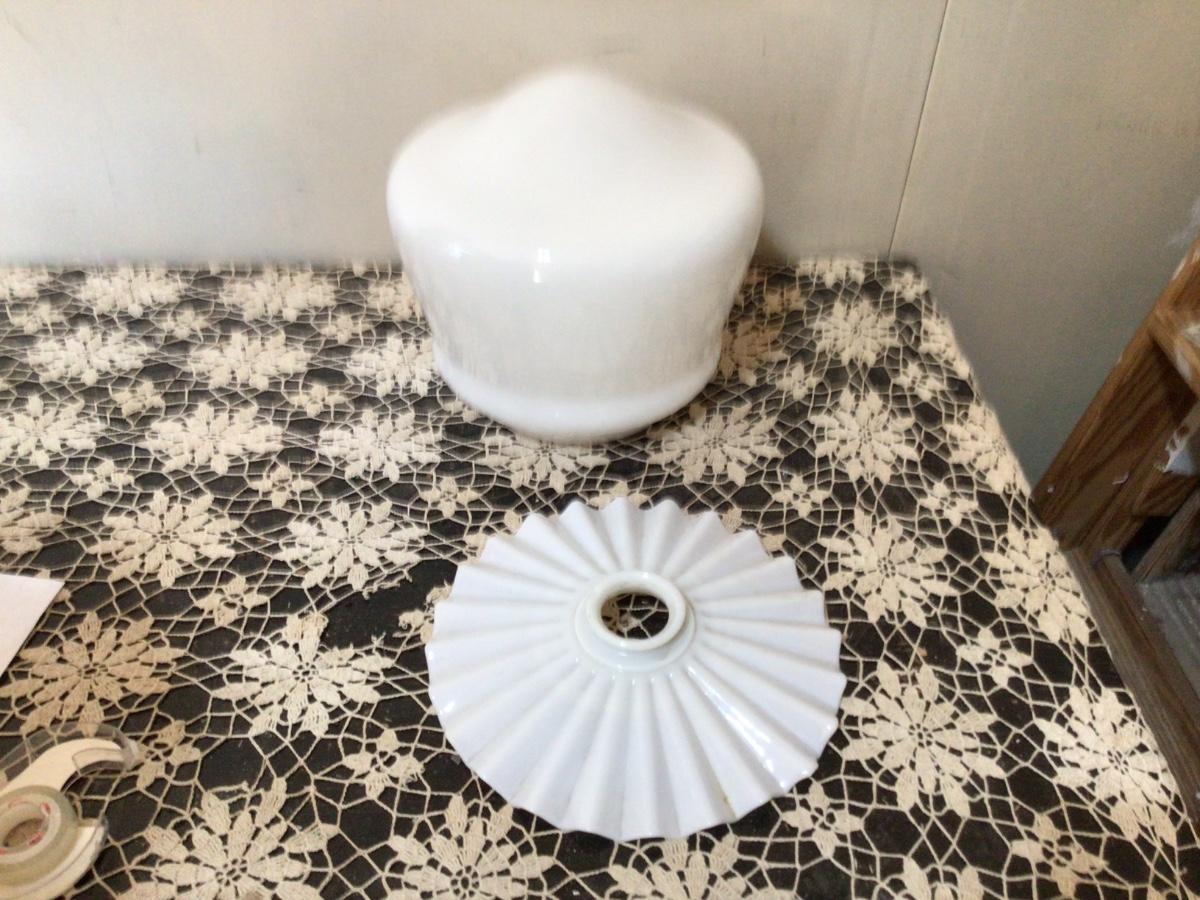 These are two great milk glass light shades one is large dom style the others is ruffled round fan shade. Both in good condition.