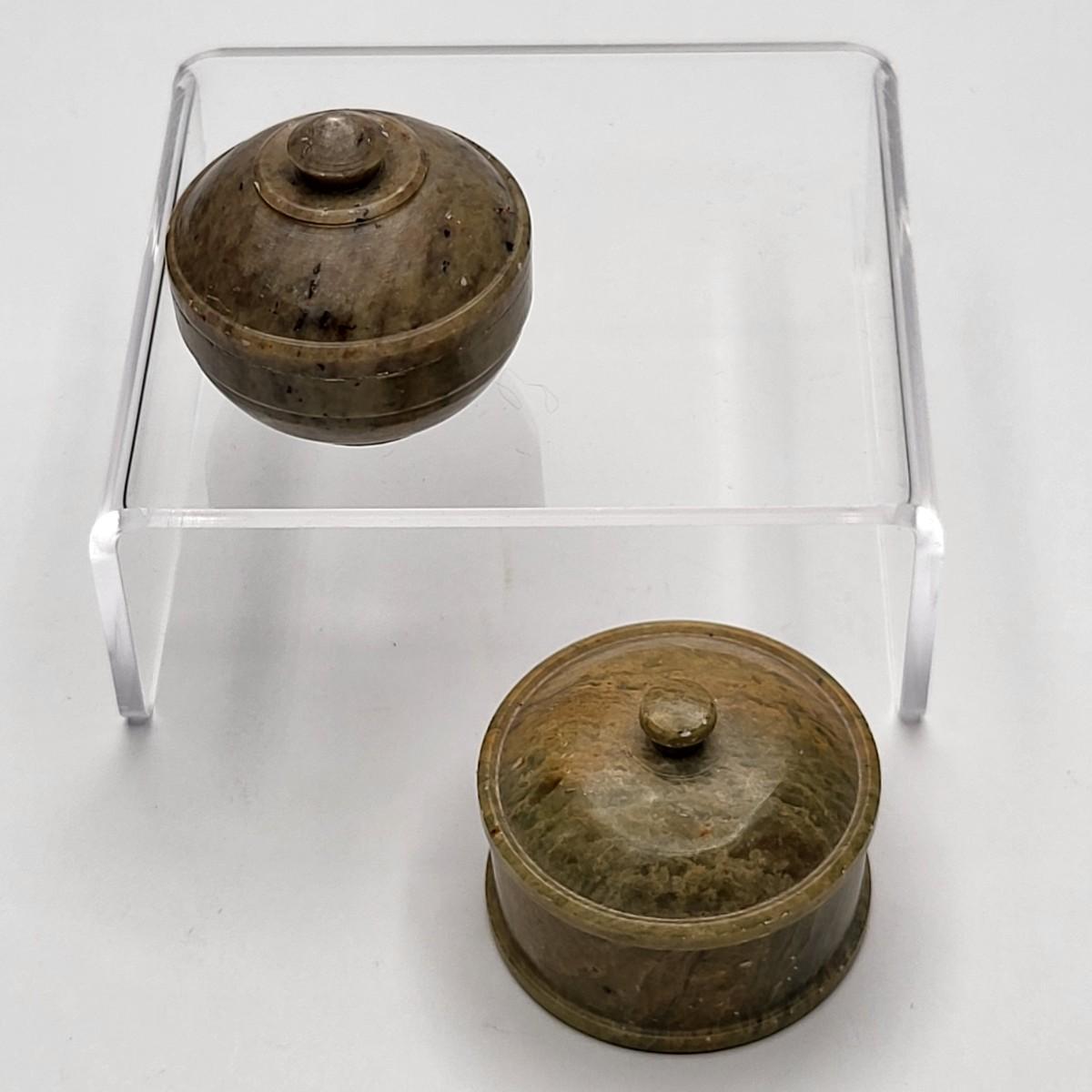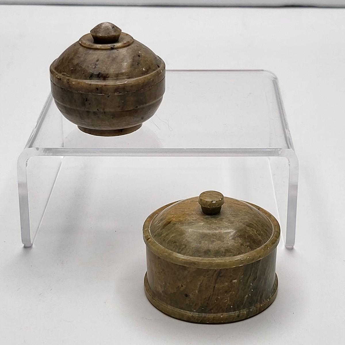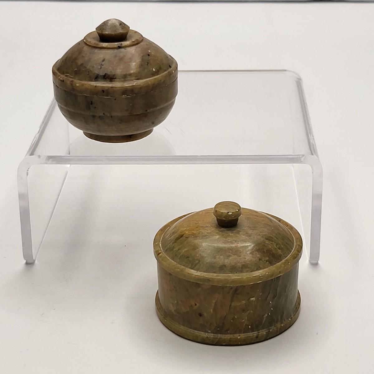 Two Alabaster stone boxes, natural colored stone, lidded, round boxes. They are small size. One is 1.75" x 1.5" an one is 1.5" x 1.5".