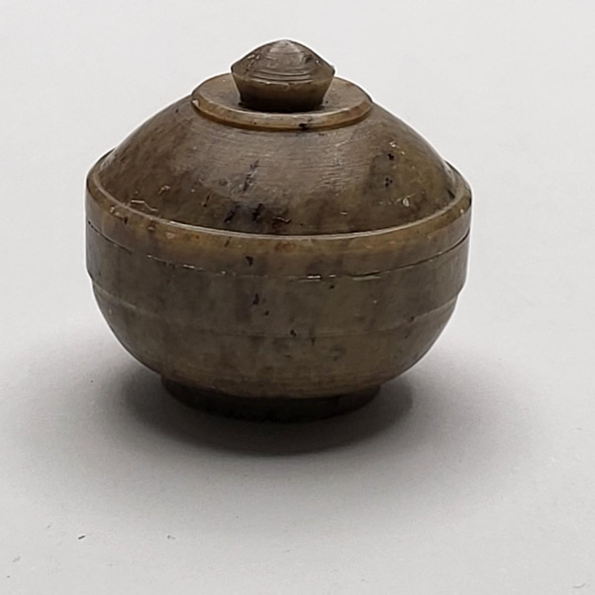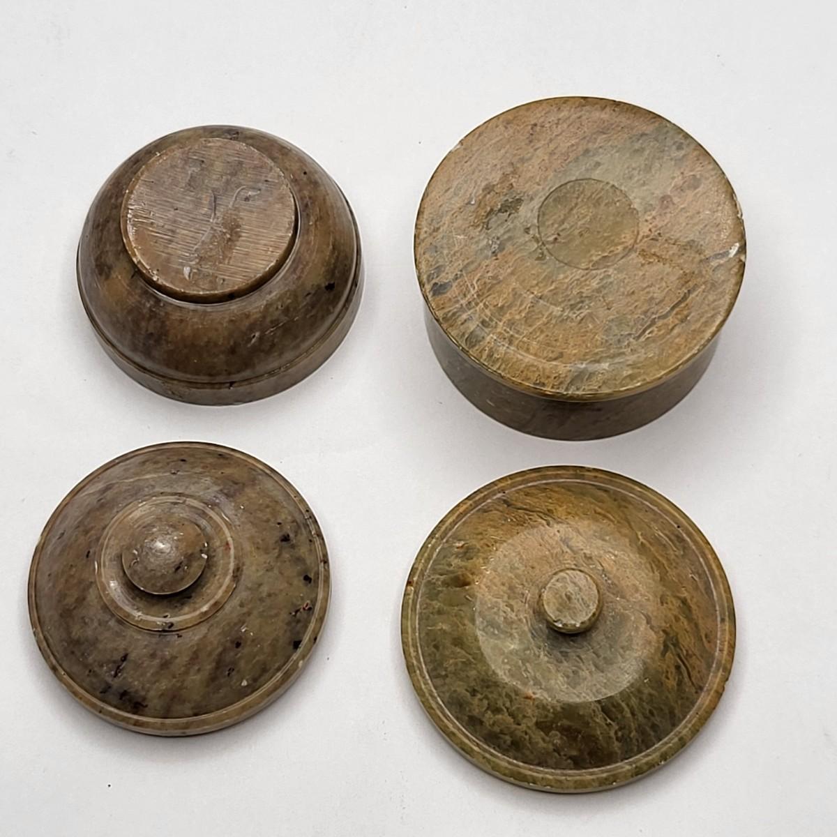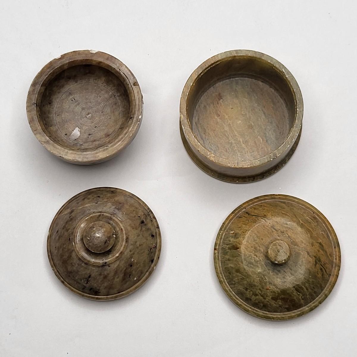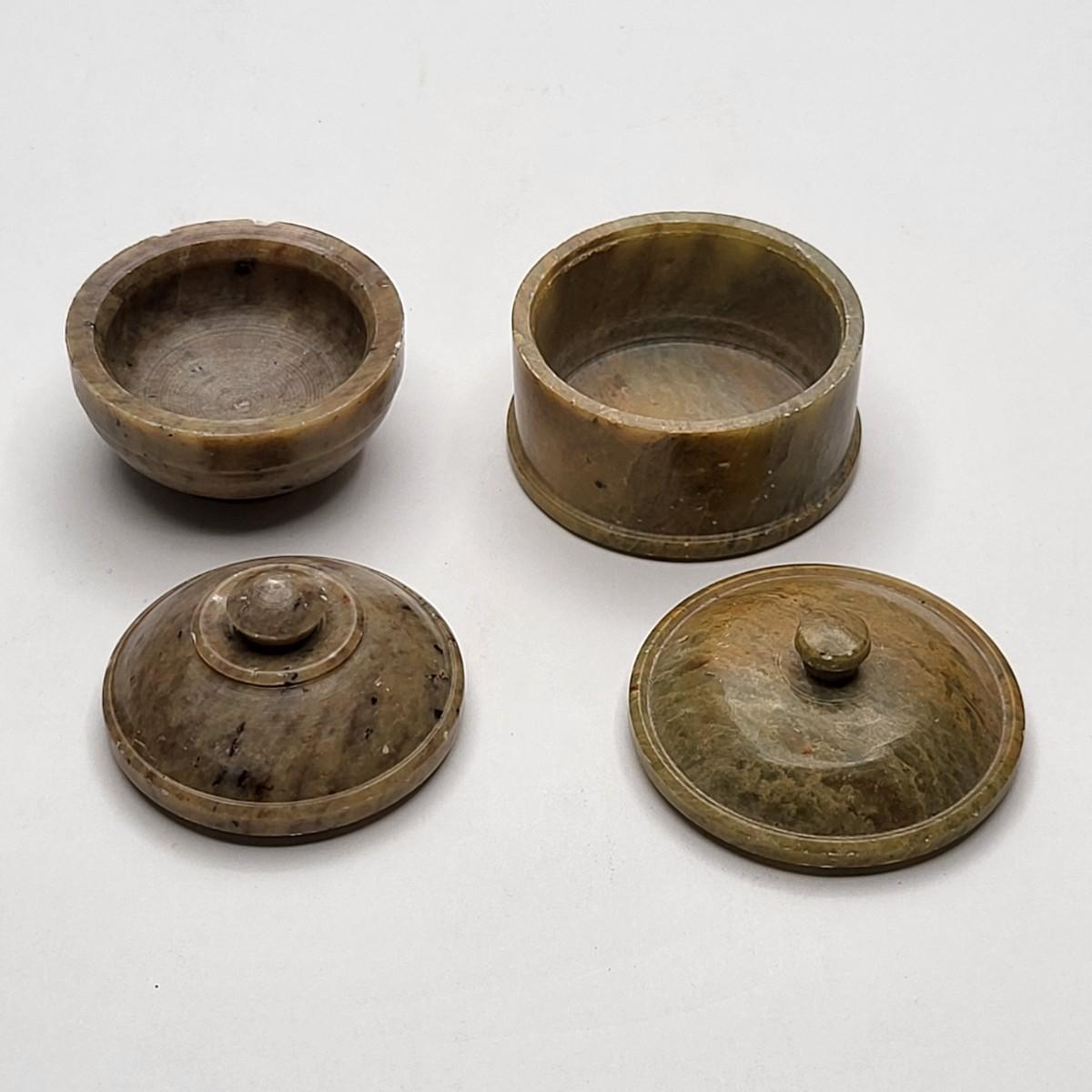 Two Alabaster stone boxes, natural colored stone, lidded, round boxes. They are small size. One is 1.75" x 1.5" an one is 1.5" x 1.5".