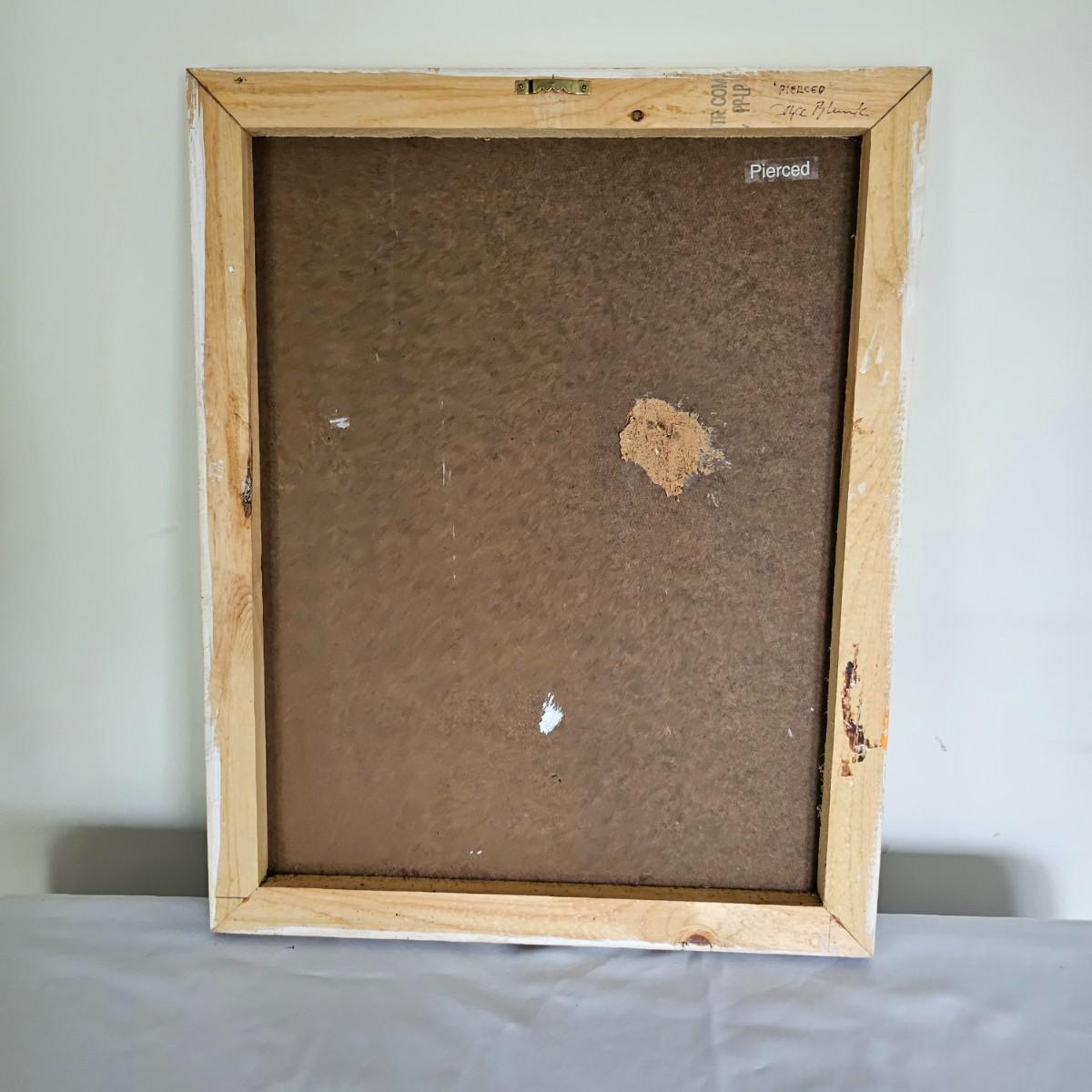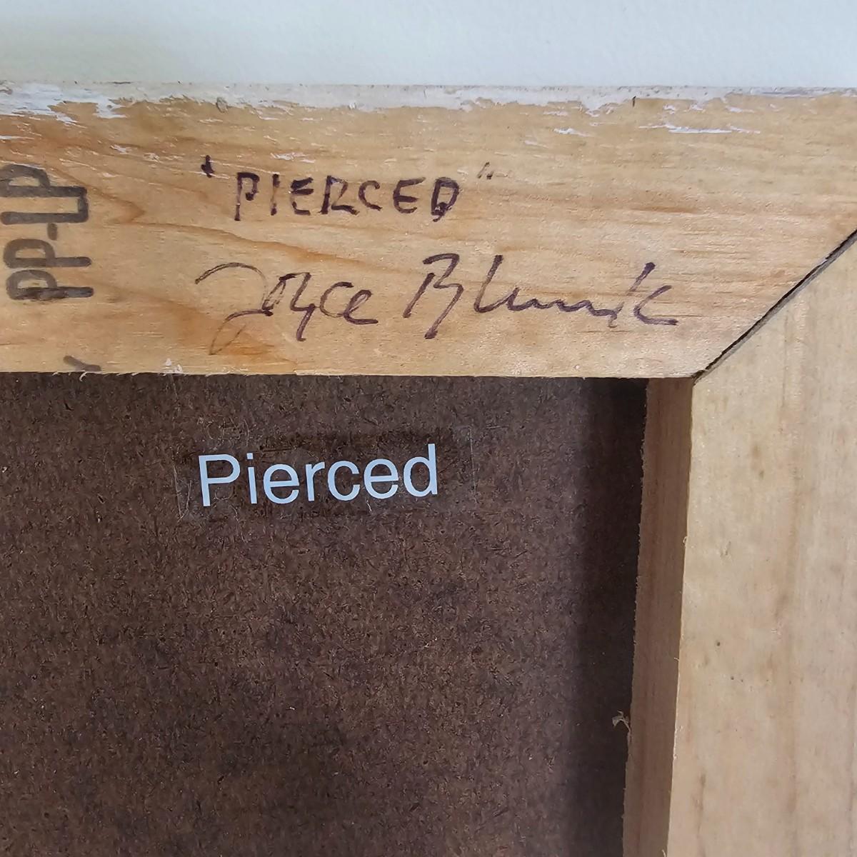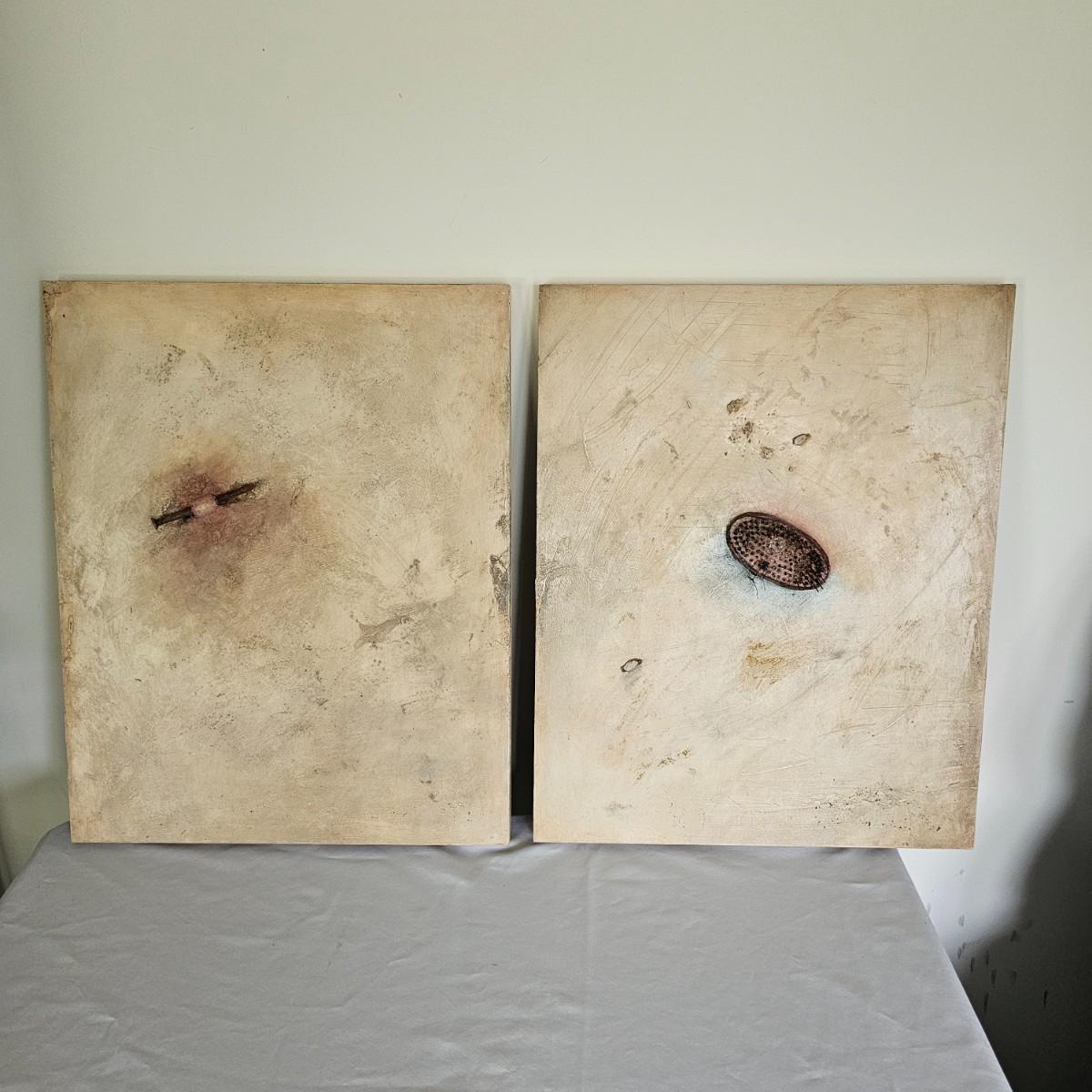 Tan/pinkish backgrounds highlight a single object on each of these Joyce Blunk creations. One single rusted metal brush minus most of its bristles. Additional art debris scattered on the surface. Second item is titled 'Pierced', is signed by artist, has rusty large nail appearing out of base. Both items are wood frame with Masonite fronts, measure 16" x 20.5"H. See photos for details. Shipping available. Shipping can be costly. We suggest contacting our preferred local shipping provider, Postage Express, with dimensions and getting an estimate before bidding: (828) 255-9250 or shipping@postageexpressnc.com.