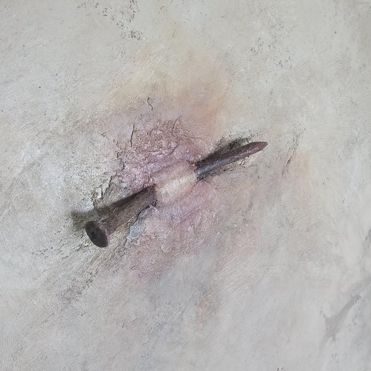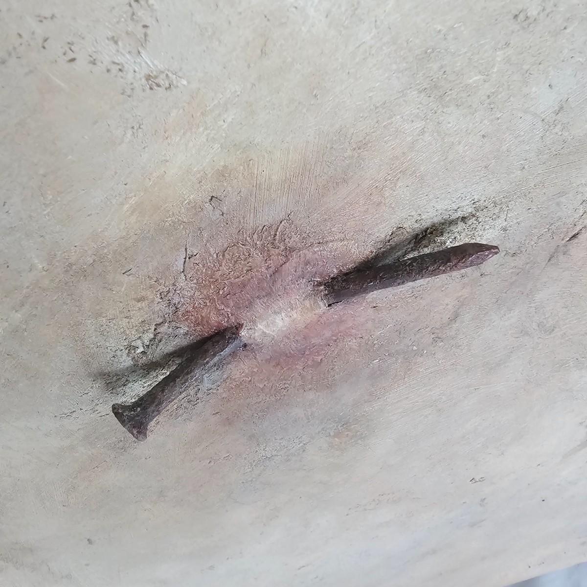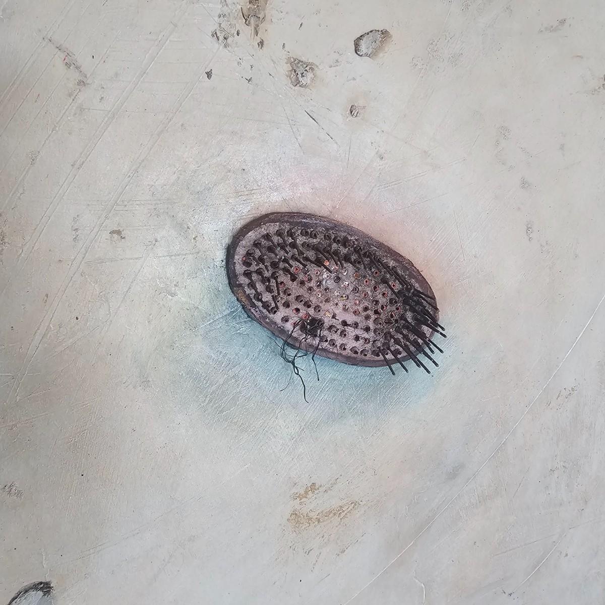 Tan/pinkish backgrounds highlight a single object on each of these Joyce Blunk creations. One single rusted metal brush minus most of its bristles. Additional art debris scattered on the surface. Second item is titled 'Pierced', is signed by artist, has rusty large nail appearing out of base. Both items are wood frame with Masonite fronts, measure 16" x 20.5"H. See photos for details. Shipping available. Shipping can be costly. We suggest contacting our preferred local shipping provider, Postage Express, with dimensions and getting an estimate before bidding: (828) 255-9250 or shipping@postageexpressnc.com.
