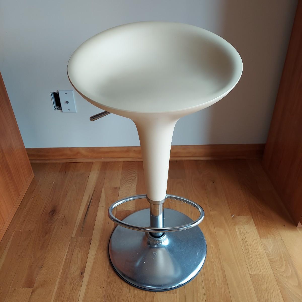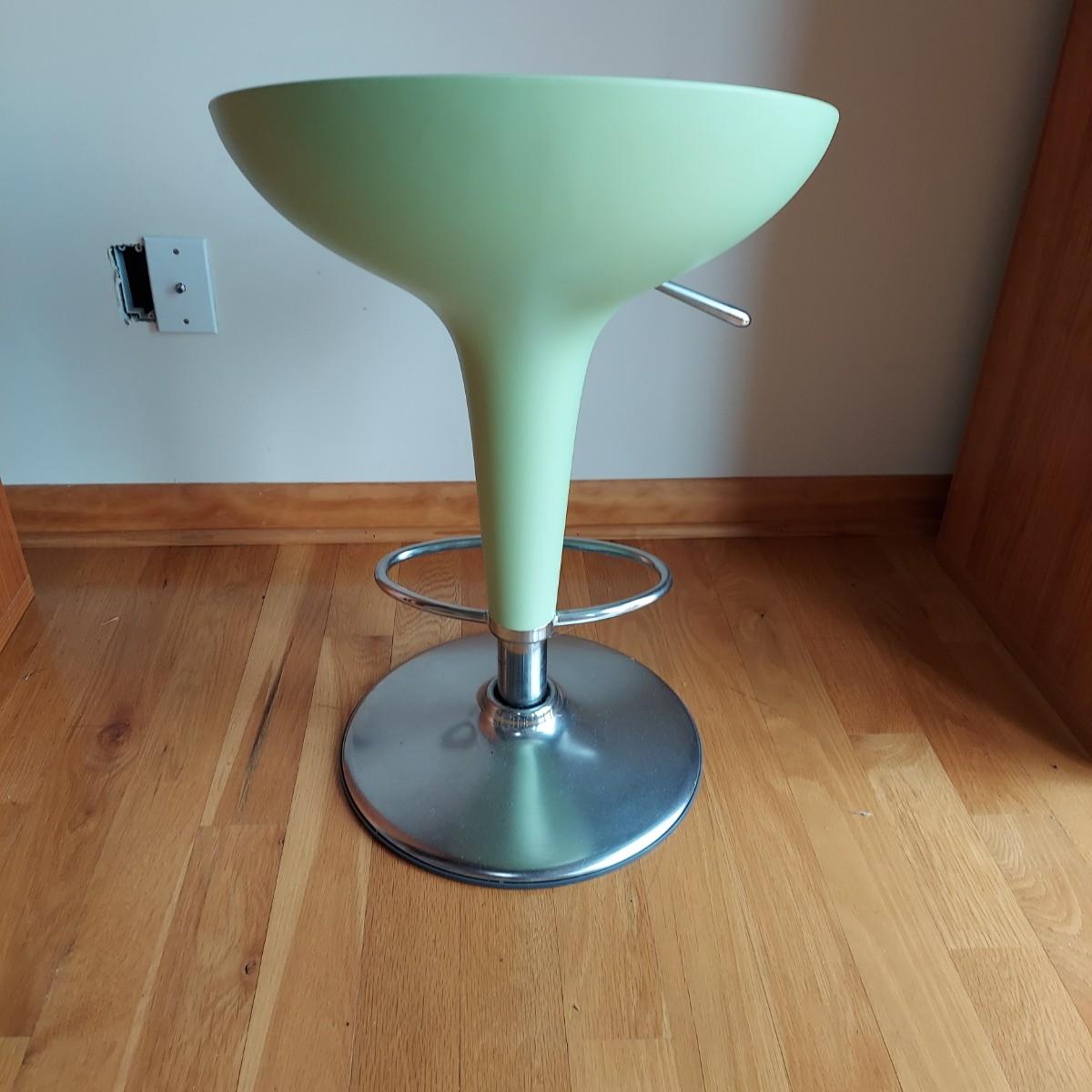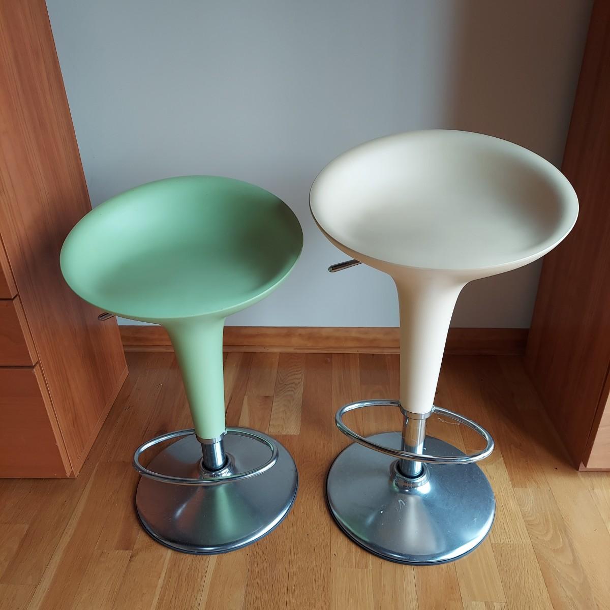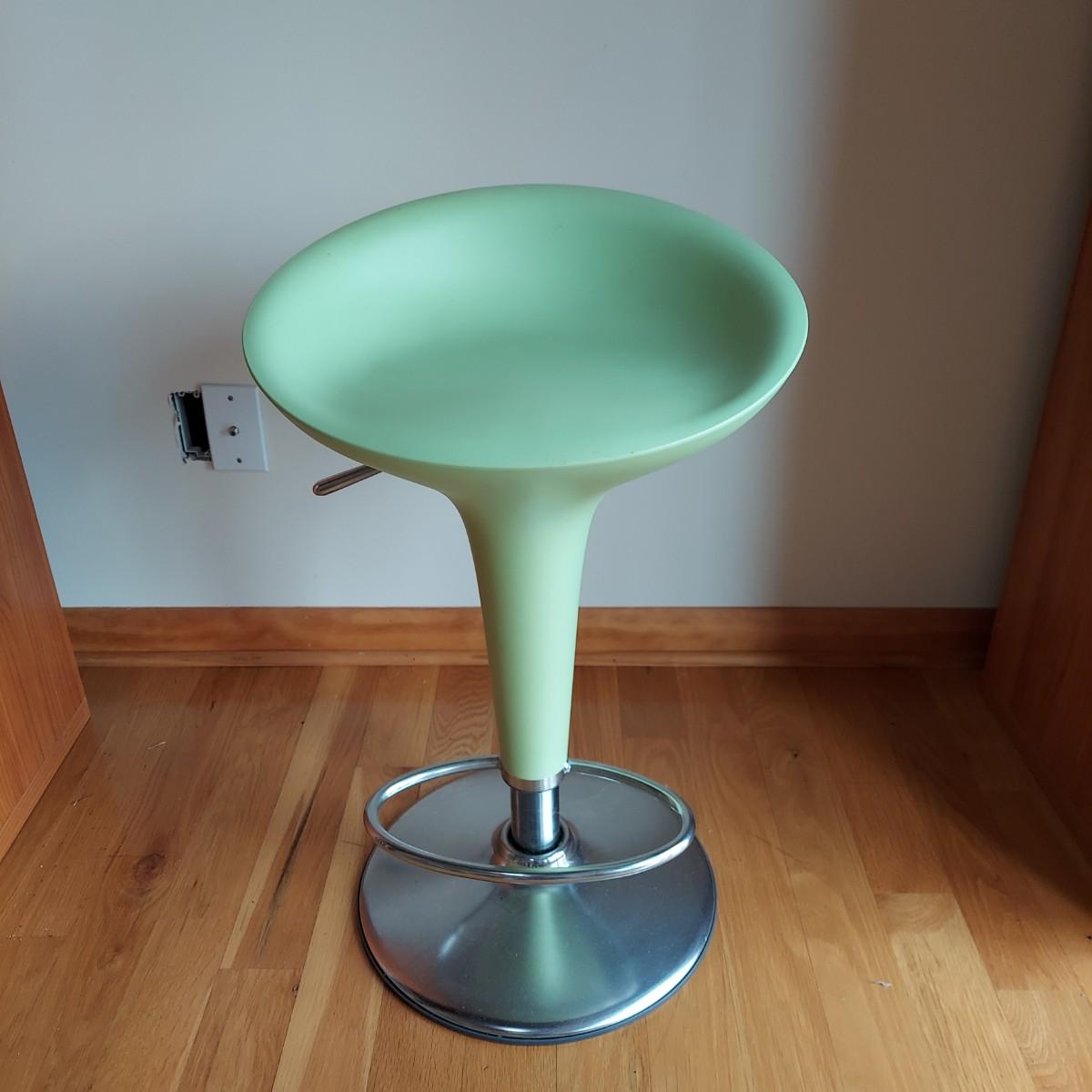 Two Magis Bombo swivel stools with adjustable height. They have a chromed steel base with injection mold seats. One is pale yellow. One is light green. They have a matt finish. Seat is 17.5" wide. Base has 15" diameter. Both are height adjustable, with seat heights ranging from as low as 19.5” to 30”H. Local Pickup Only.
