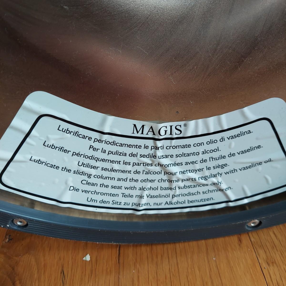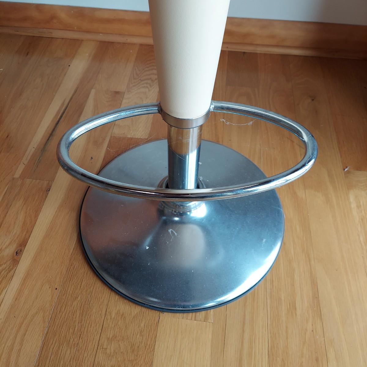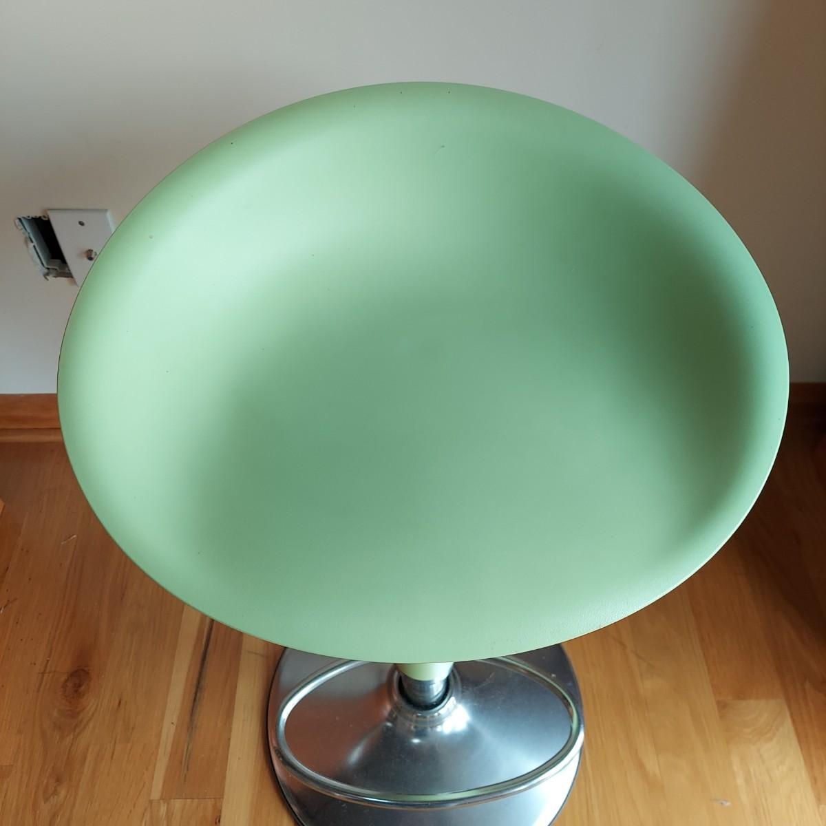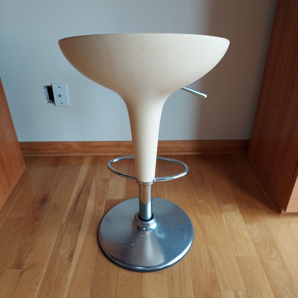 Two Magis Bombo swivel stools with adjustable height. They have a chromed steel base with injection mold seats. One is pale yellow. One is light green. They have a matt finish. Seat is 17.5" wide. Base has 15" diameter. Both are height adjustable, with seat heights ranging from as low as 19.5” to 30”H. Local Pickup Only.