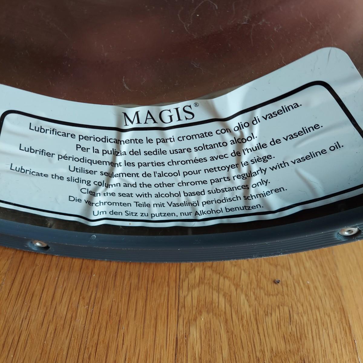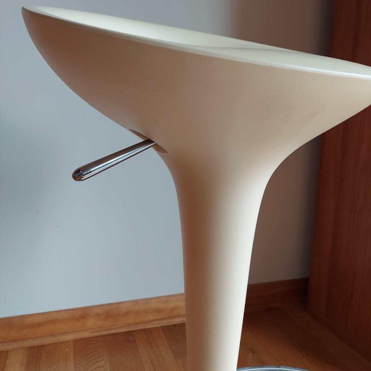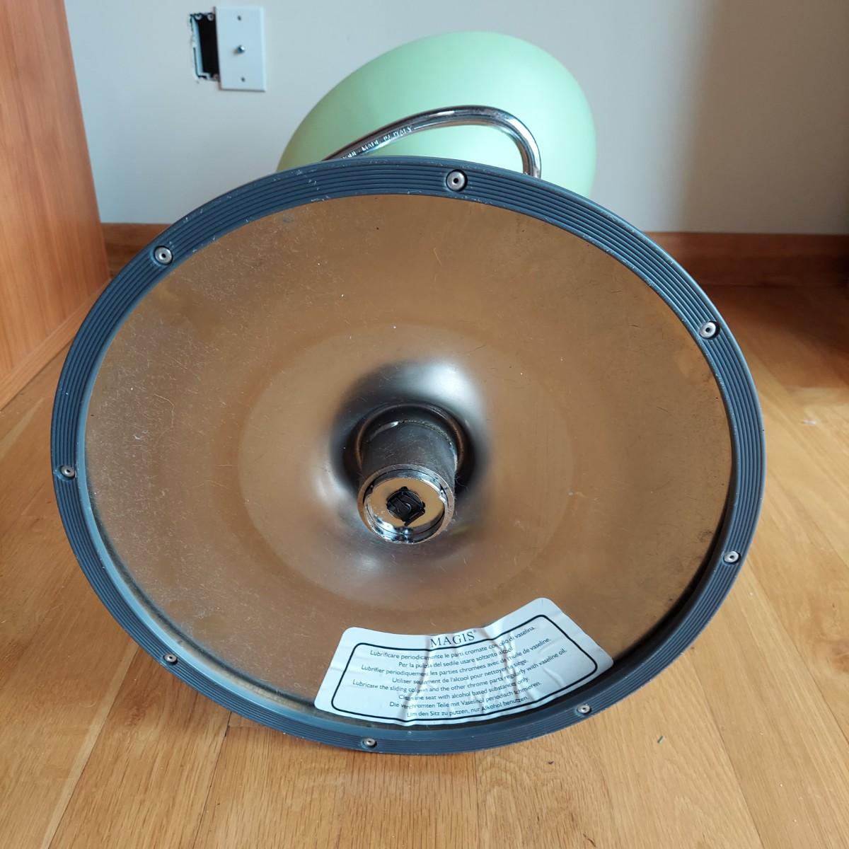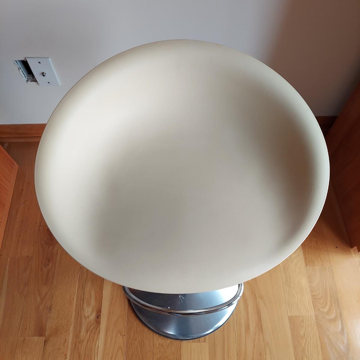 Two Magis Bombo swivel stools with adjustable height. They have a chromed steel base with injection mold seats. One is pale yellow. One is light green. They have a matt finish. Seat is 17.5" wide. Base has 15" diameter. Both are height adjustable, with seat heights ranging from as low as 19.5” to 30”H. Local Pickup Only.