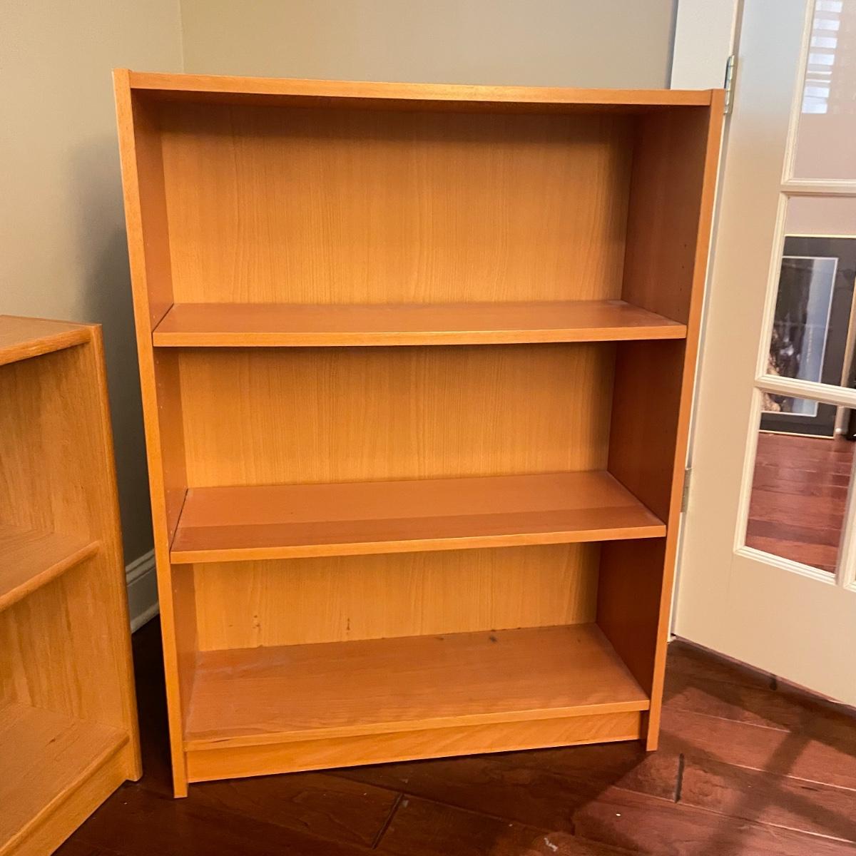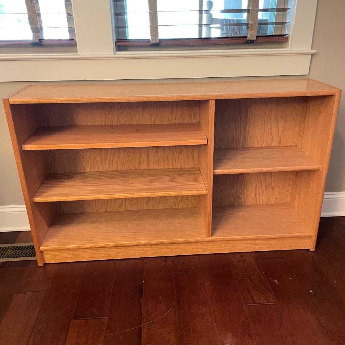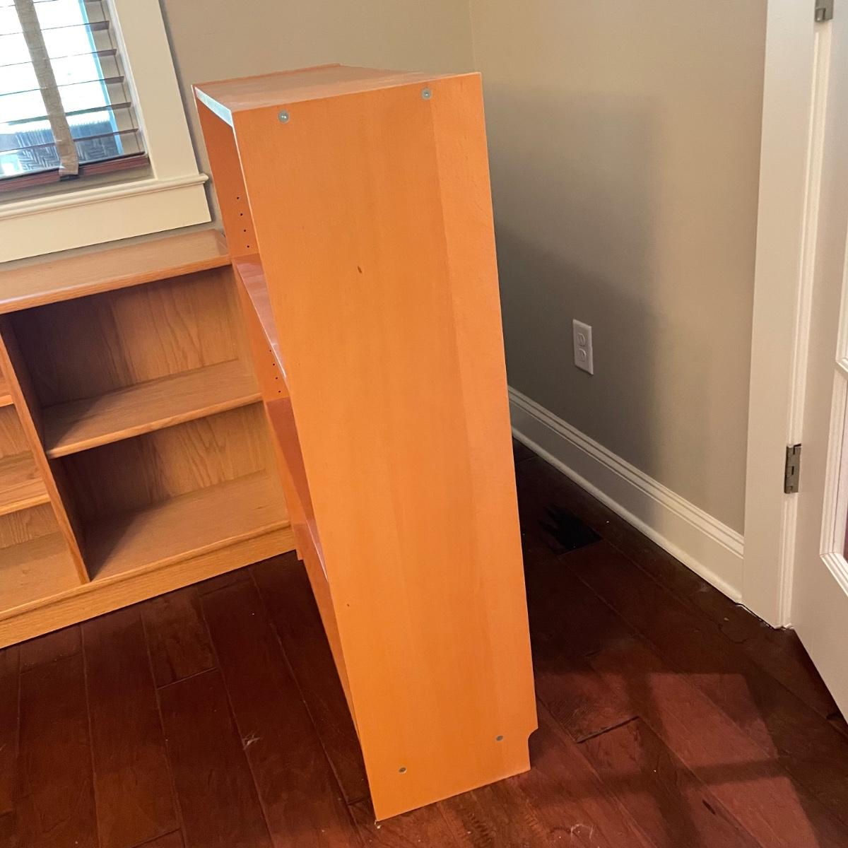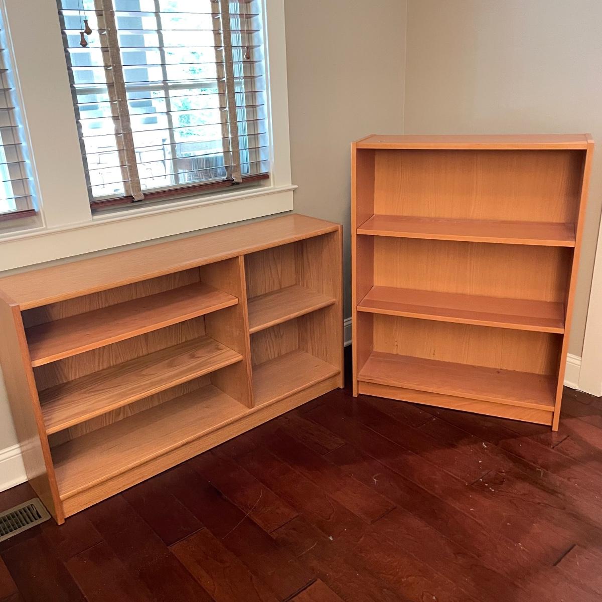 Two light colored mid-sized bookshelf units; one long and one taller. Both appear to be very sturdy. The taller is a bit warmer in color and measures 31.5” x 11” x 41.75"H. The shorter/longer unit has a light oak colored stain and measures 49” x 11.25” x 29”H. The taller is pressed wood, the longer shelf appears to be a mix of both solid and pressed wood. See images. Local pick up only. Winning bidder must bring assistance to help move and load this item due to its weight and/or size. The items will ned to be moved down three steps.