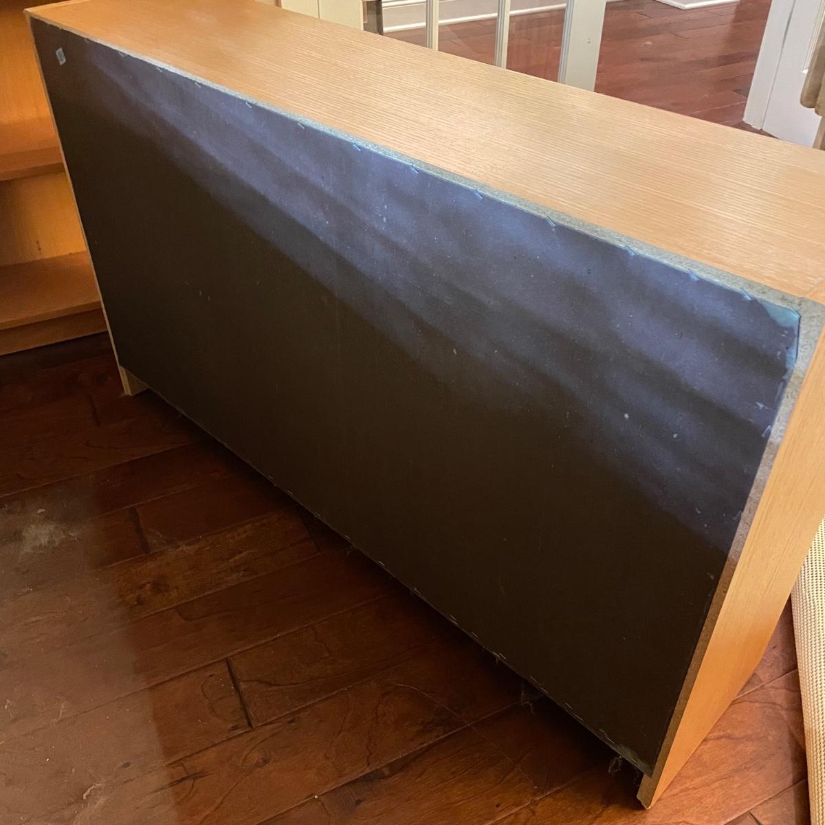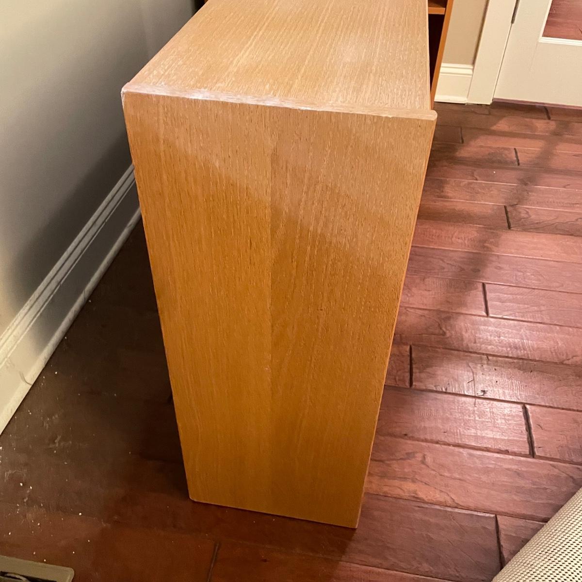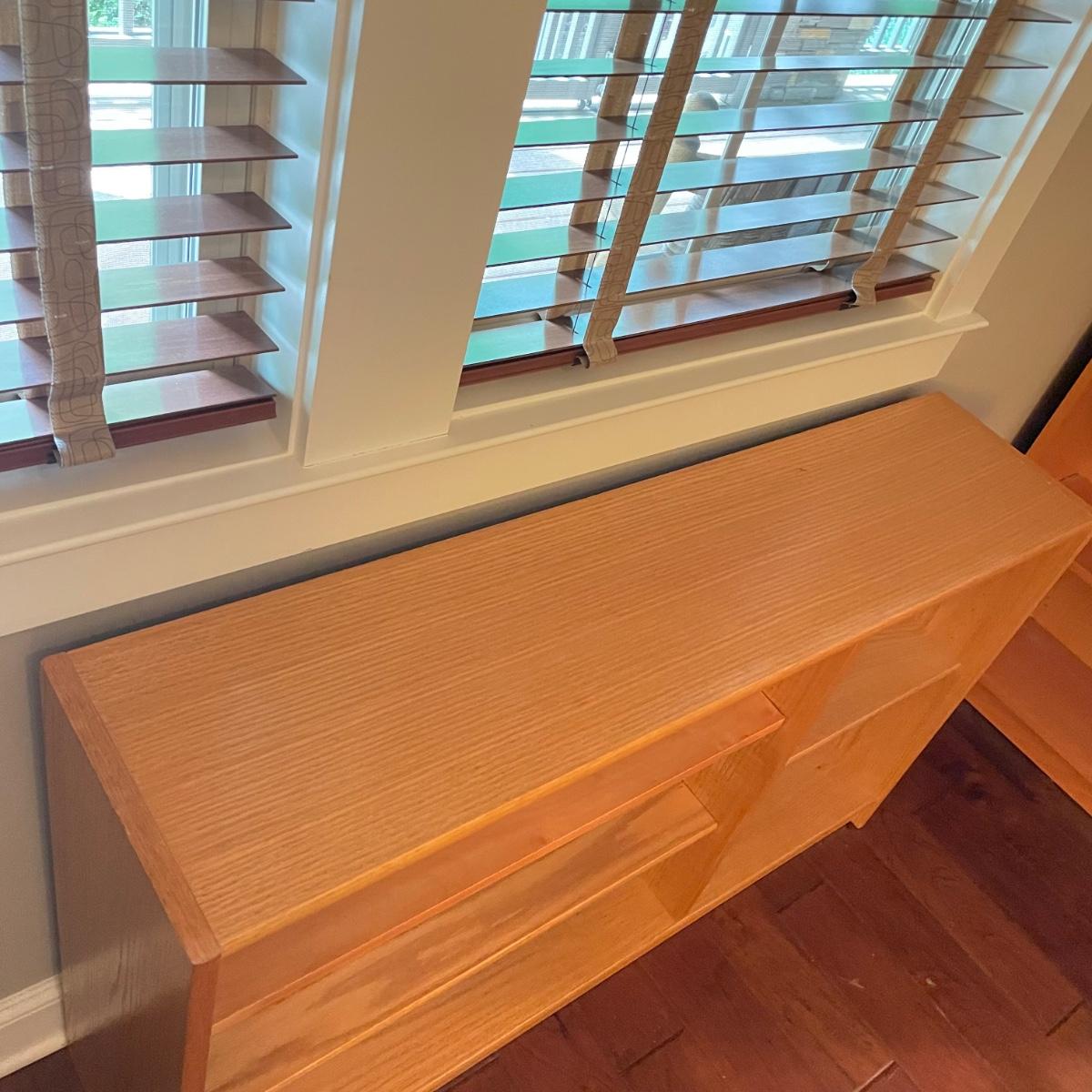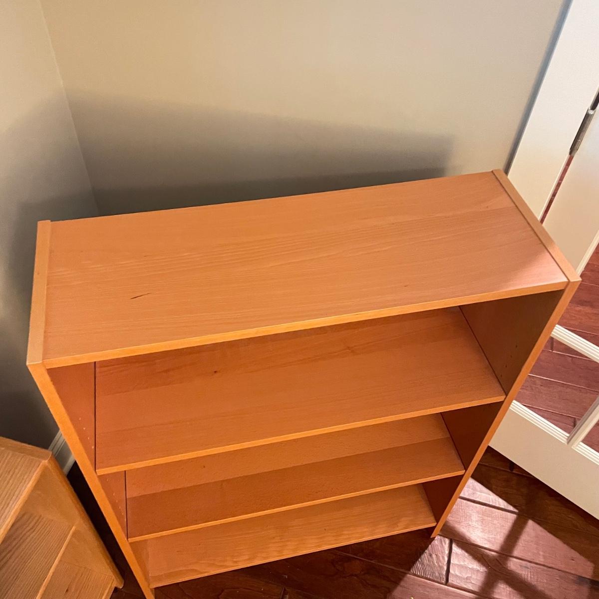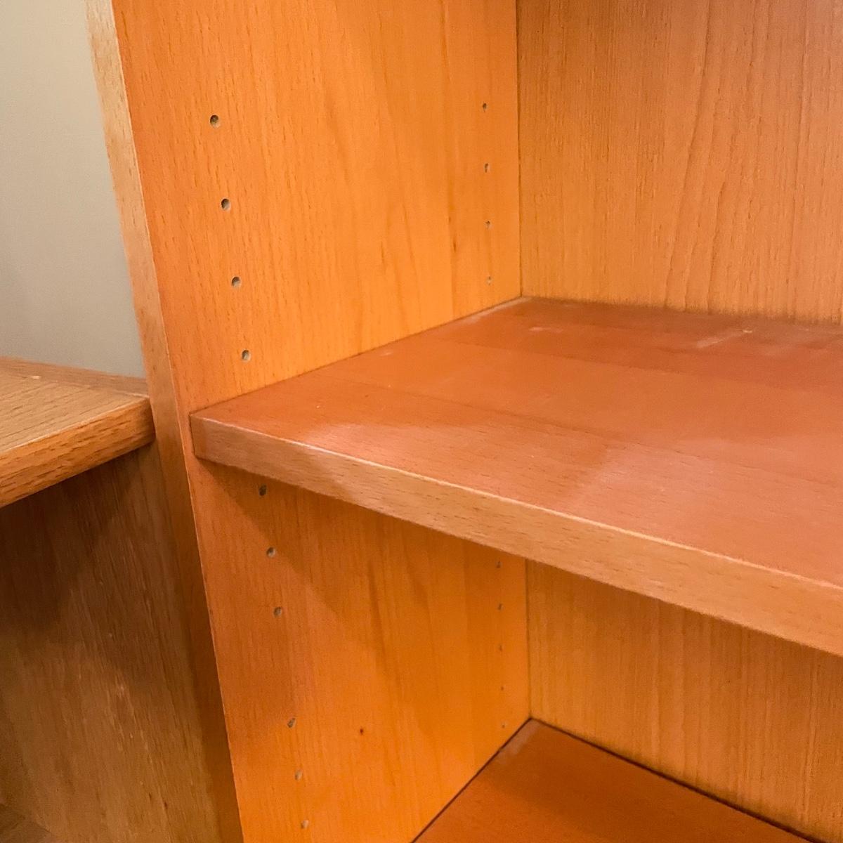 Two light colored mid-sized bookshelf units; one long and one taller. Both appear to be very sturdy. The taller is a bit warmer in color and measures 31.5” x 11” x 41.75"H. The shorter/longer unit has a light oak colored stain and measures 49” x 11.25” x 29”H. The taller is pressed wood, the longer shelf appears to be a mix of both solid and pressed wood. See images. Local pick up only. Winning bidder must bring assistance to help move and load this item due to its weight and/or size. The items will ned to be moved down three steps.