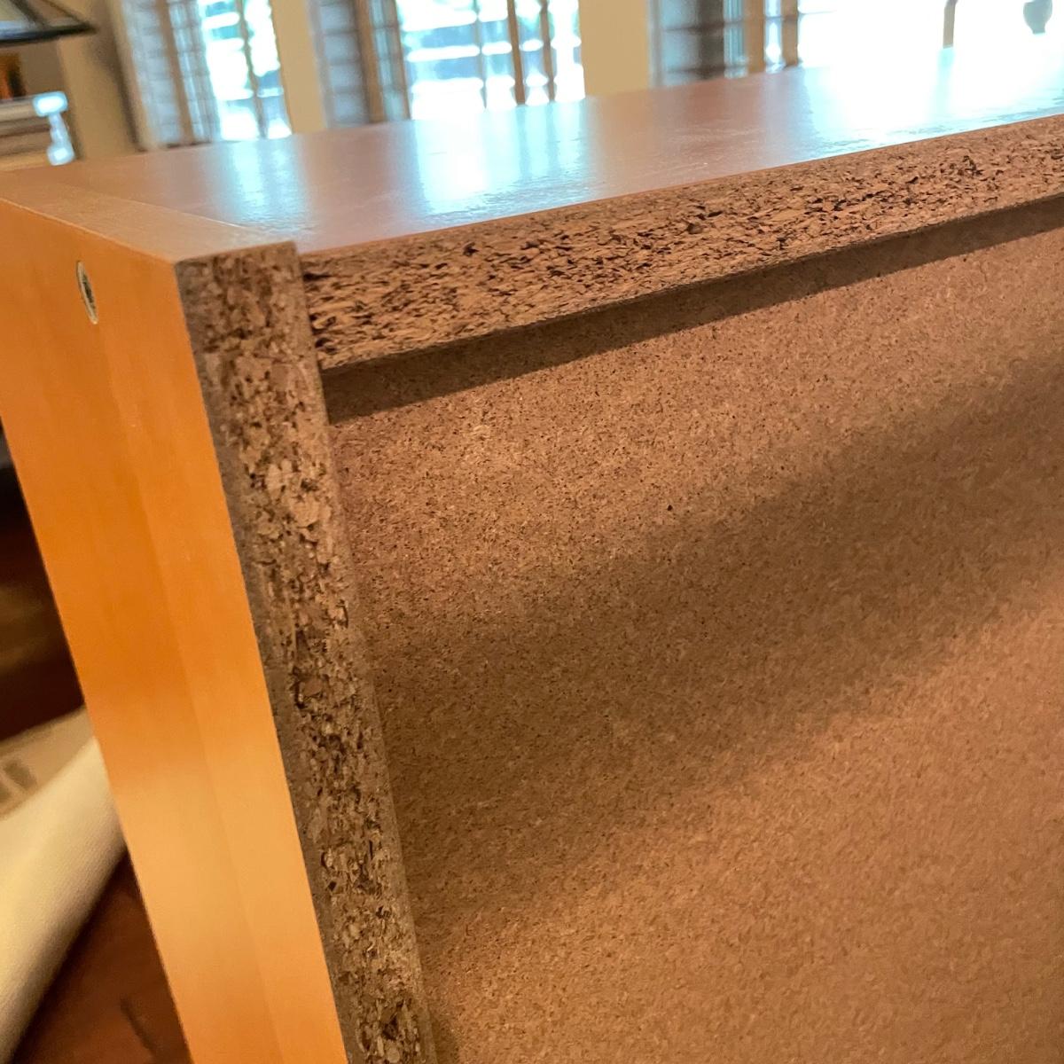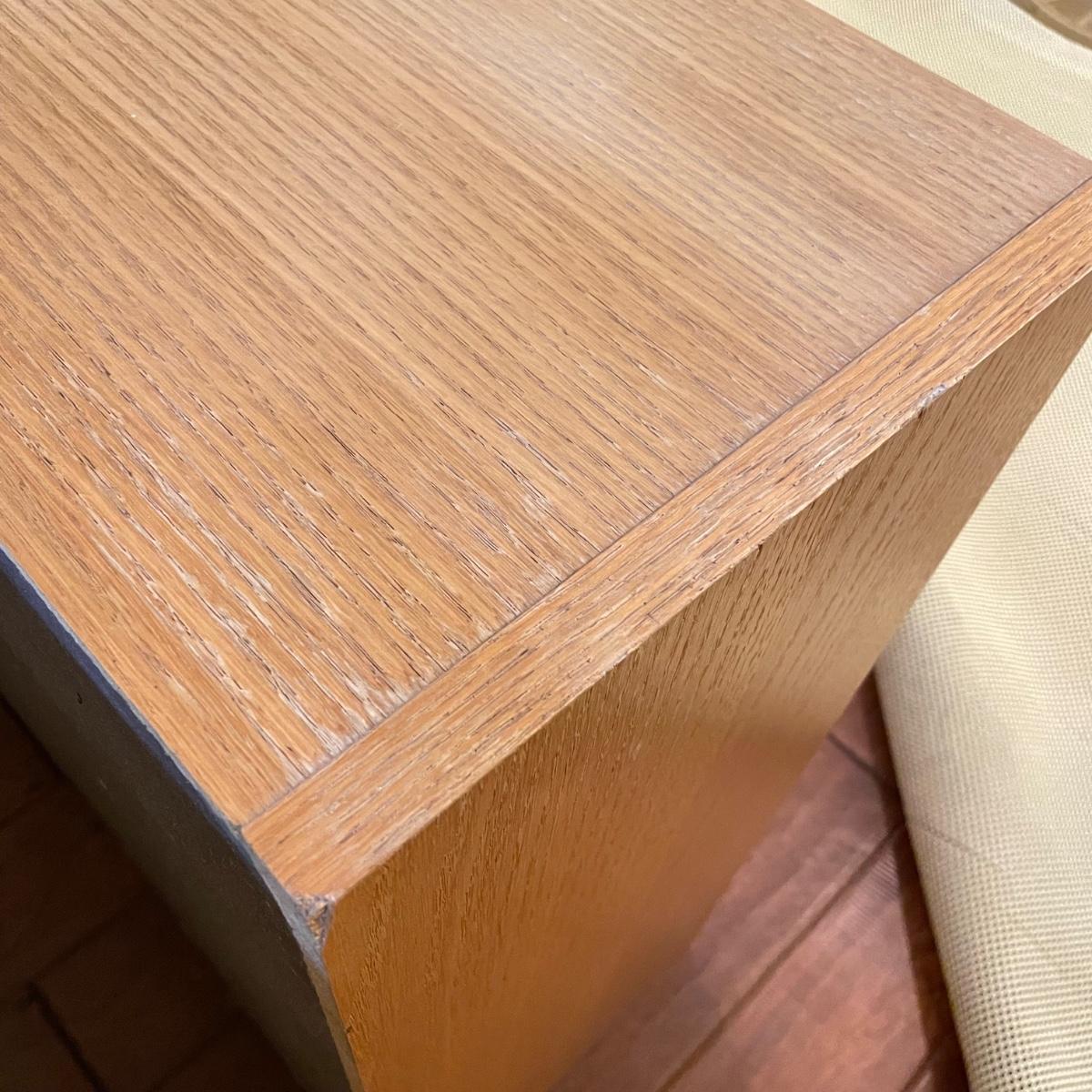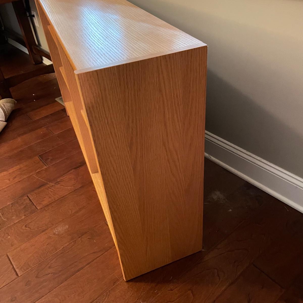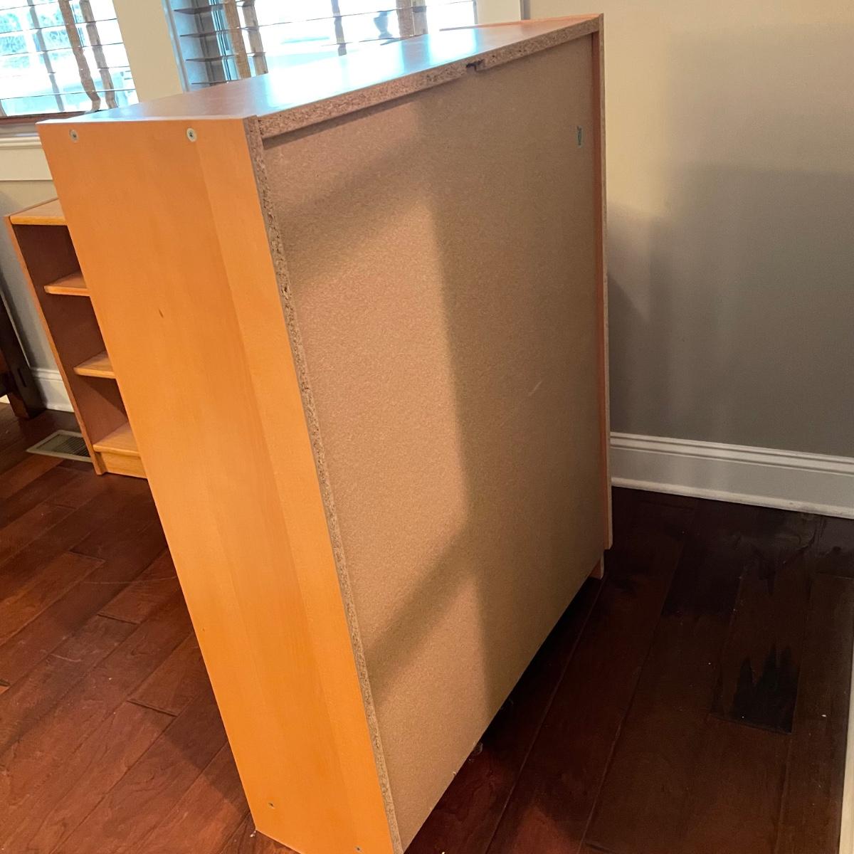 Two light colored mid-sized bookshelf units; one long and one taller. Both appear to be very sturdy. The taller is a bit warmer in color and measures 31.5” x 11” x 41.75"H. The shorter/longer unit has a light oak colored stain and measures 49” x 11.25” x 29”H. The taller is pressed wood, the longer shelf appears to be a mix of both solid and pressed wood. See images. Local pick up only. Winning bidder must bring assistance to help move and load this item due to its weight and/or size. The items will ned to be moved down three steps.