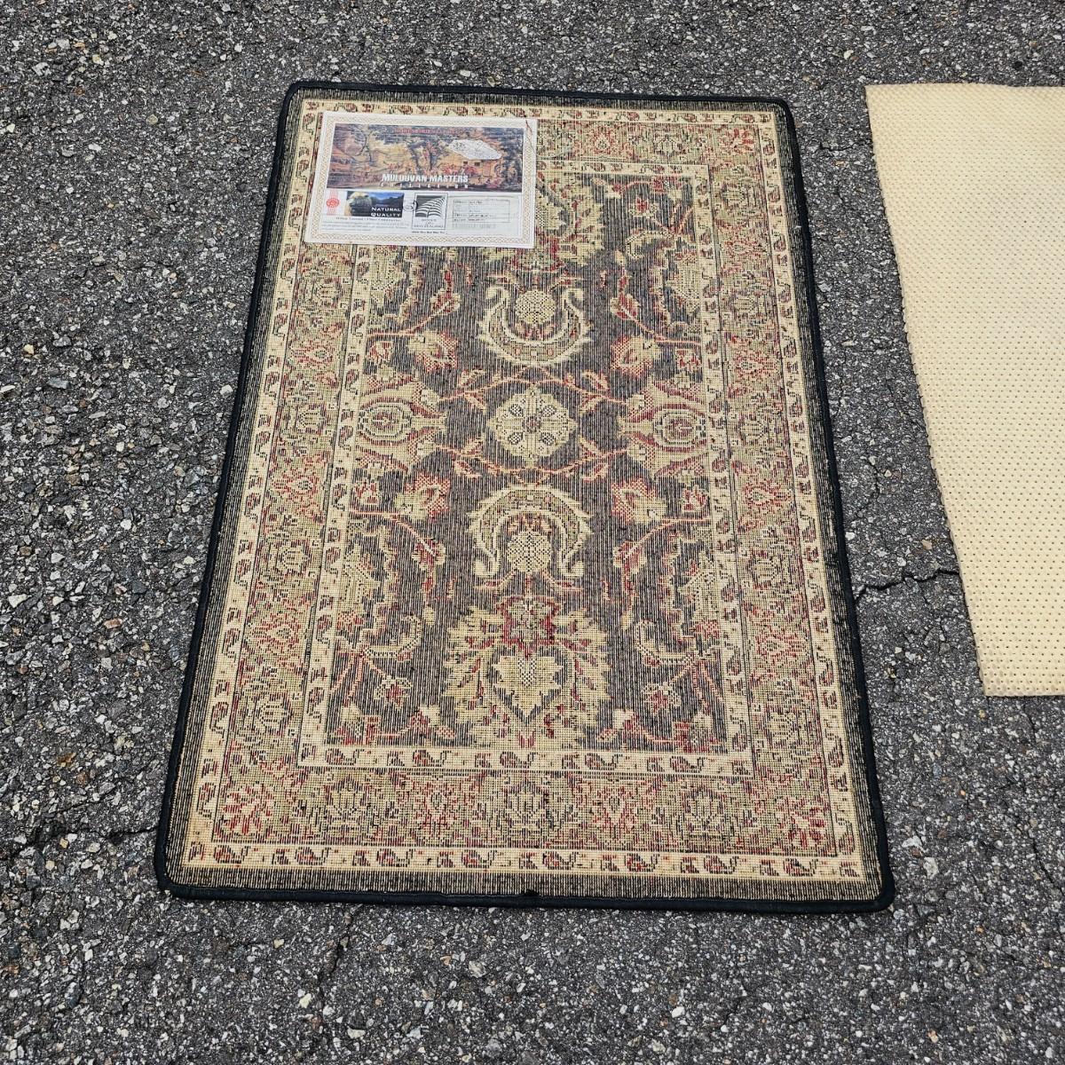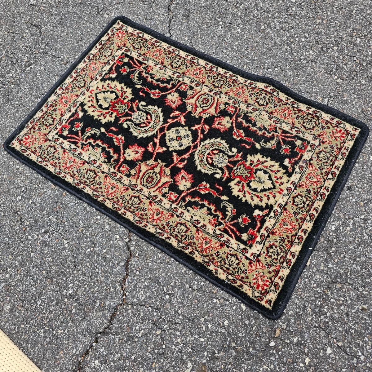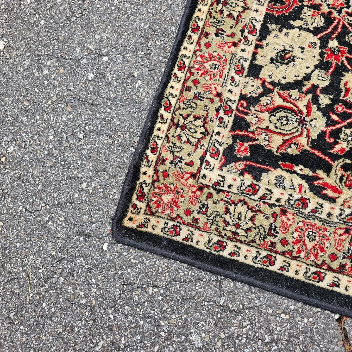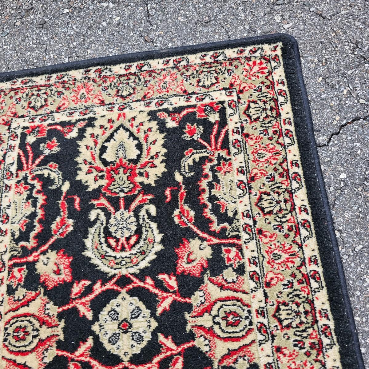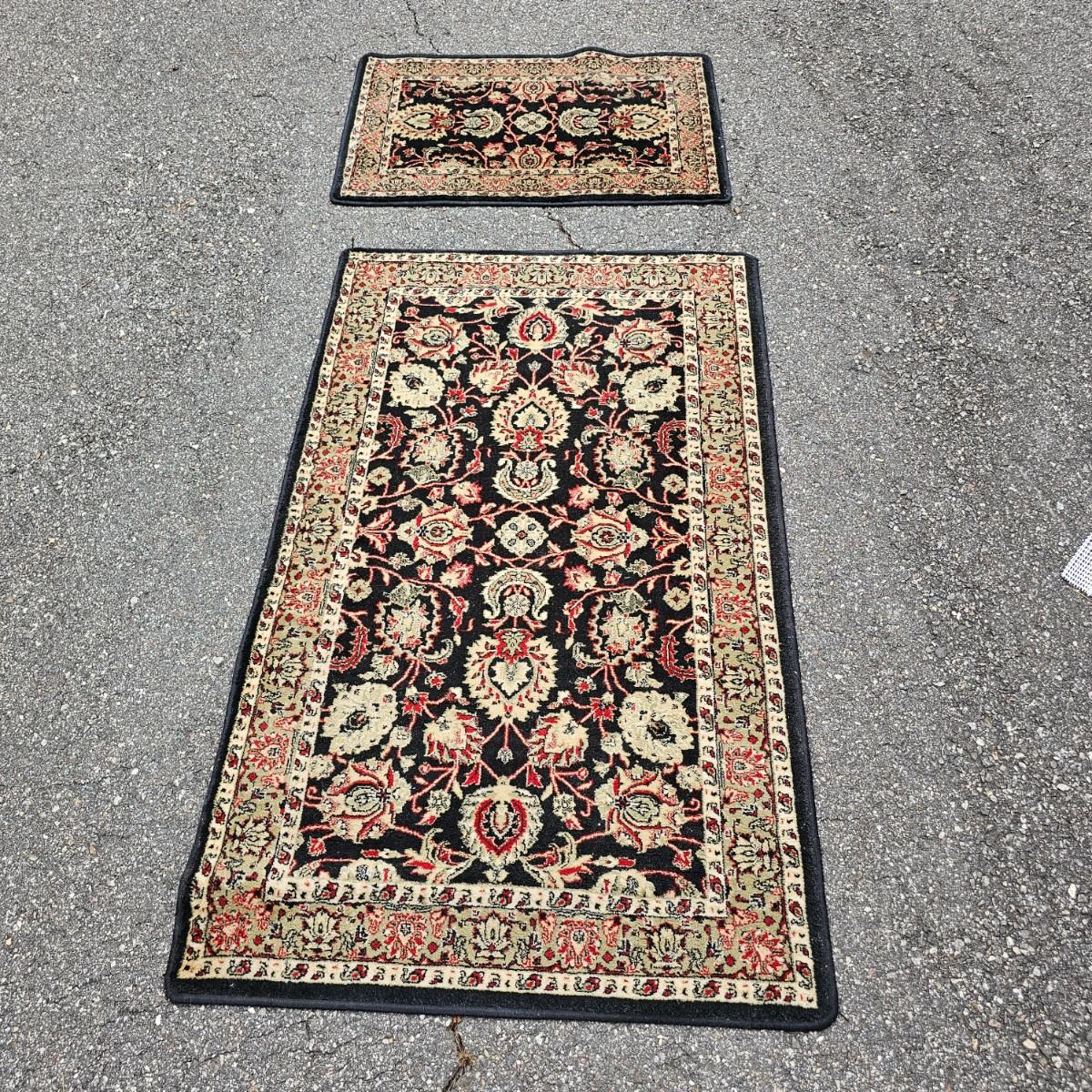 One 36" x 60" and one 24" x 36" matching wool rugs. Black and red patterning plus non-skid backing pieces. Made by Moren Oriental rugs, both are 100% wool pile. See photos for details. Local pickup only.