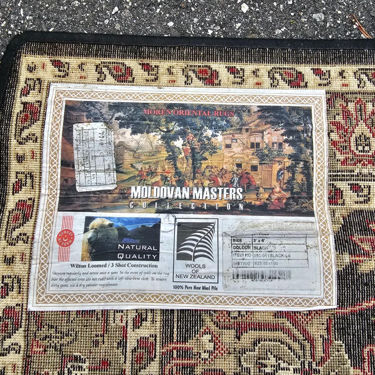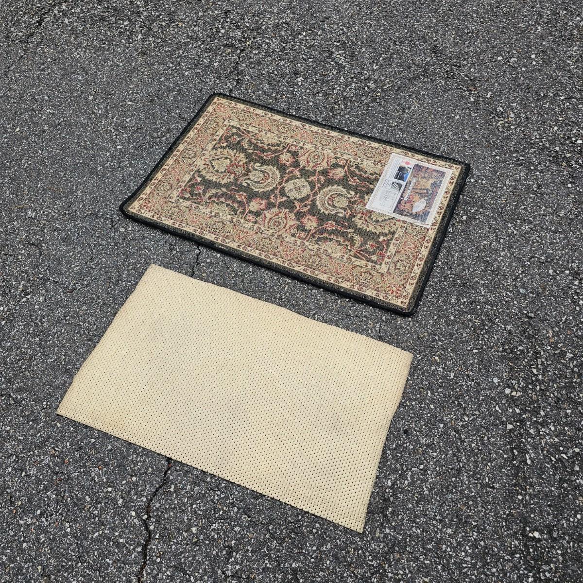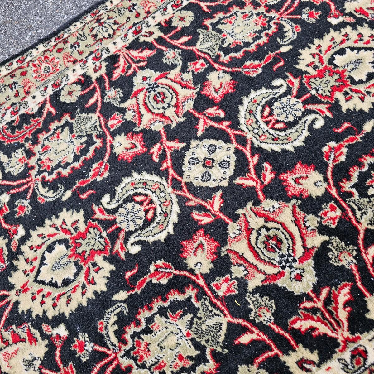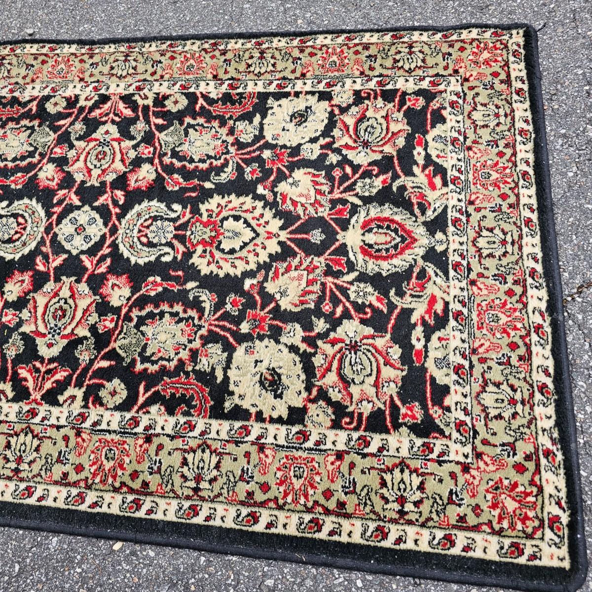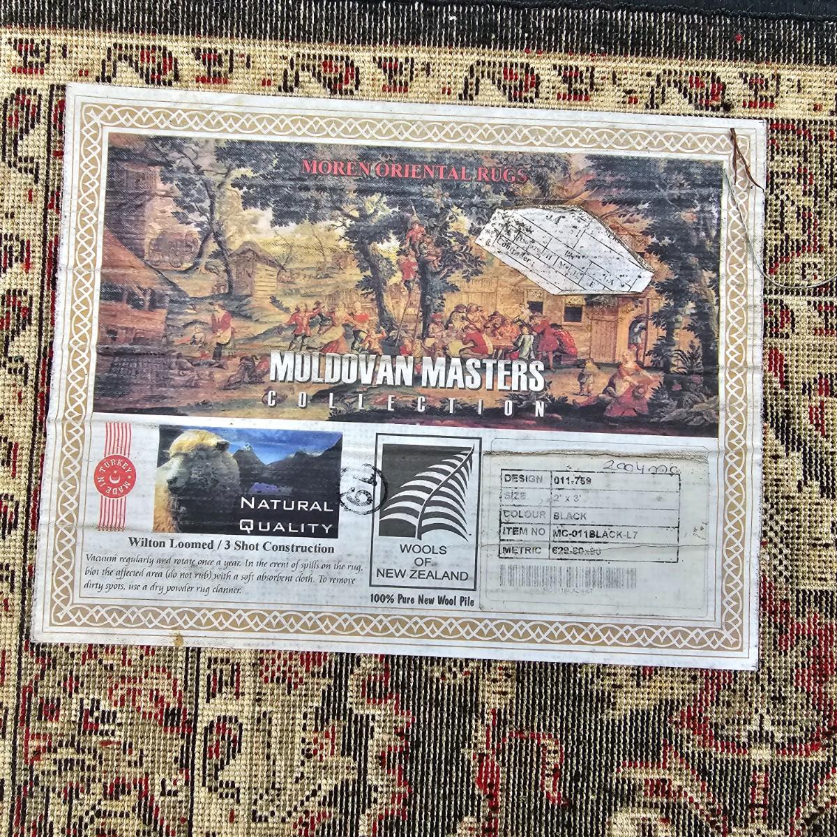 One 36" x 60" and one 24" x 36" matching wool rugs. Black and red patterning plus non-skid backing pieces. Made by Moren Oriental rugs, both are 100% wool pile. See photos for details. Local pickup only.