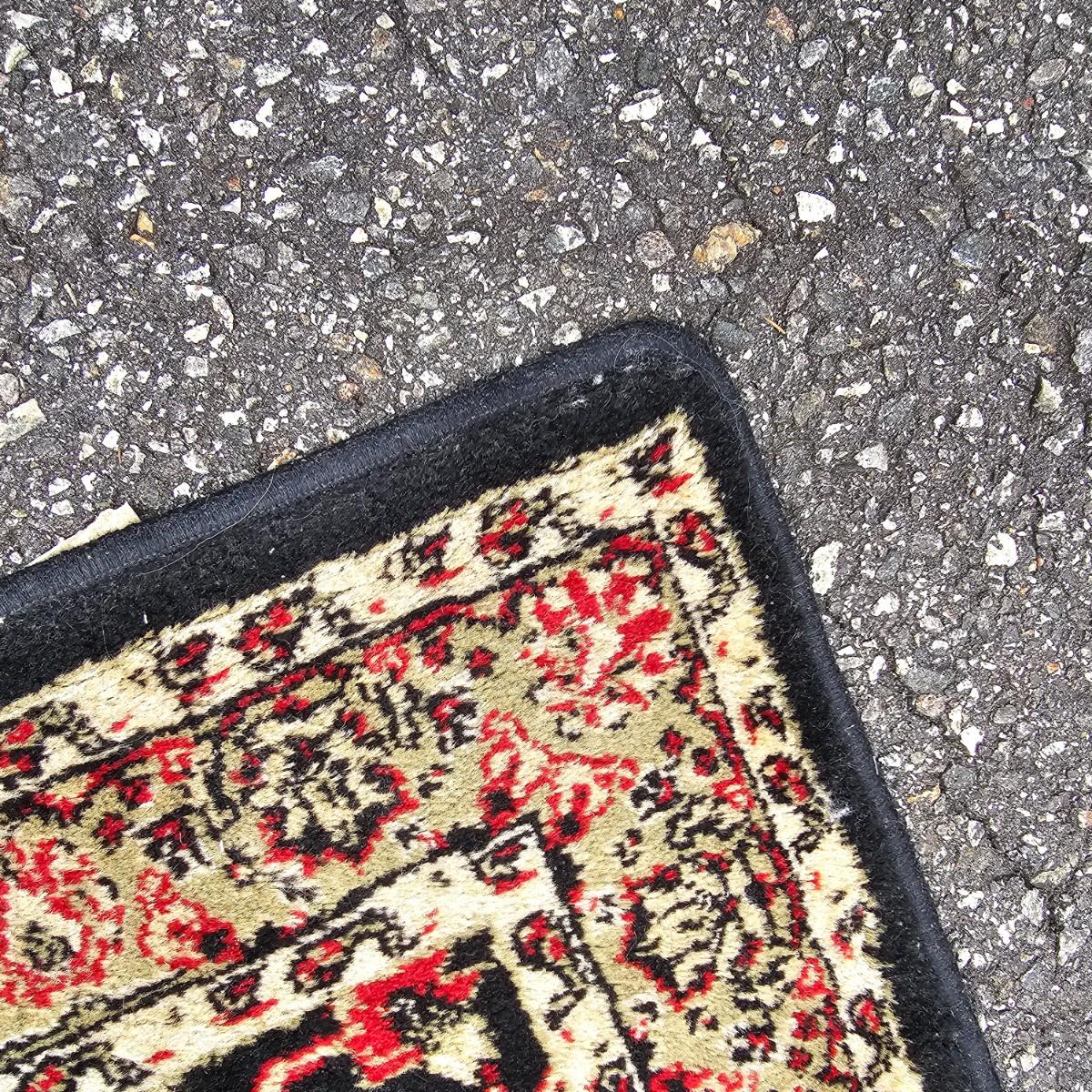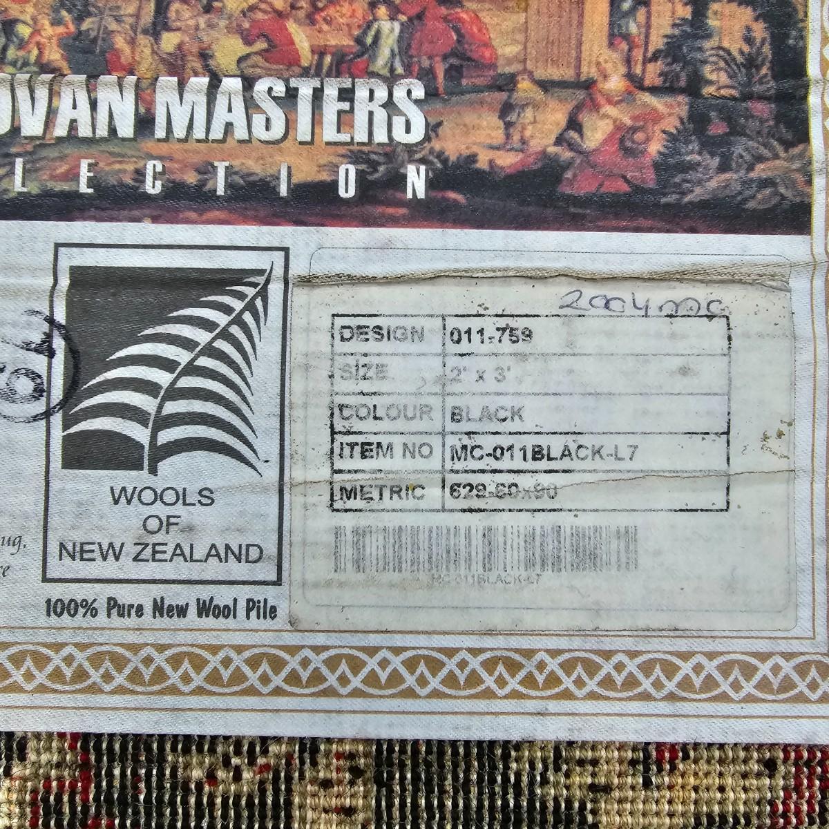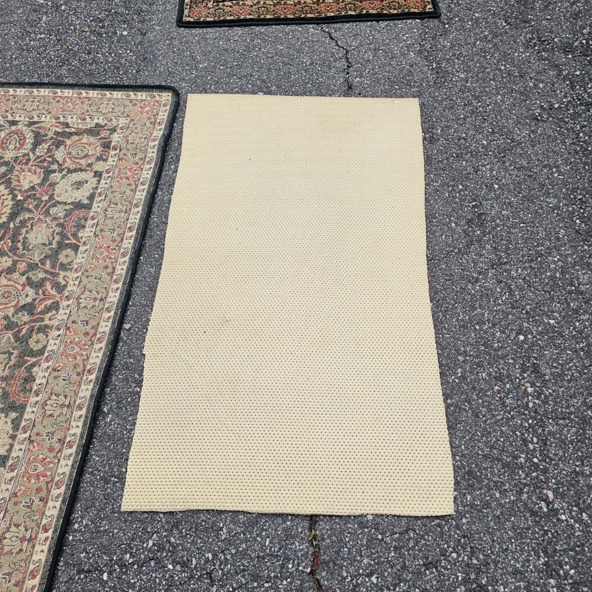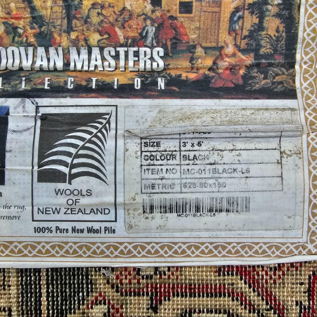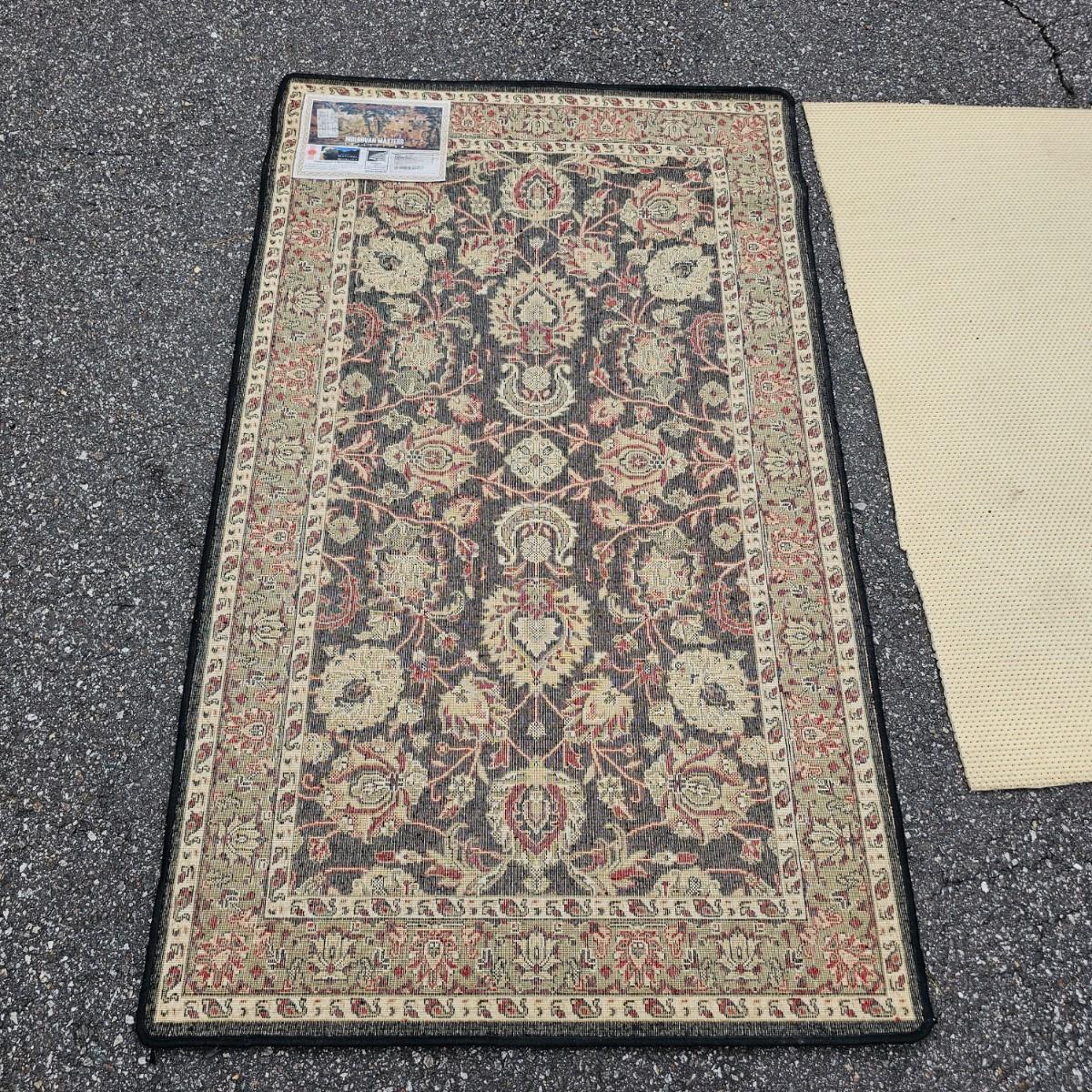 One 36" x 60" and one 24" x 36" matching wool rugs. Black and red patterning plus non-skid backing pieces. Made by Moren Oriental rugs, both are 100% wool pile. See photos for details. Local pickup only.