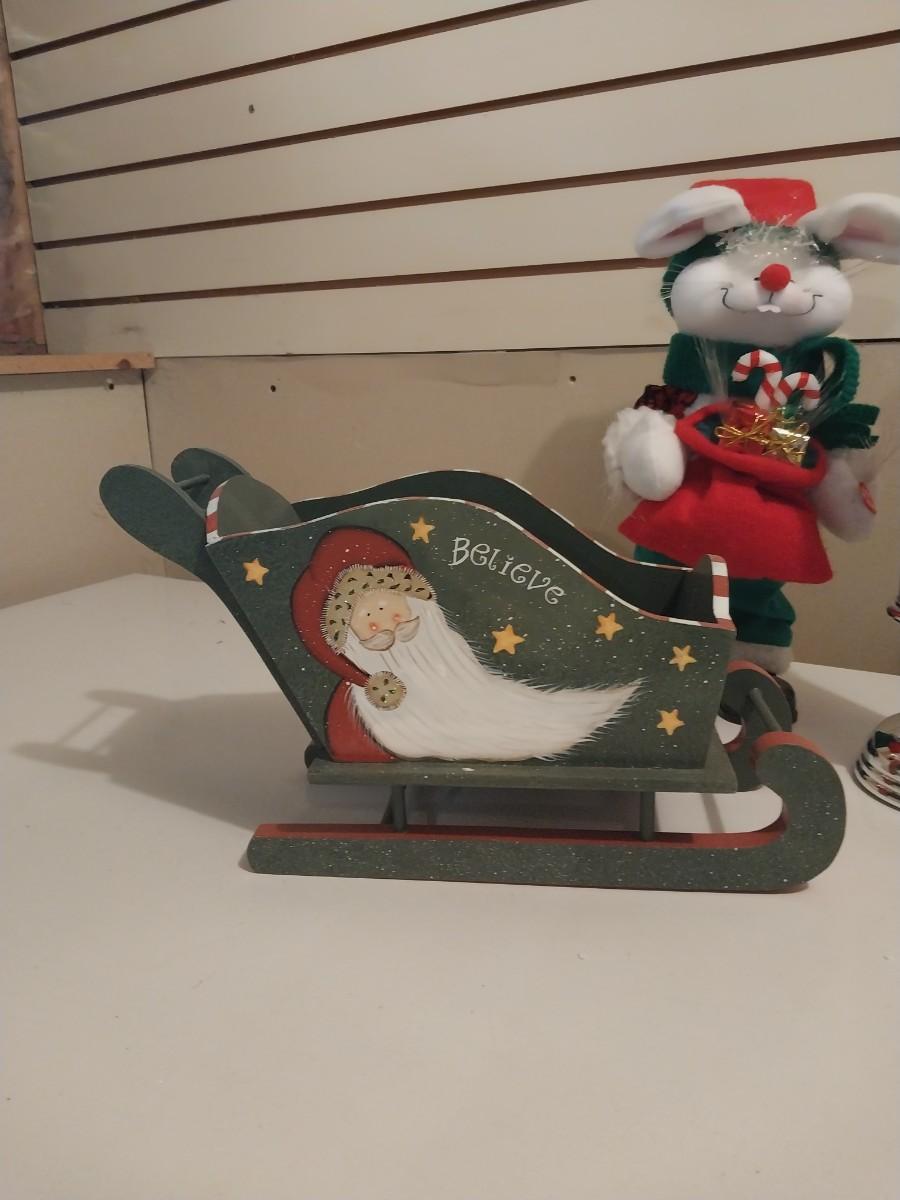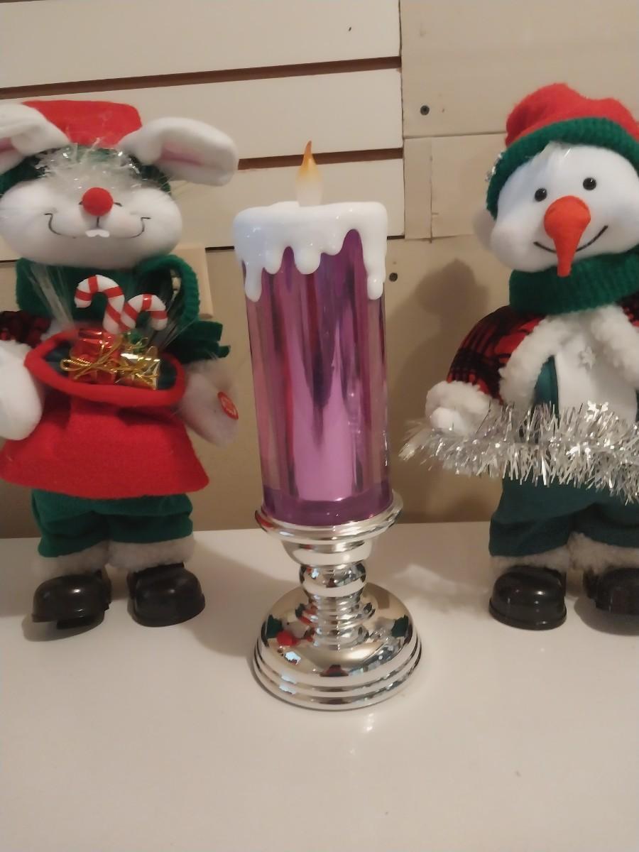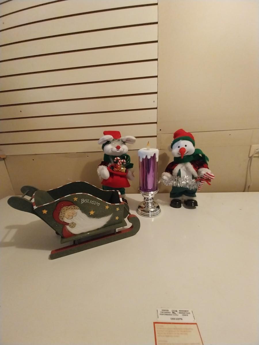 TWO MOTION PENGUINS-WOODEN SLEIGH-LIGHTUP CANDLESTICK