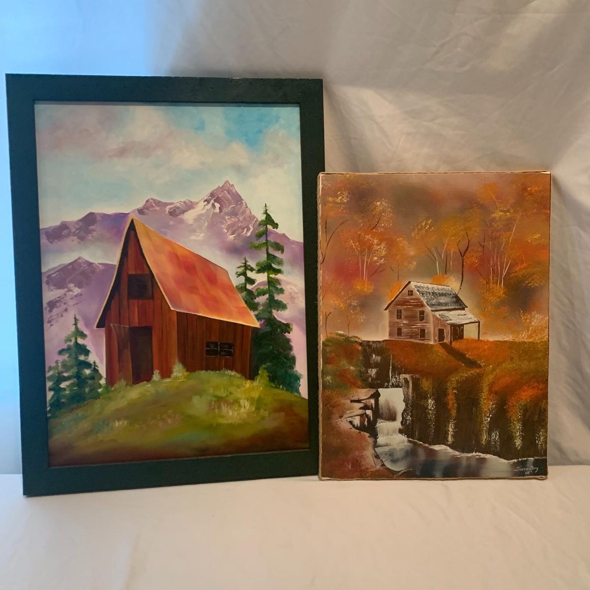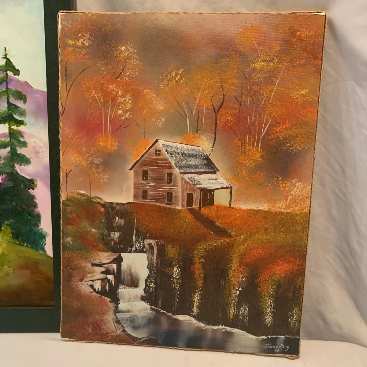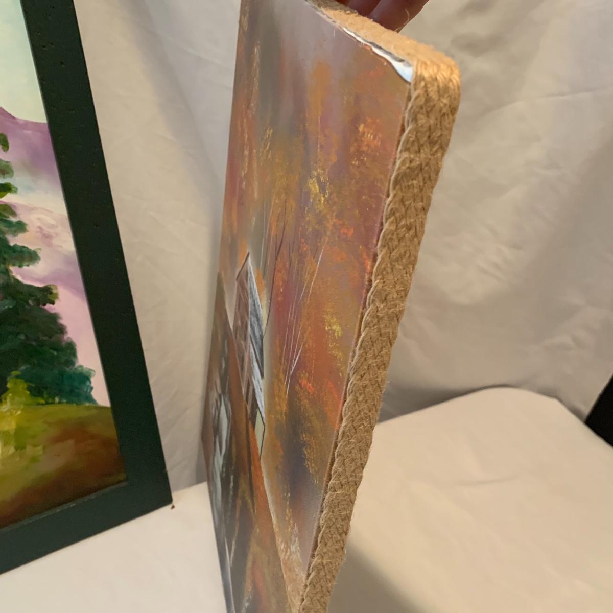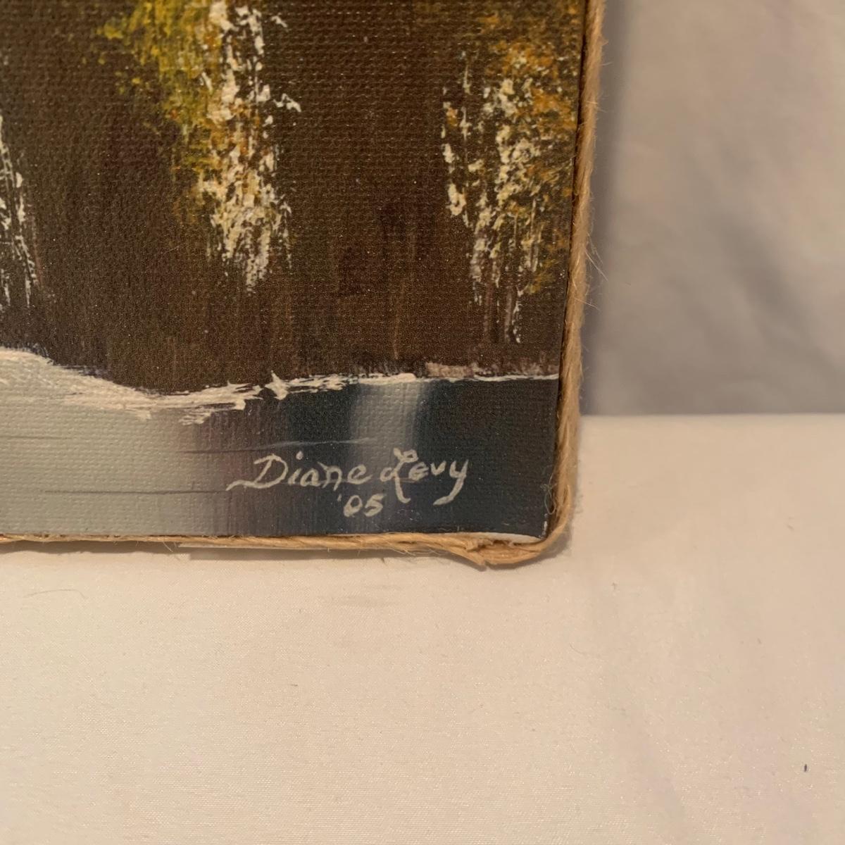 These two paintings by estate owner Diane Levy are acrylic on canvas. The larger one is framed and measures 18.5” x25” and smaller one has a ribbon around the canvas frame and measures 14” x19”. Shipping available, please note shipping art can be costly so you