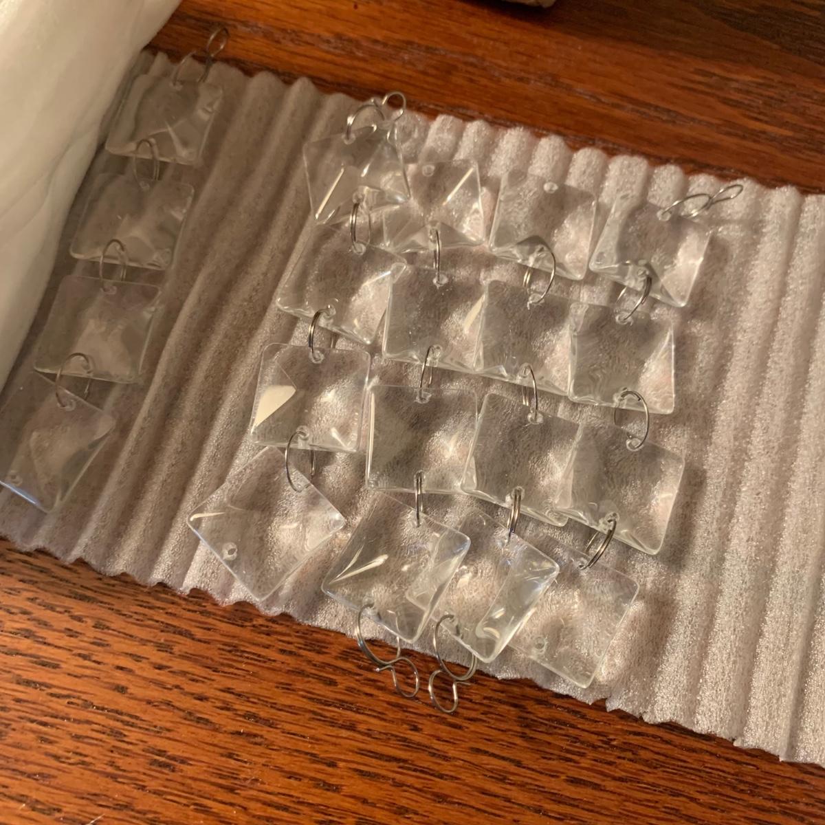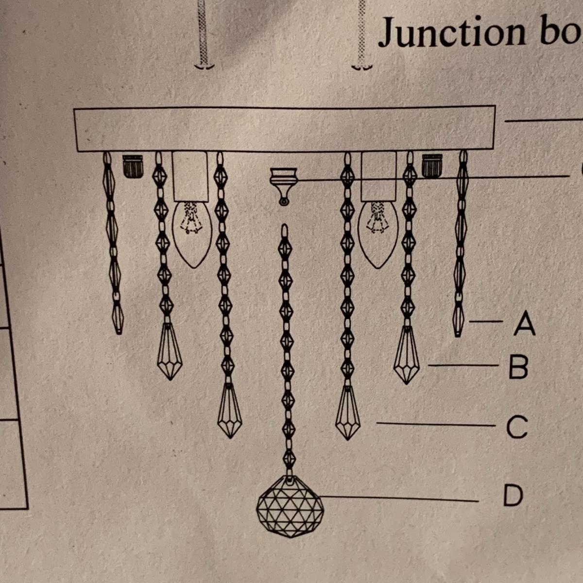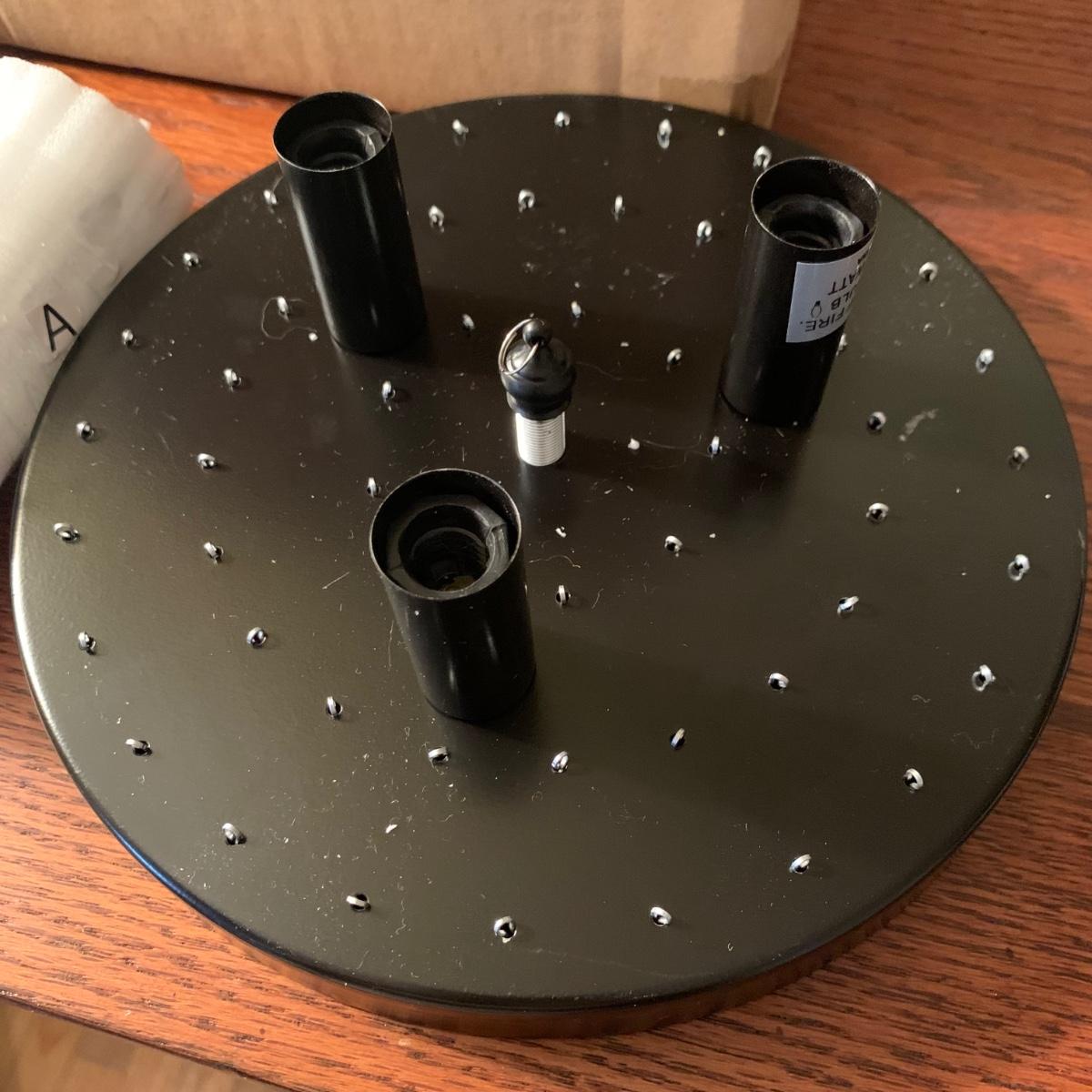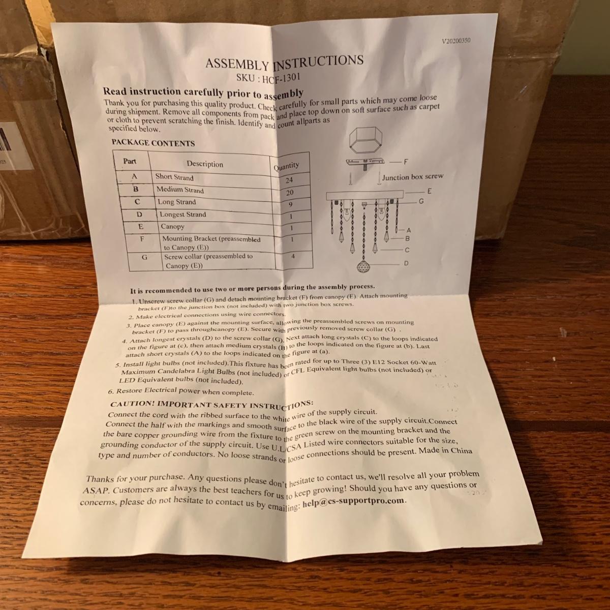 Two crystal mini chandeliers, new in their boxes. The metal mounting base is 8.5”D. Since the parts are wrapped up we cannot guarantee that all pieces are present. These are light fixtures to be hard wired. Please note that the picture showing the assembled chandelier is a picture of what these chandeliers are believed to look like, though it is not a guarantee that they will appear exactly like the photo shows.