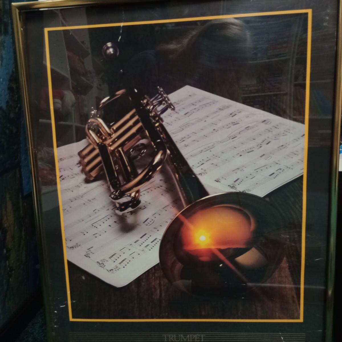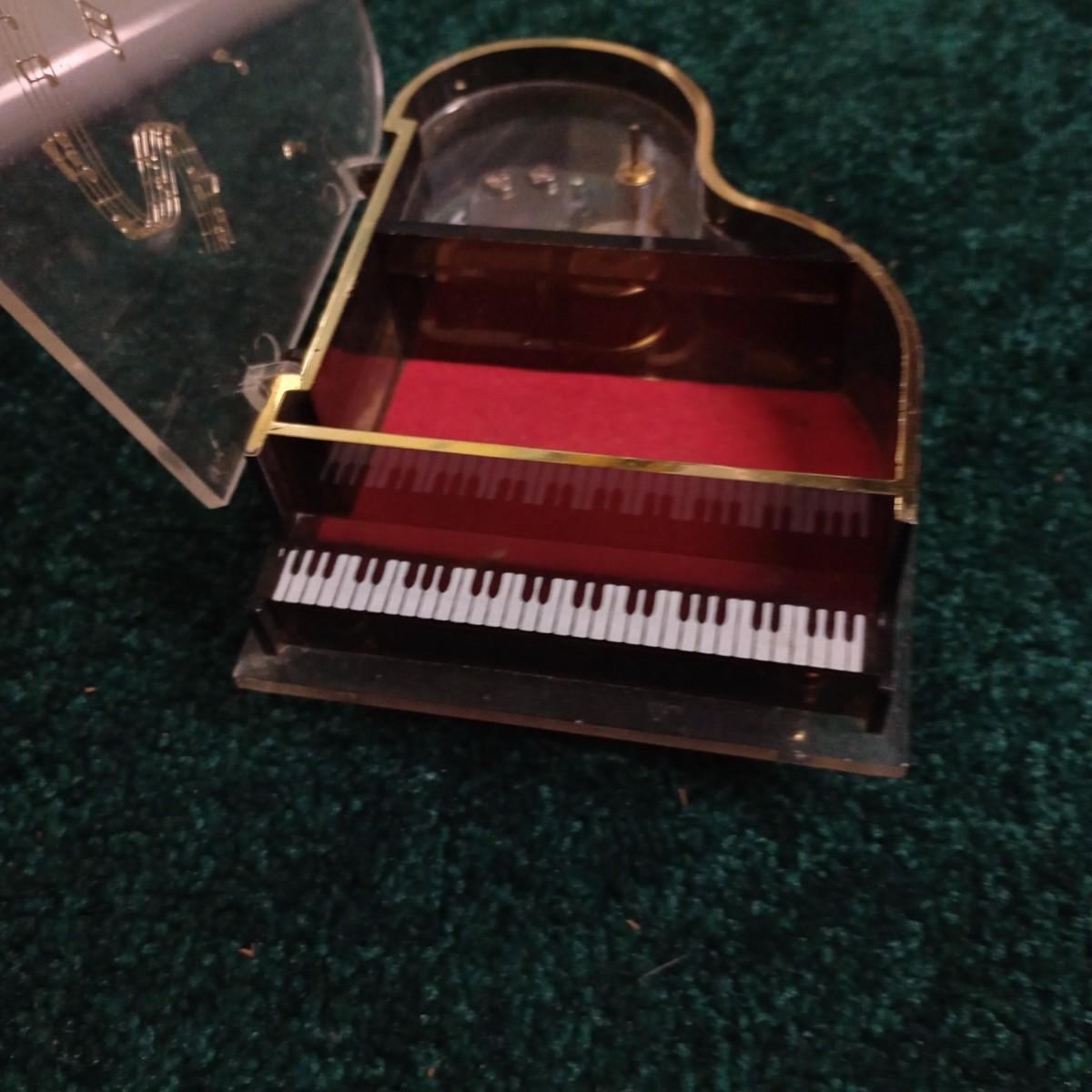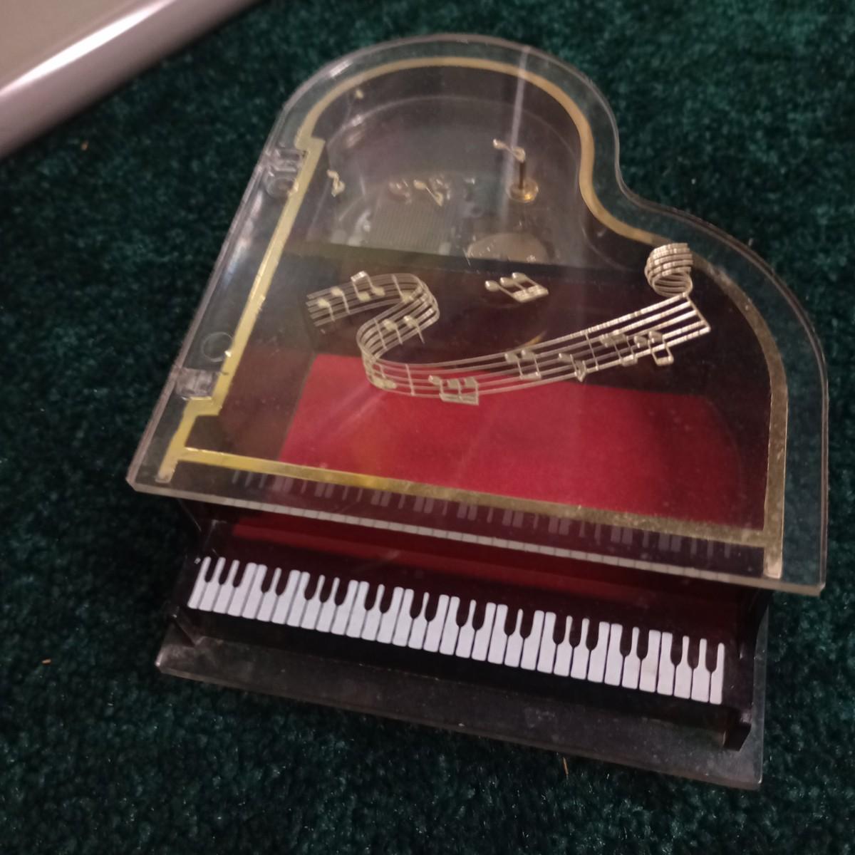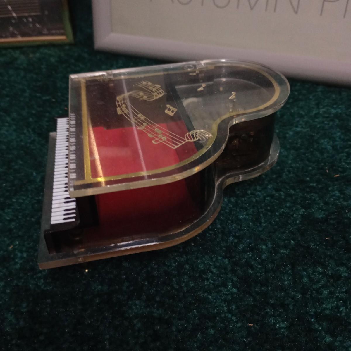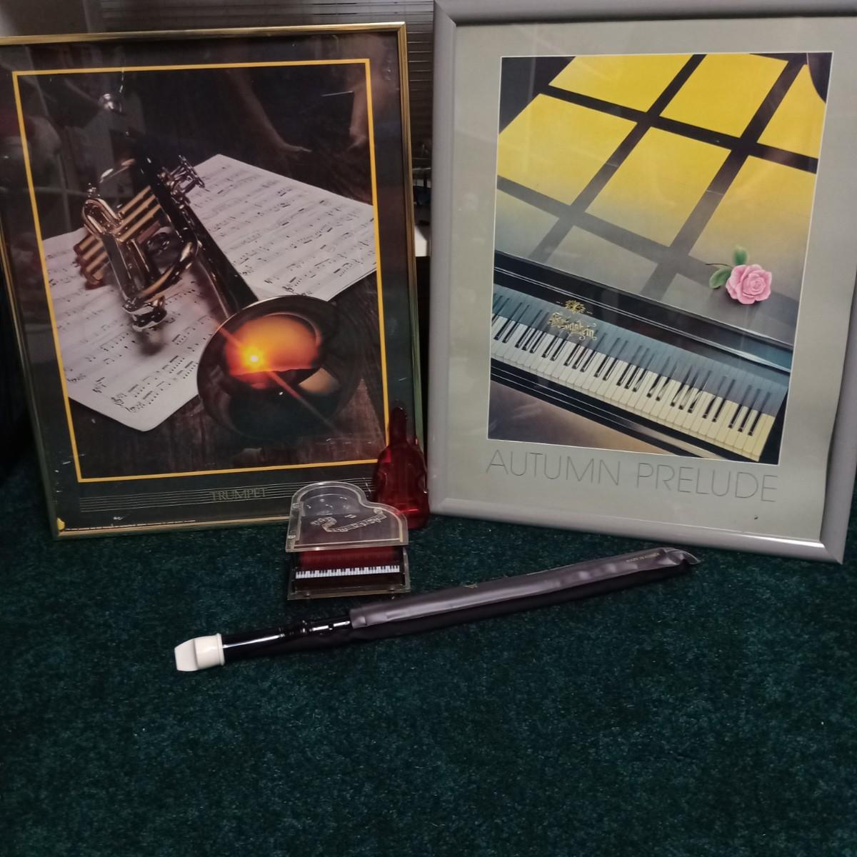 LOT 255B: Two Music Related Photos w/Frame, Piano Music Box, Recorder, and Vintage Small Glass Violin.