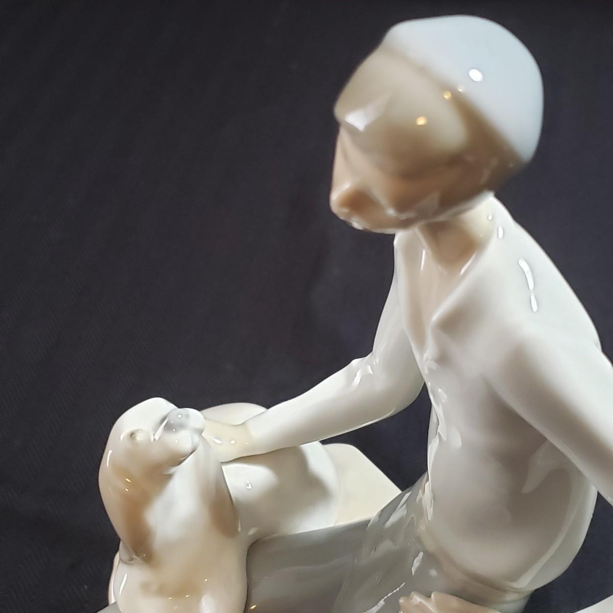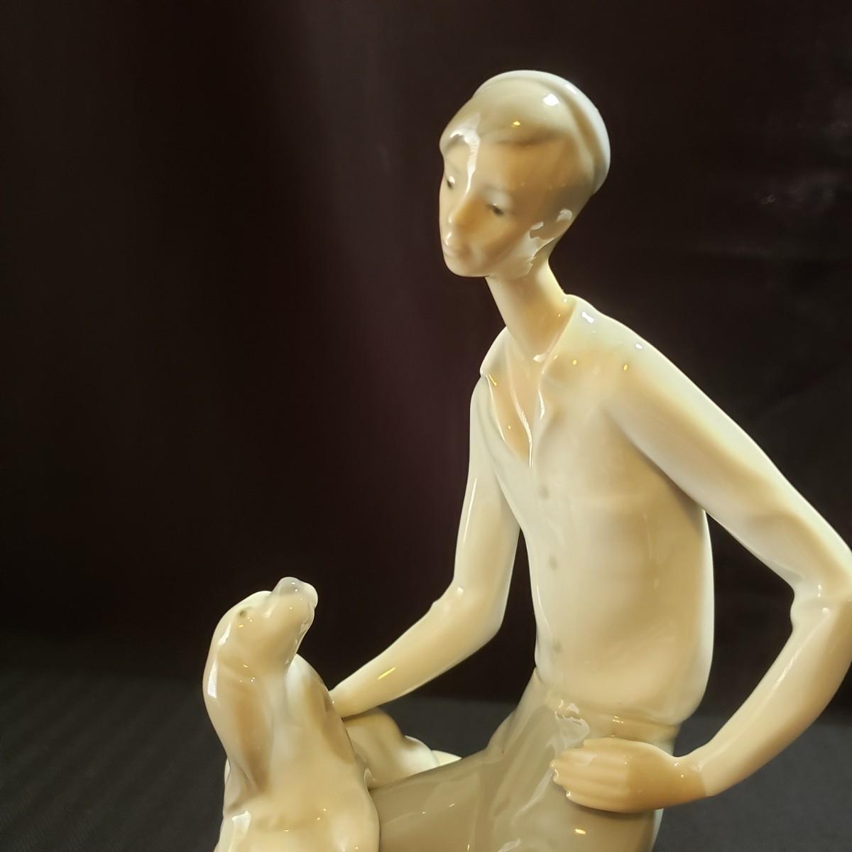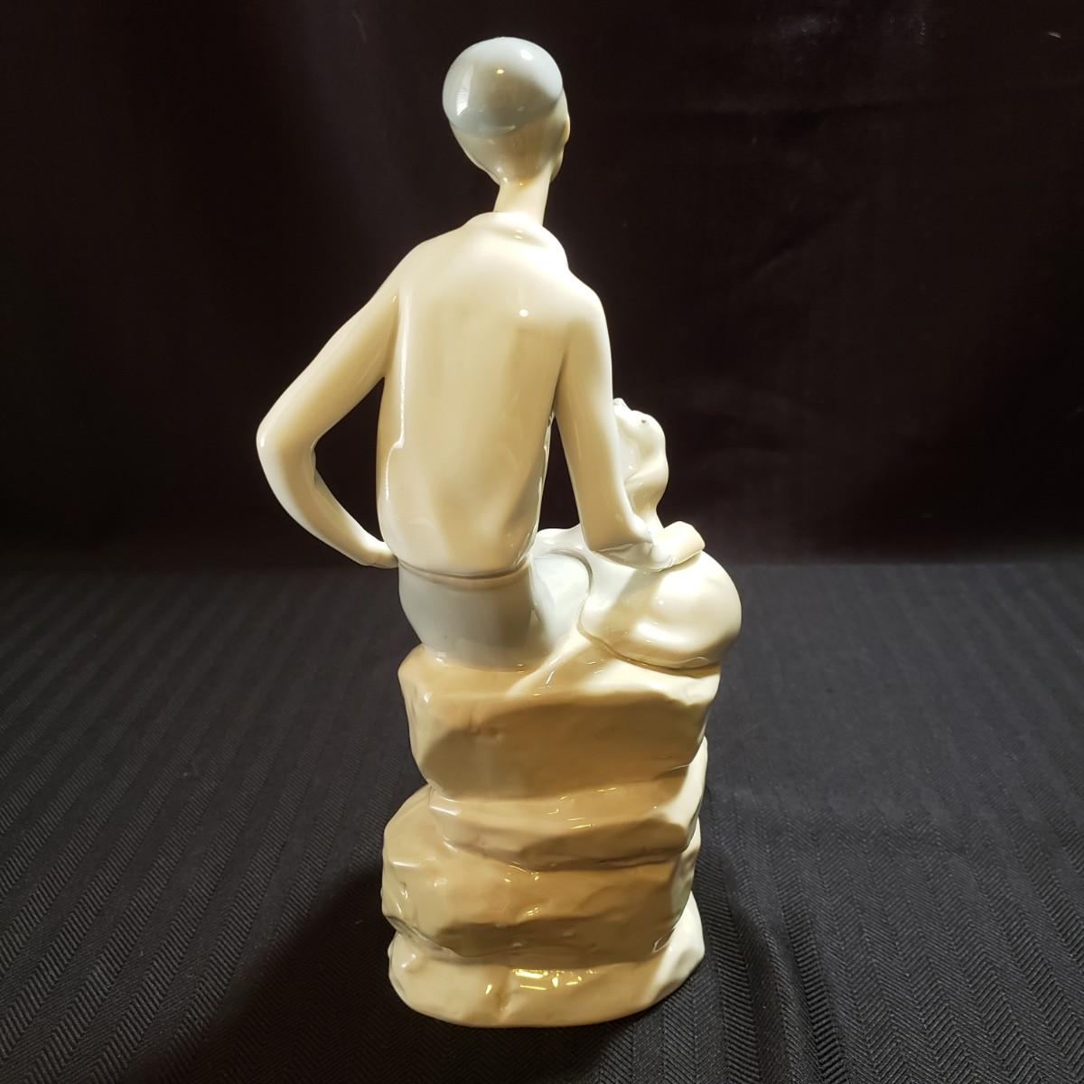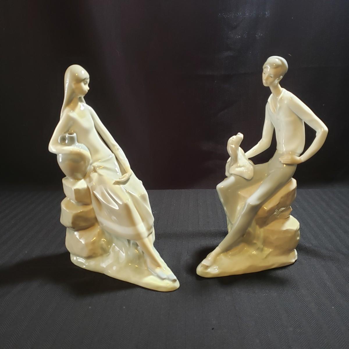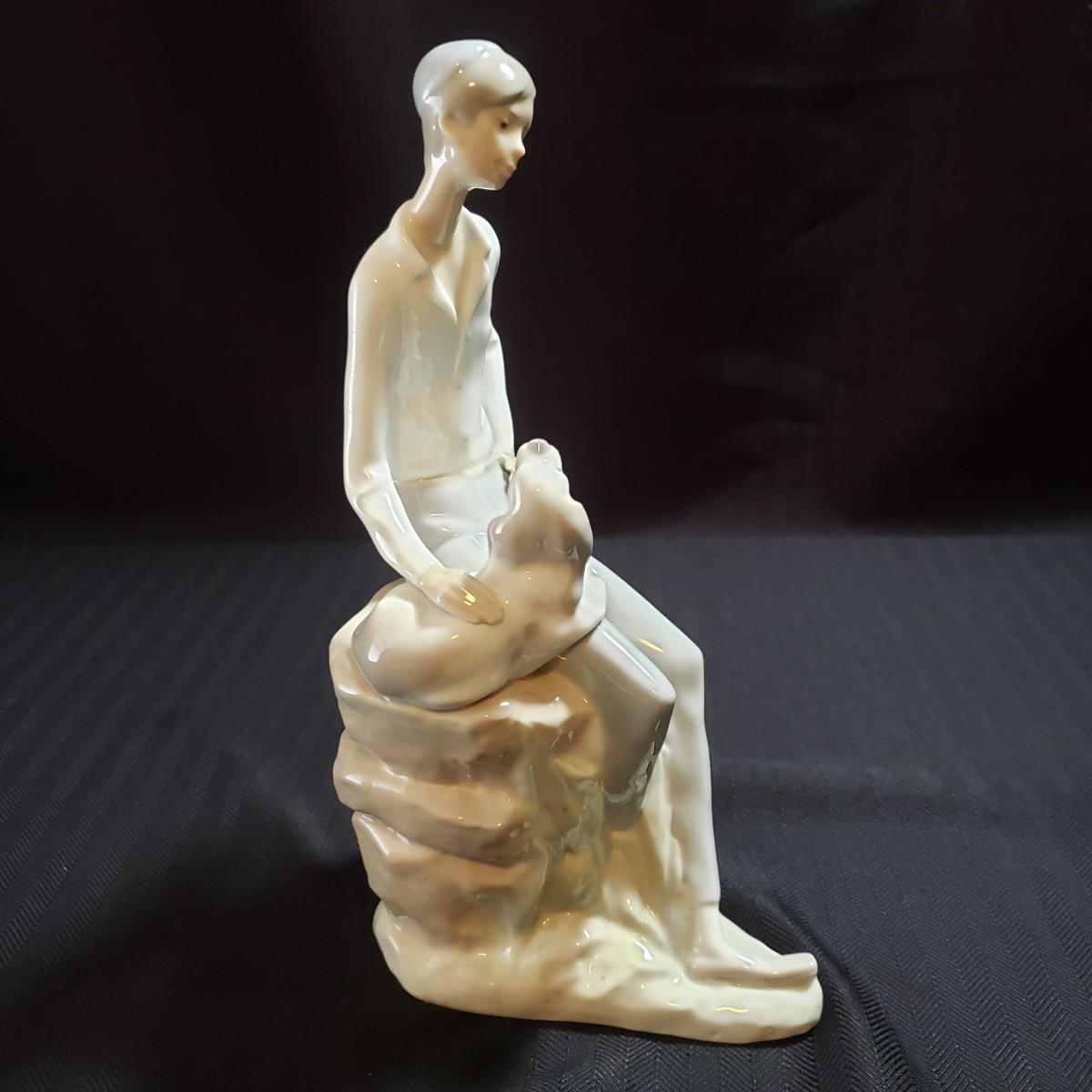 These are two Nao porcelain figurines made by Lladro. The "Jewish Boy Petting Dog" measures 6" x 4" x 10"H. The other figurine is "Girl Sitting on Rocks With Jug". The colors in both are a soft grey, white and a soft tan color. Both pieces appear to be blemish free.