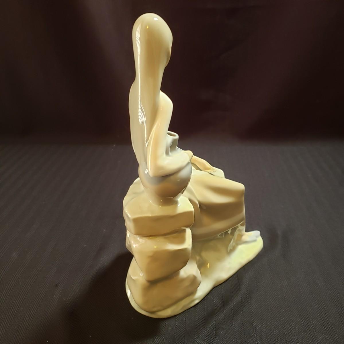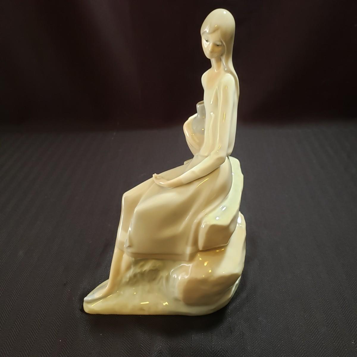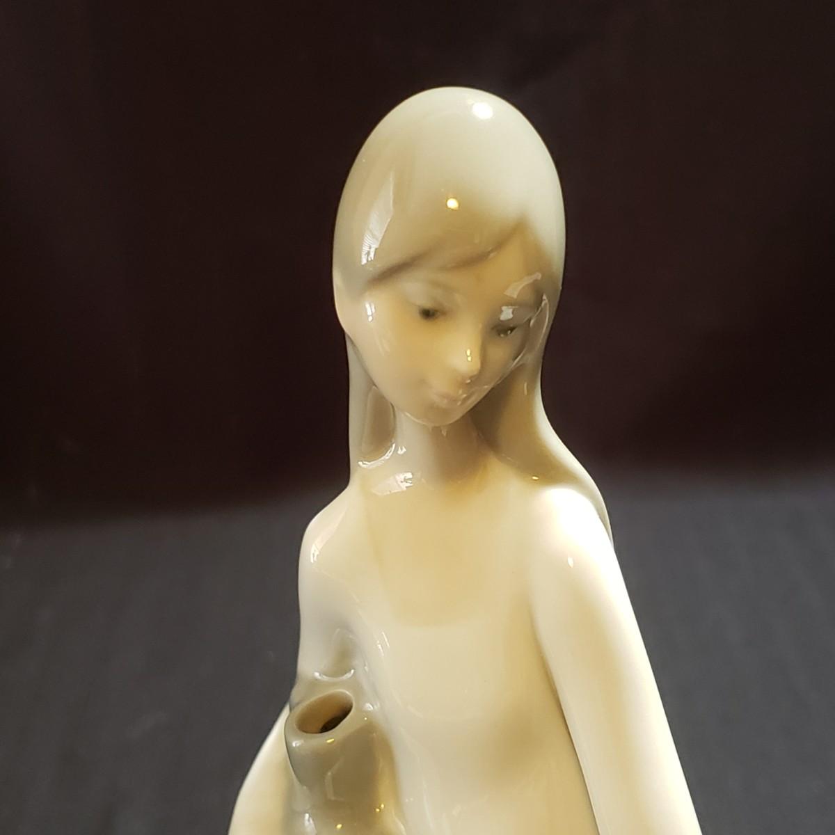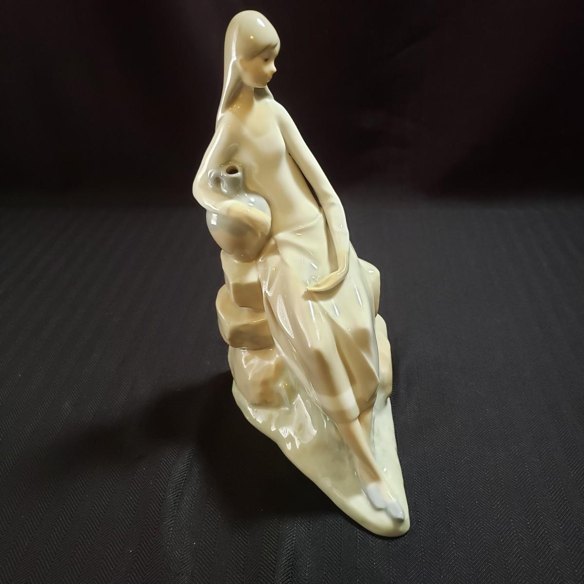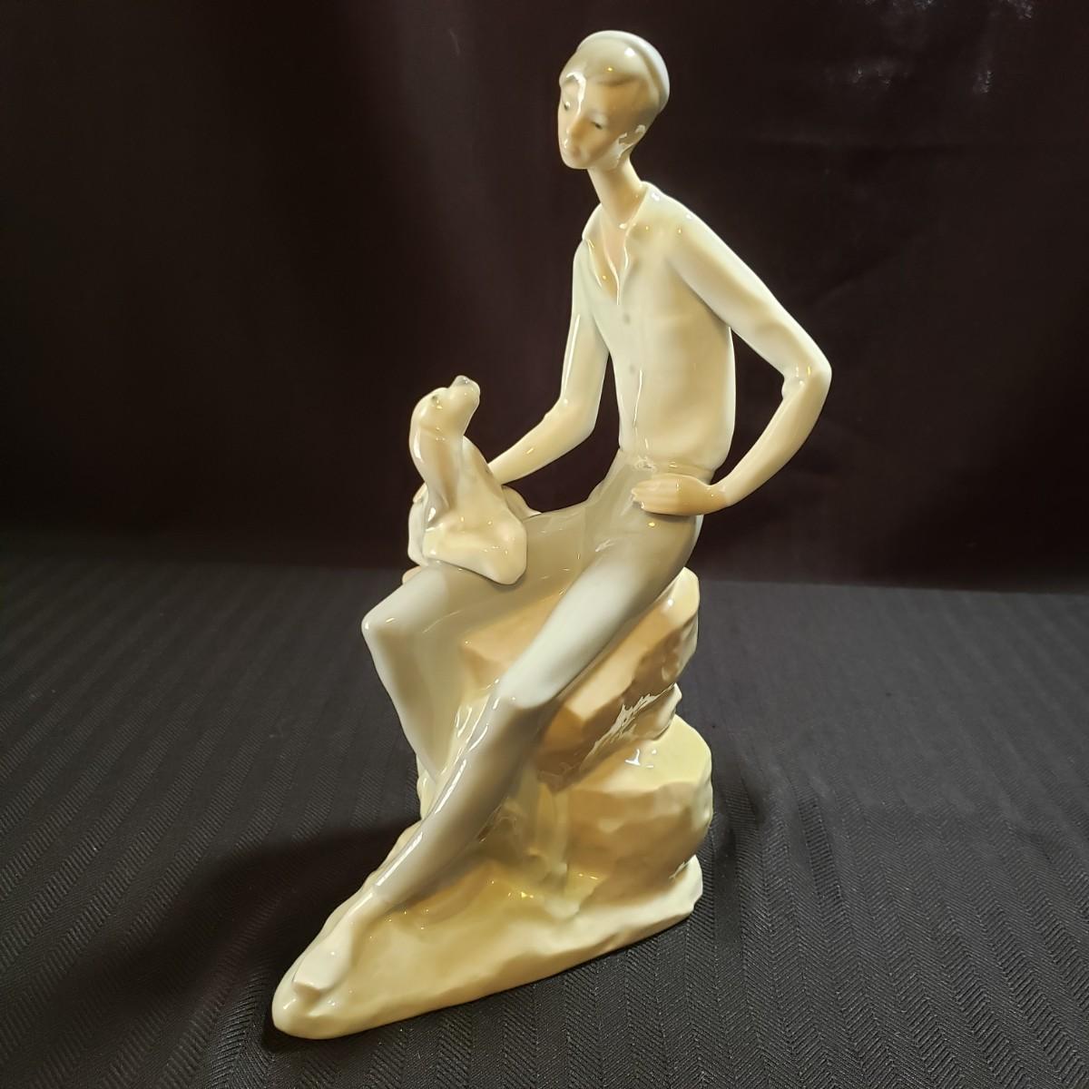 These are two Nao porcelain figurines made by Lladro. The "Jewish Boy Petting Dog" measures 6" x 4" x 10"H. The other figurine is "Girl Sitting on Rocks With Jug". The colors in both are a soft grey, white and a soft tan color. Both pieces appear to be blemish free.