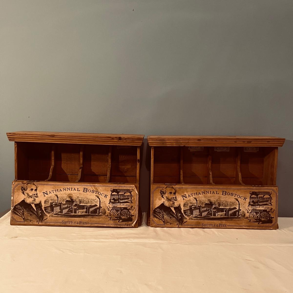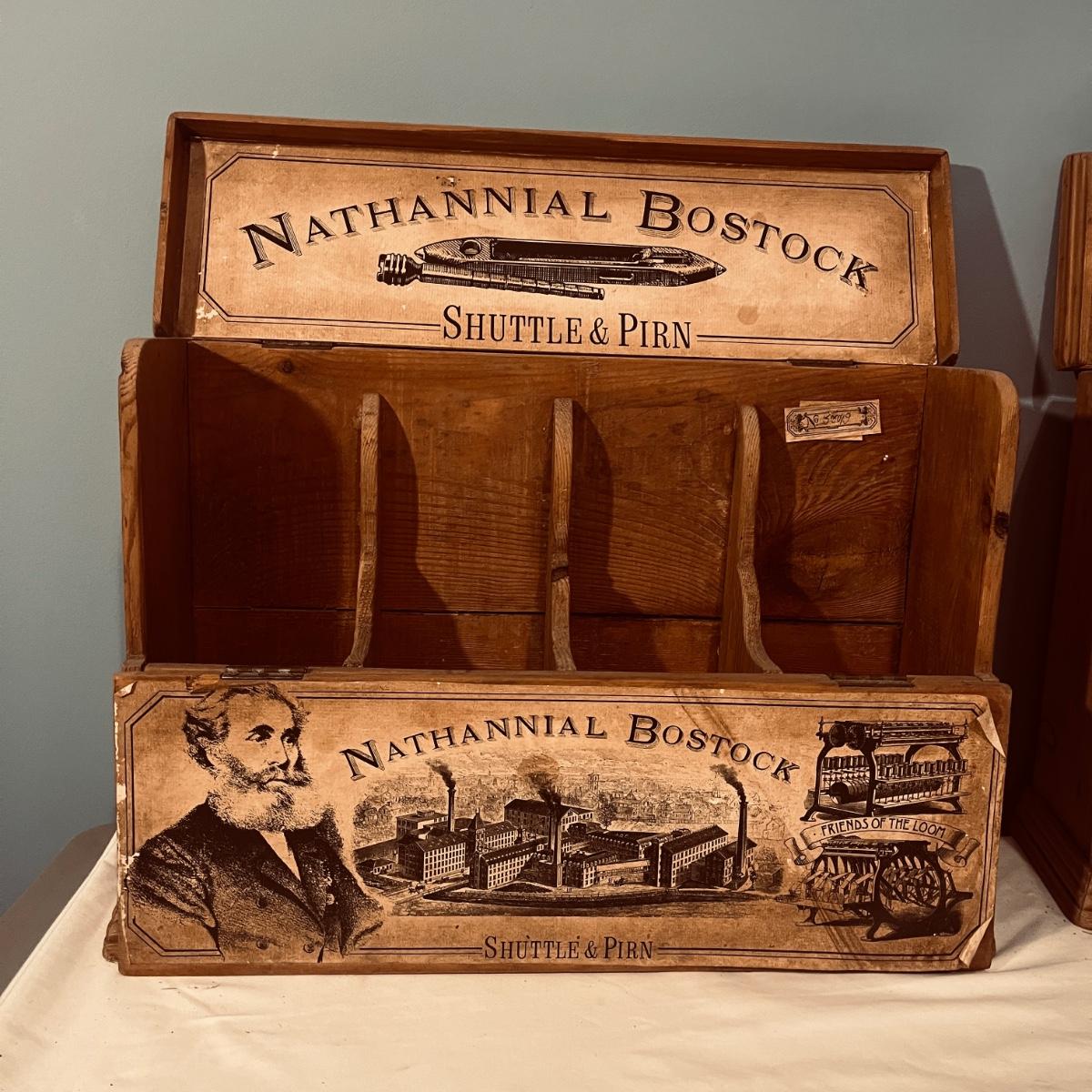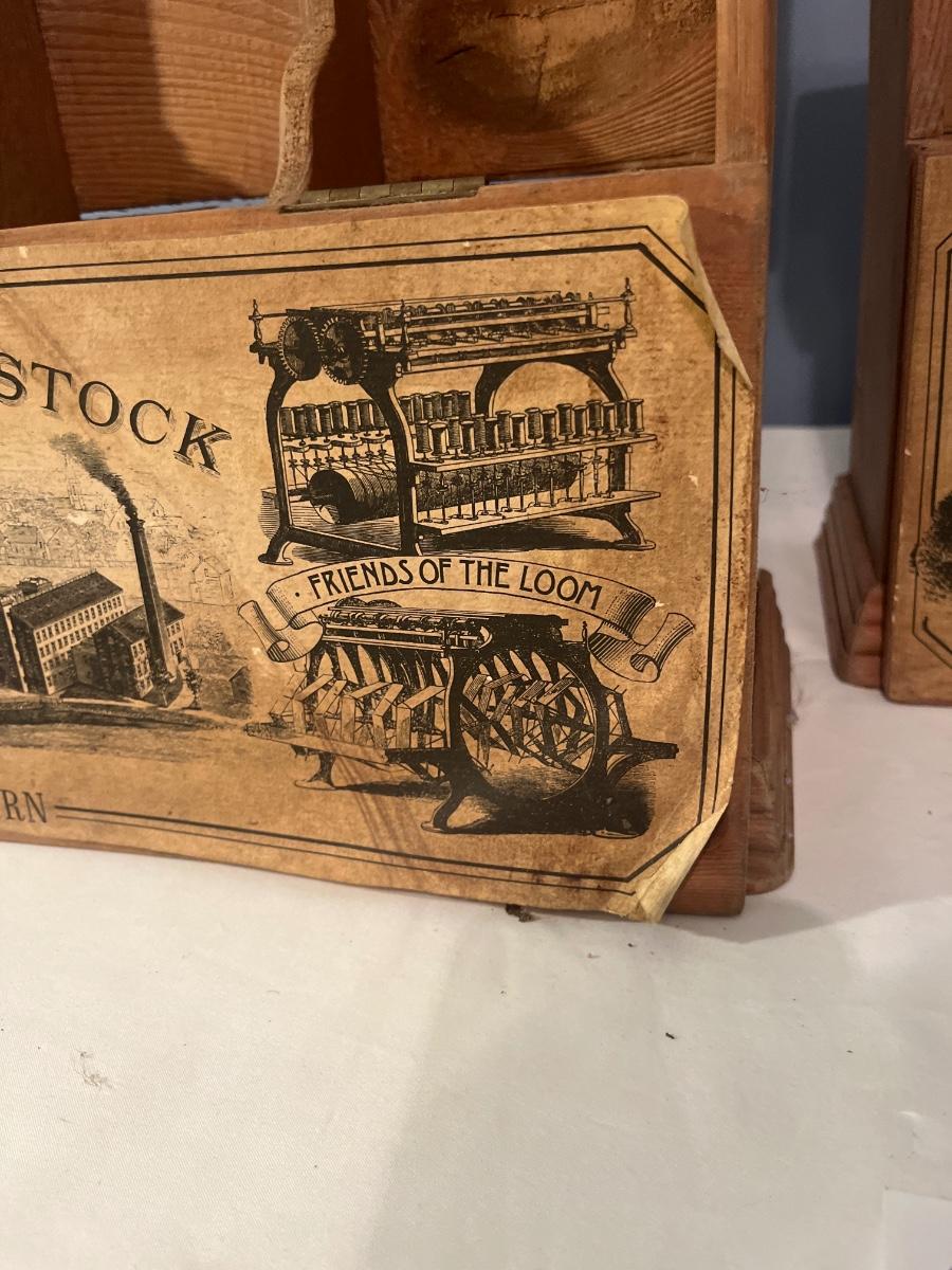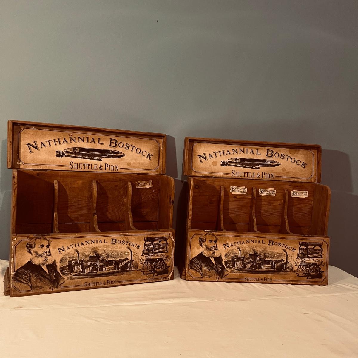 Two Nathannial Bostock shuttle and pirn wooden boxes. Boxes measure 5.5” x 18.5” 13”H. One of the boxes has the paper coming loose, see pictures.