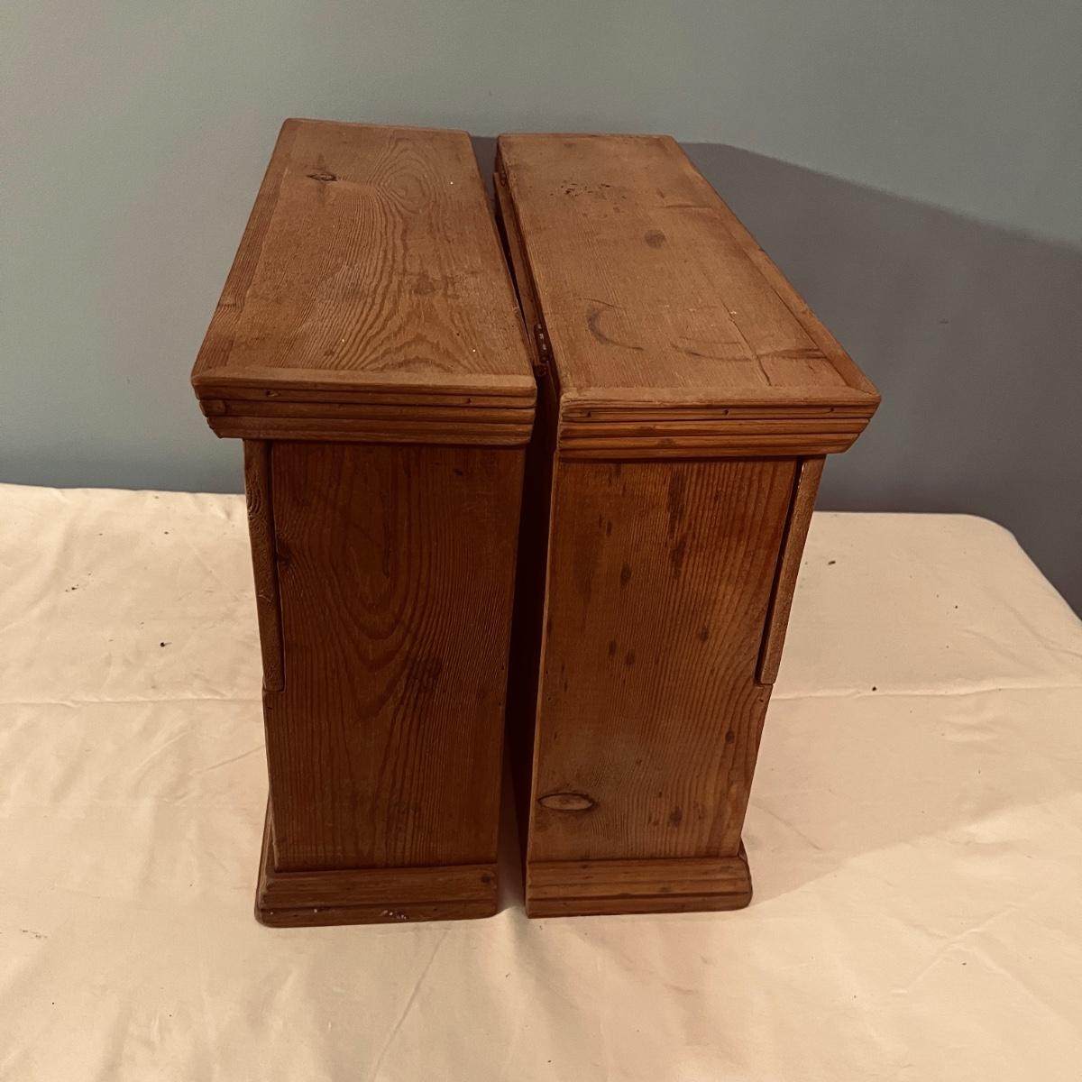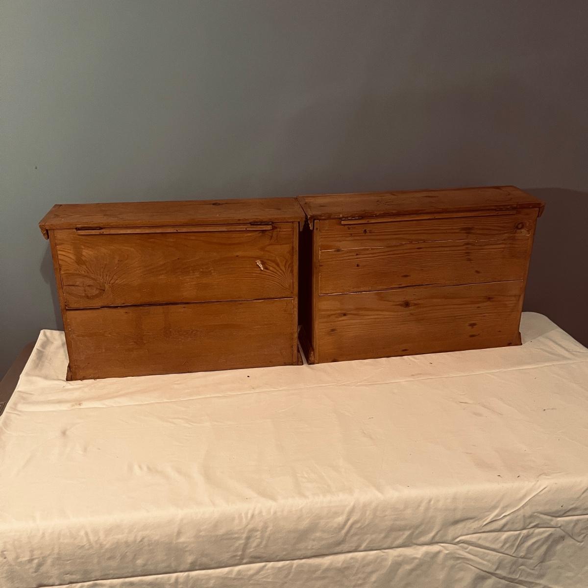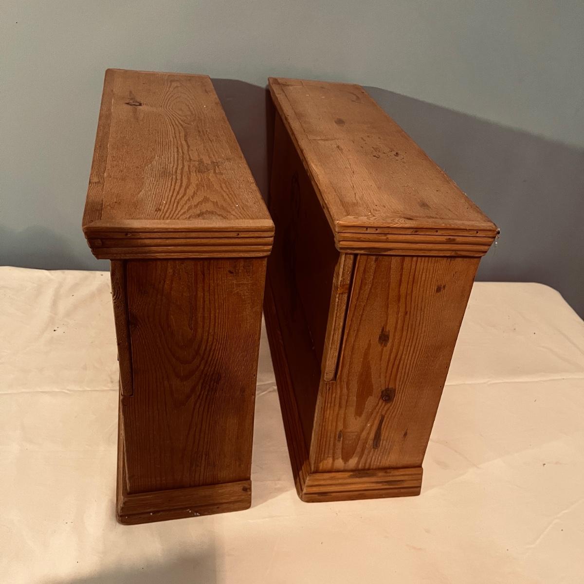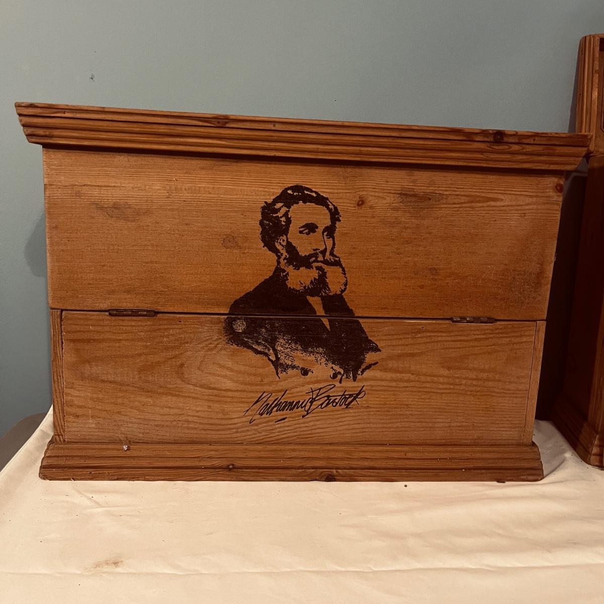 Two Nathannial Bostock shuttle and pirn wooden boxes. Boxes measure 5.5” x 18.5” 13”H. One of the boxes has the paper coming loose, see pictures.