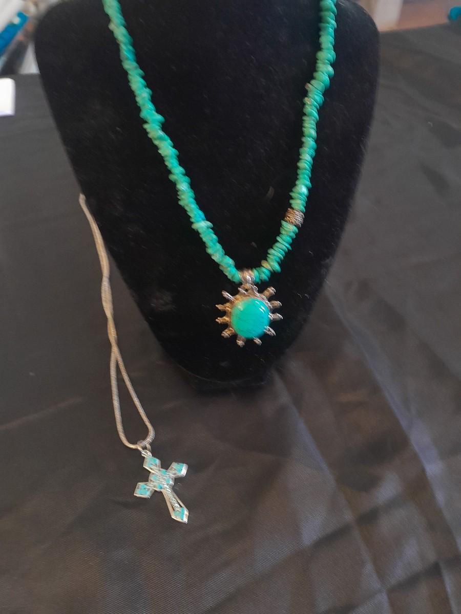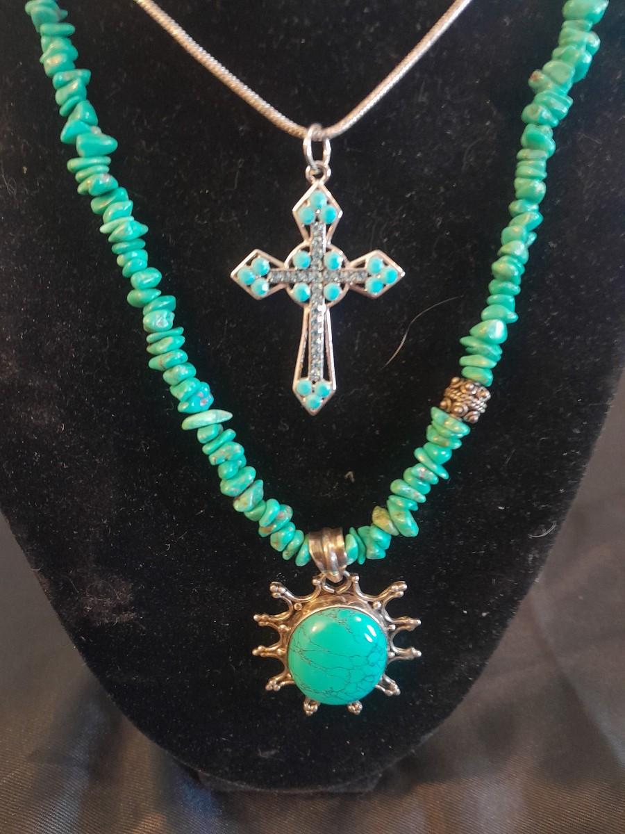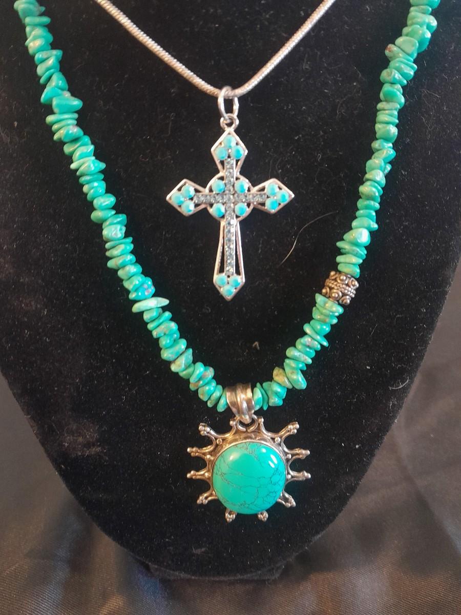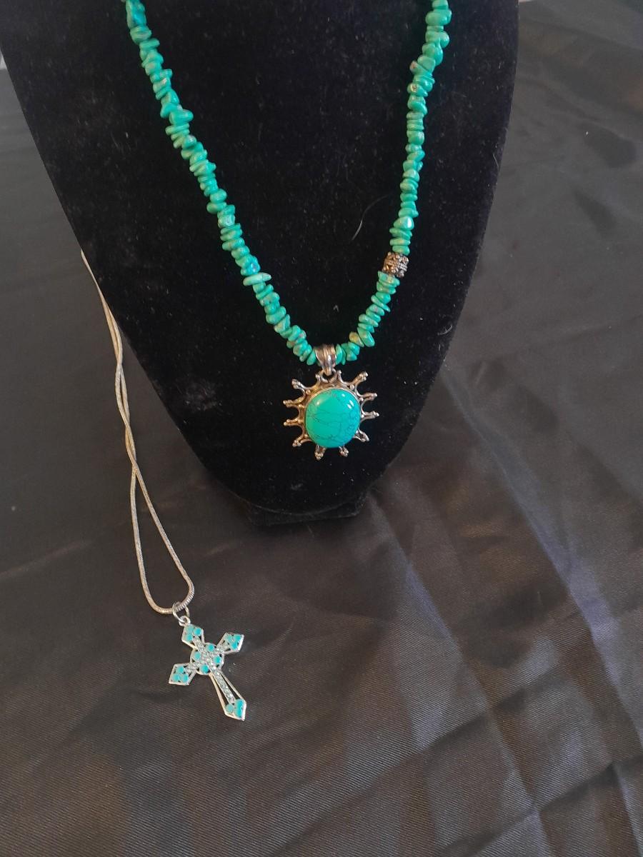 TWO NECKLACES TURQUOISE AND BLING CROSS