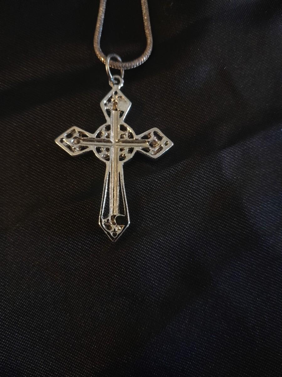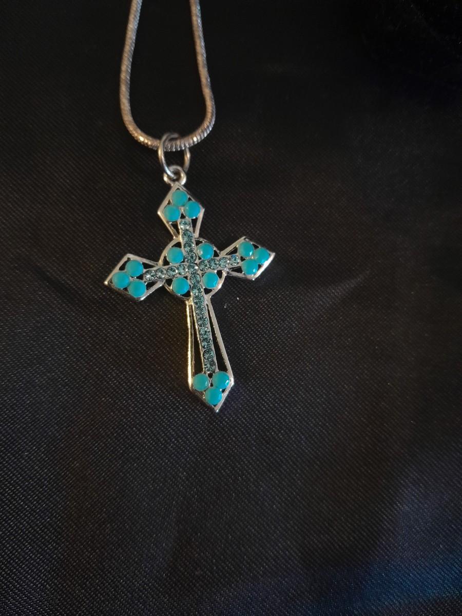 TWO NECKLACES TURQUOISE LIKE PENDANT AND A BLING CROSS WITH BLUE STONES