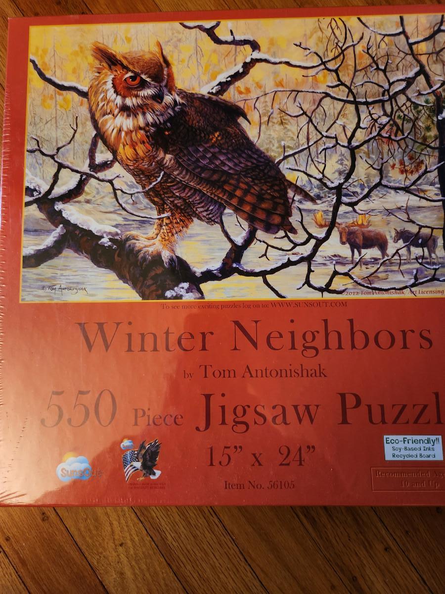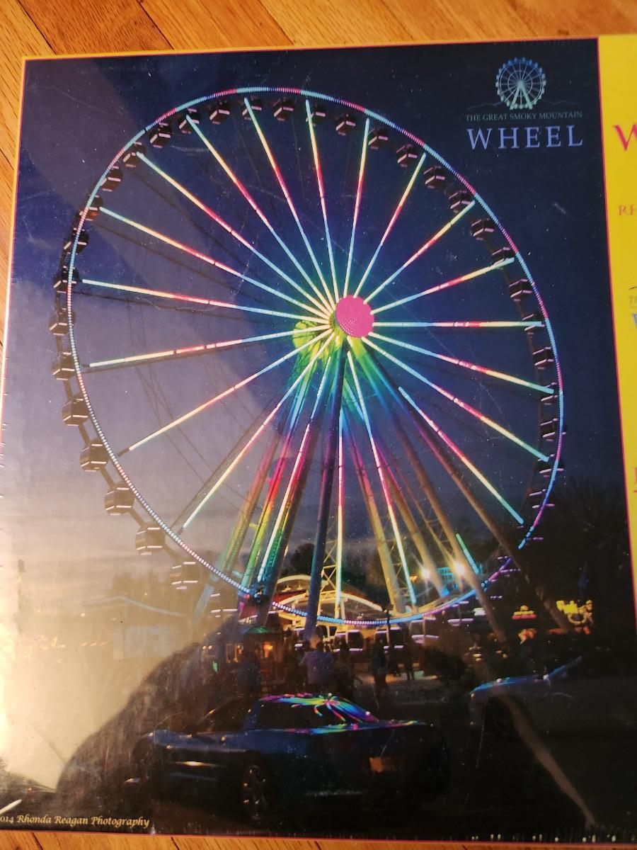 This lot is for Two New Puzzles. One shows The Great Smoky Mountain Wheel and has a finished size of about 18X24-inches with 500 pieces. The other is titled Winter Neighbors and shows wildlife, with a finished size of about 15X24-inches with 550 pieces. Both are constructed with recycled board and sport soy-based inks. Both are seal-wrapped and in as-new condition.