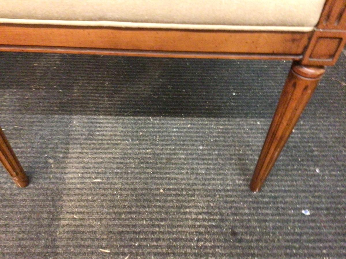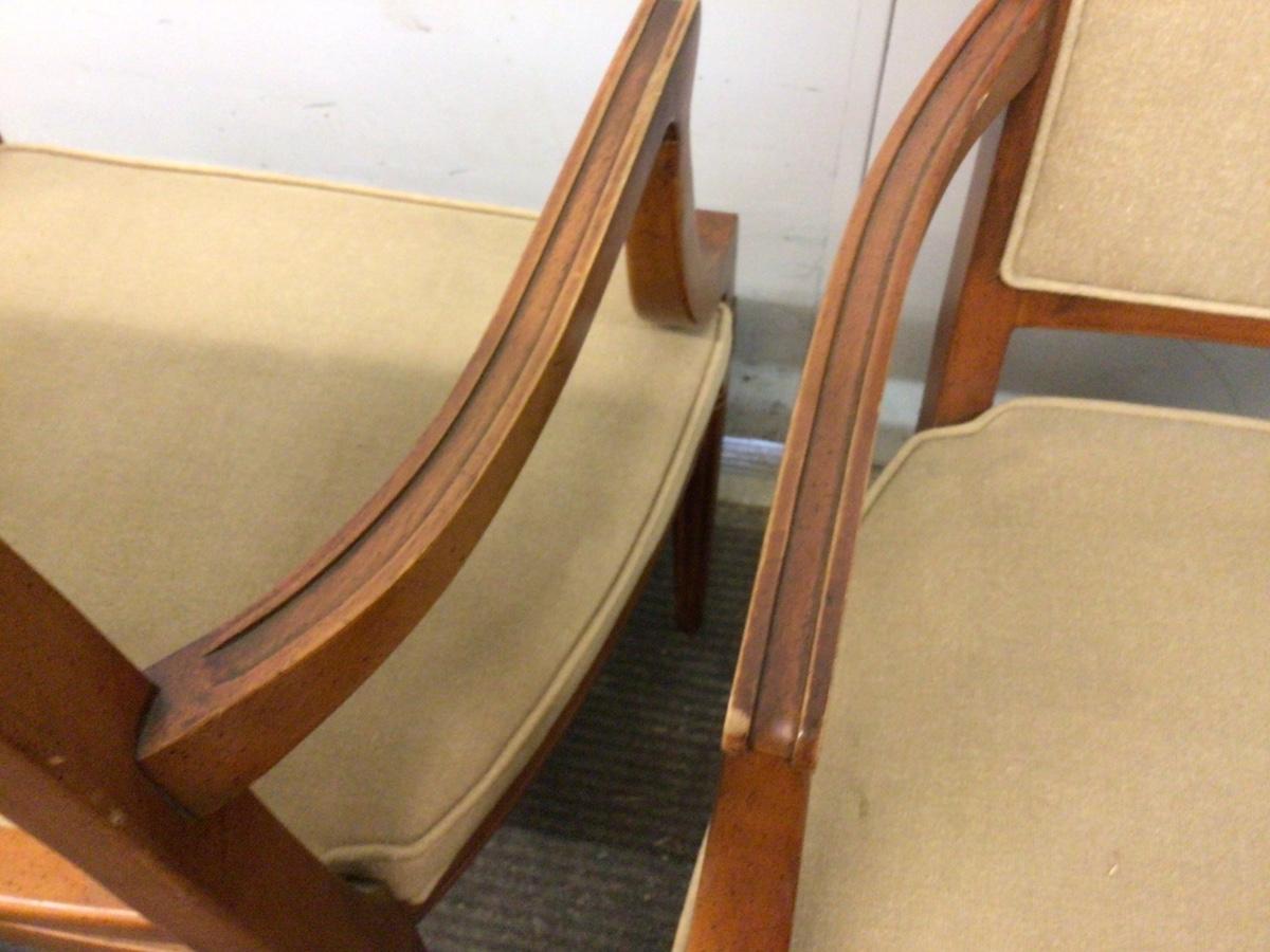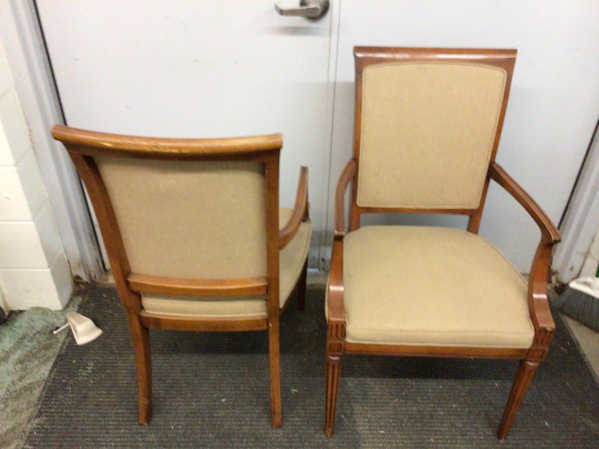 This is a great set of two wood and cloth armed chairs. Nice carving and fabric is in good condition.